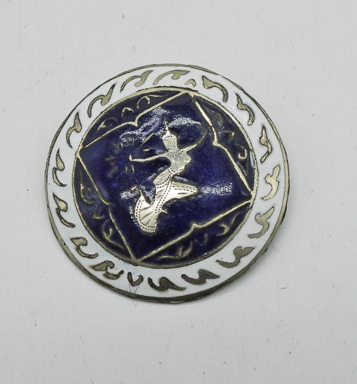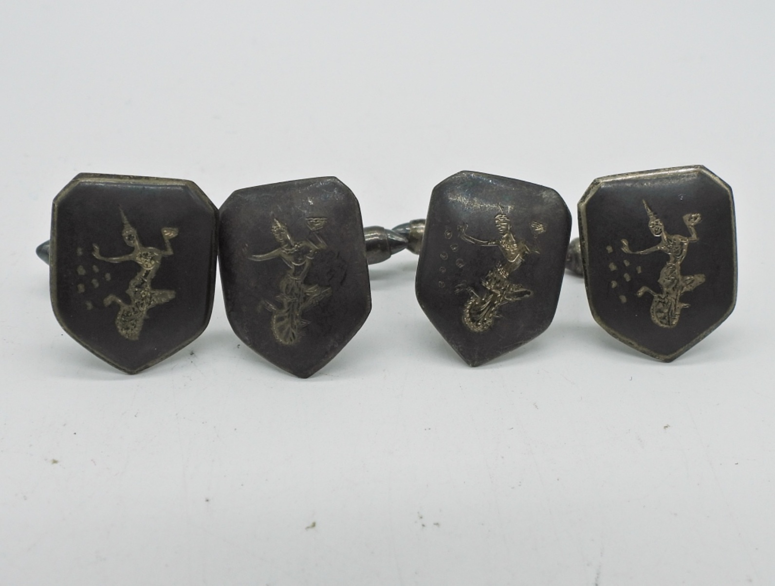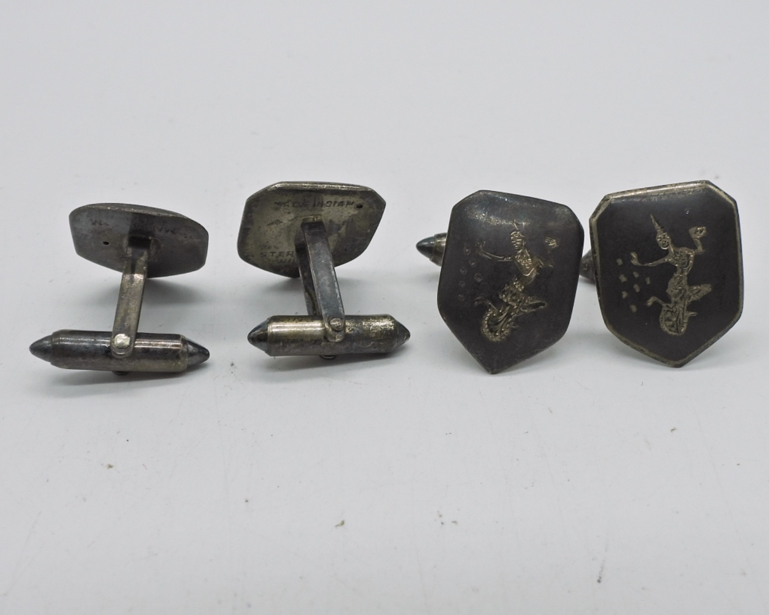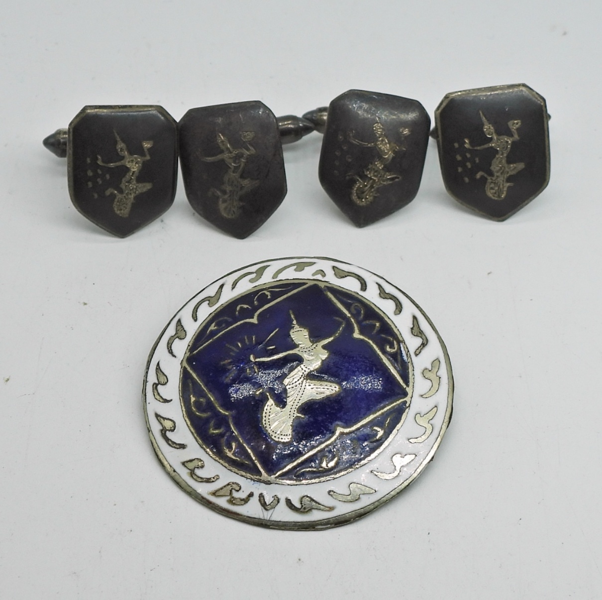Four Siam Sterling Silver Cuff Links. One Siam Sterling Silver Brooch with Blue and White Enamel, 1.5″. 17.4 DWT