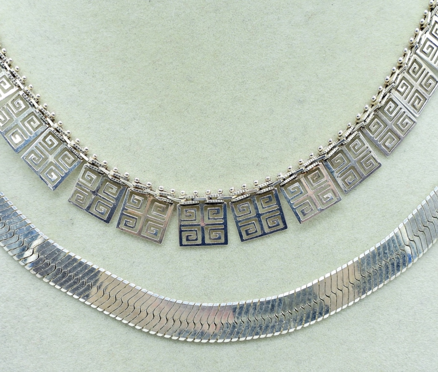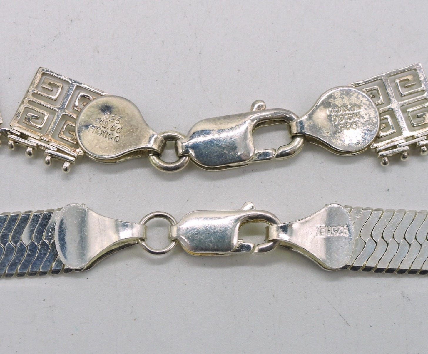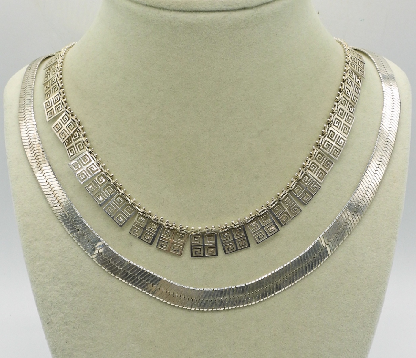 Sterling 19.5″ Herringbone Chain, 1cm Wide. Greek Key Necklace, Marked “925 M.S. 66 Mexico”. 17″. 30.8 DWT