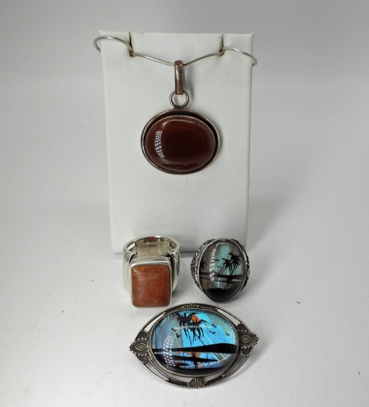 STERLING PAINTED BUTTERFLY WING PENDANT AND RING (SIZE 6). CARNELIAN PENDANT ON A 24″ STERLING CHAIN. ORANGE GEMSTONE STERLING RING SIZE 7. 29.5 DWT