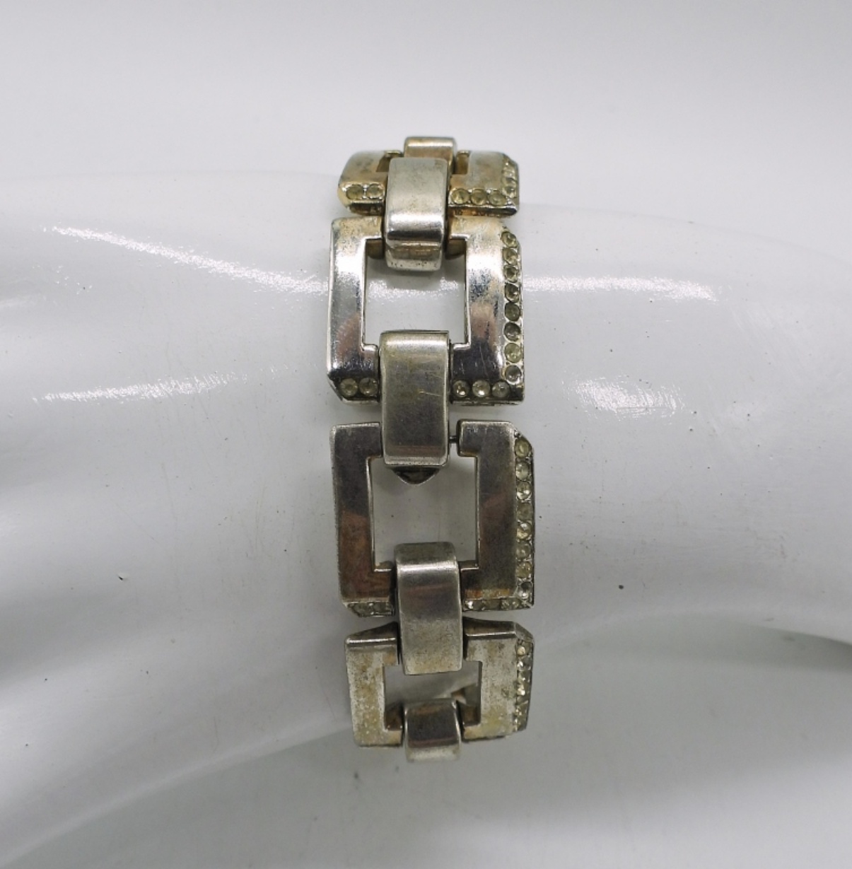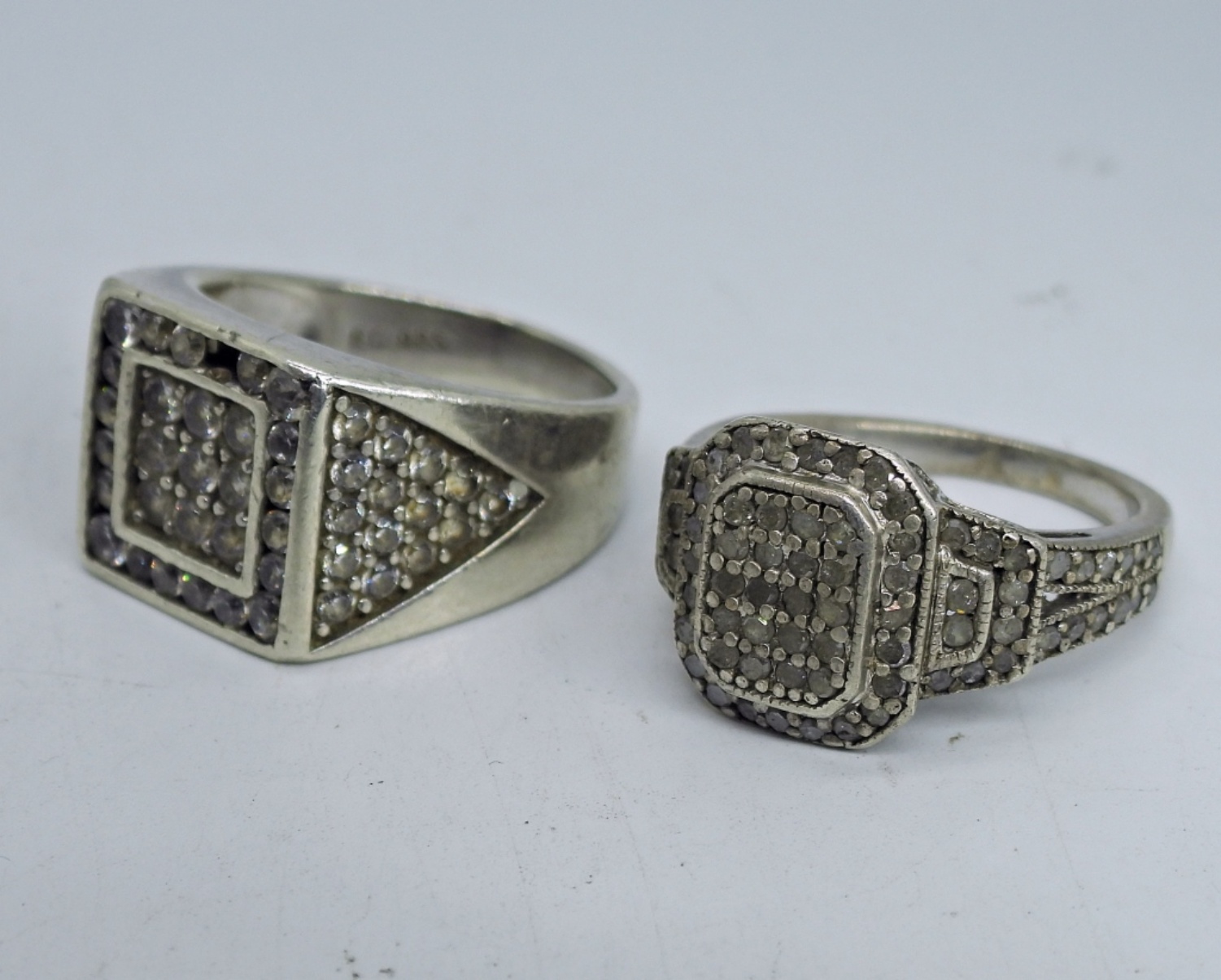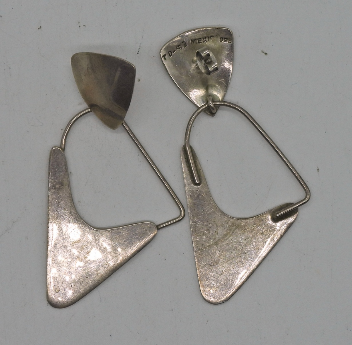 GEOMETRIC “MEXICO 925″ POST / DANGLING EARRINGS 3″ LONG. STERLING BRACELET WITH CLEAR GEMSTONES 7”. TWO STERLING RINGS CLEAR GEMSTONES, SIZES 6.5 & 9.5. 60.1 DWT