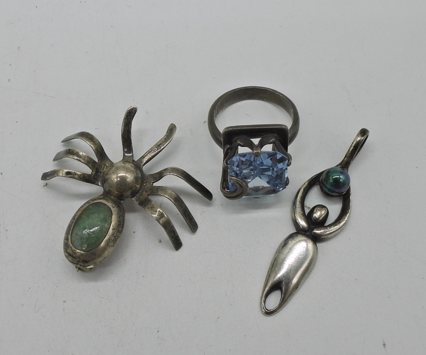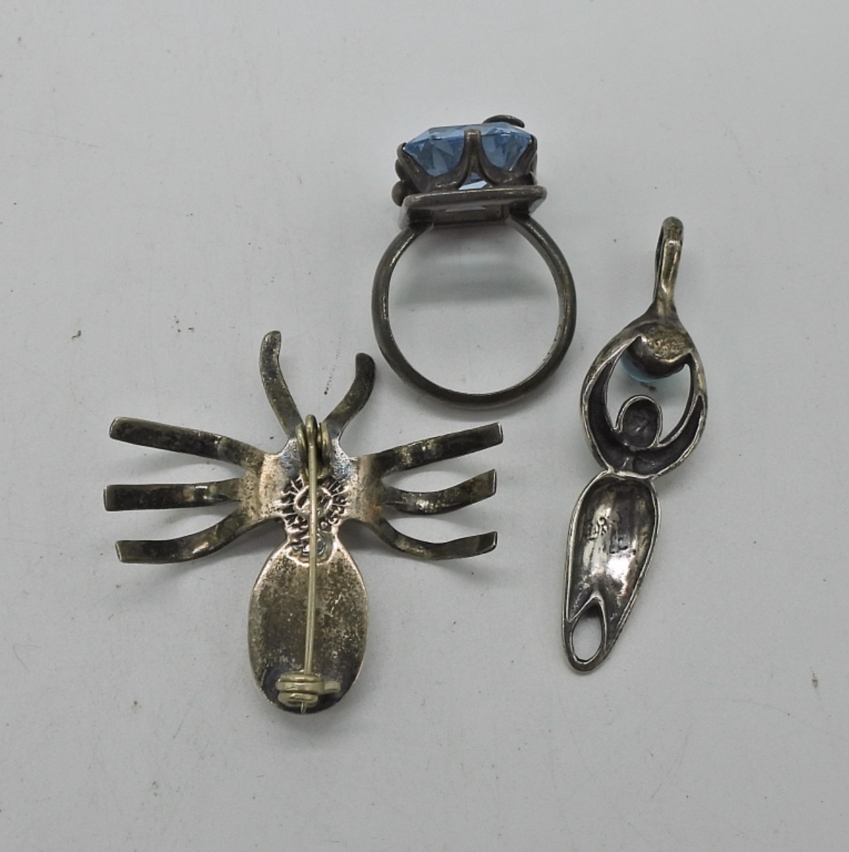 BLUE GEMSTONE STERLING RING SIZE 6.5, GODDESS PENDANT, SPIDER PIN WITH GEMSTONE. 10.5 DWT