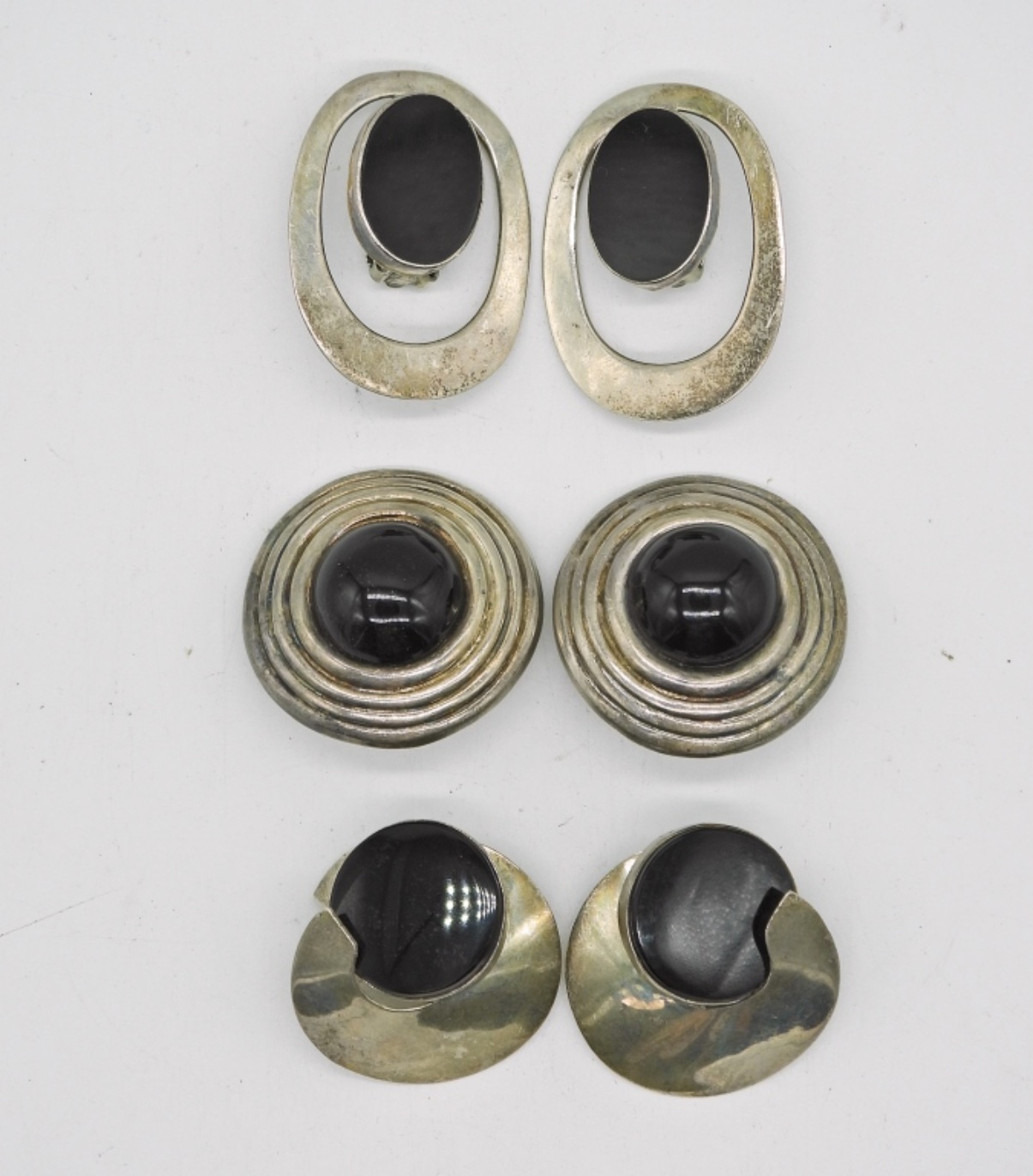 3 PAIR OF VINTAGE STERLING BLACK ONYX EARRINGS. CLIP ONS. MEXICO 925. 44.6 DWT