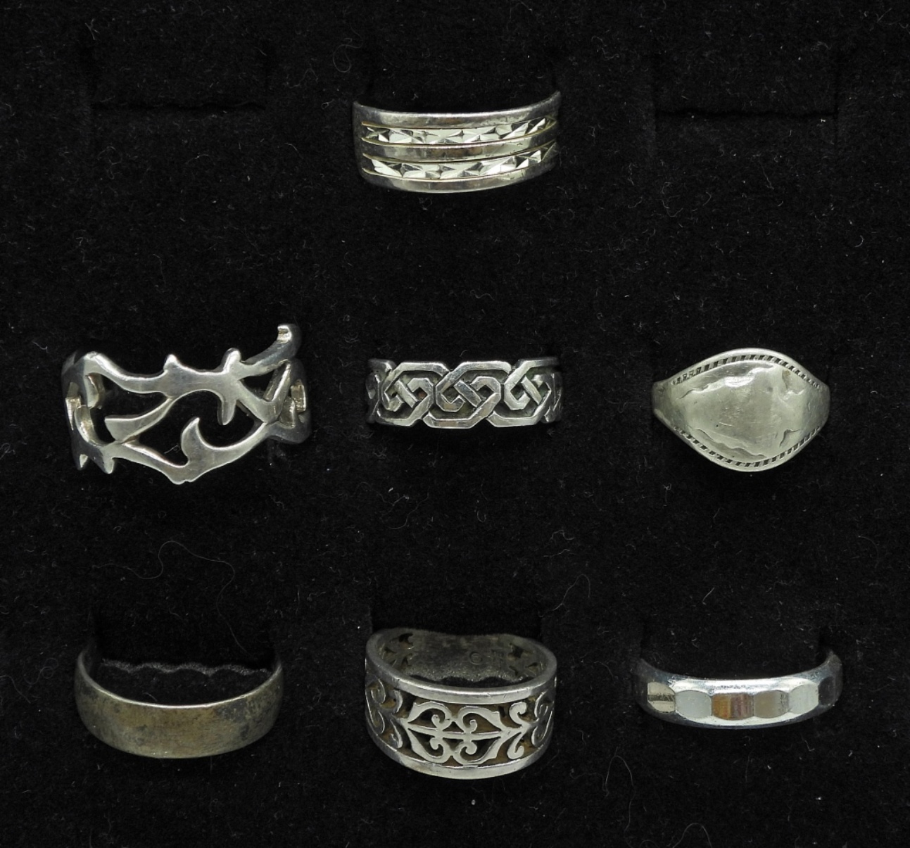 SIX STERLING RING BANDS IN VARIOUS DESIGNS. ONE IS MISHAPEN. SIZES 12, 9, 8, 7, 6. 20 DWT