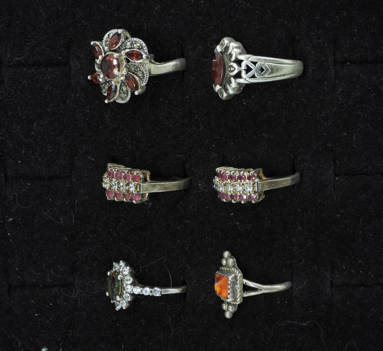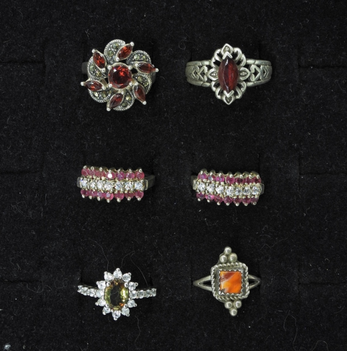 SIX STERLING RINGS WITH RED GEMSTONES. SIZES 8.5, 7,6.5,6. 15.6 DWT