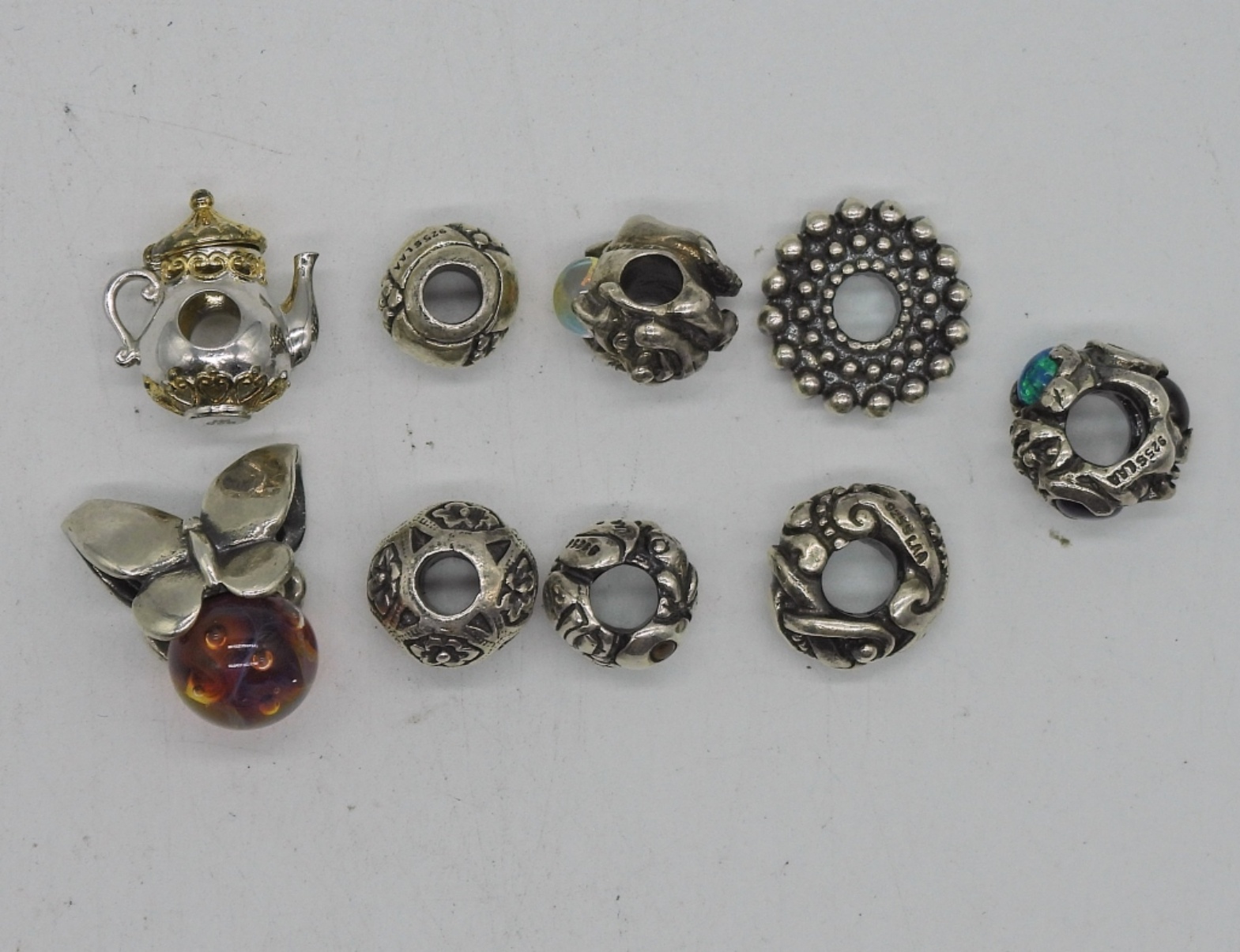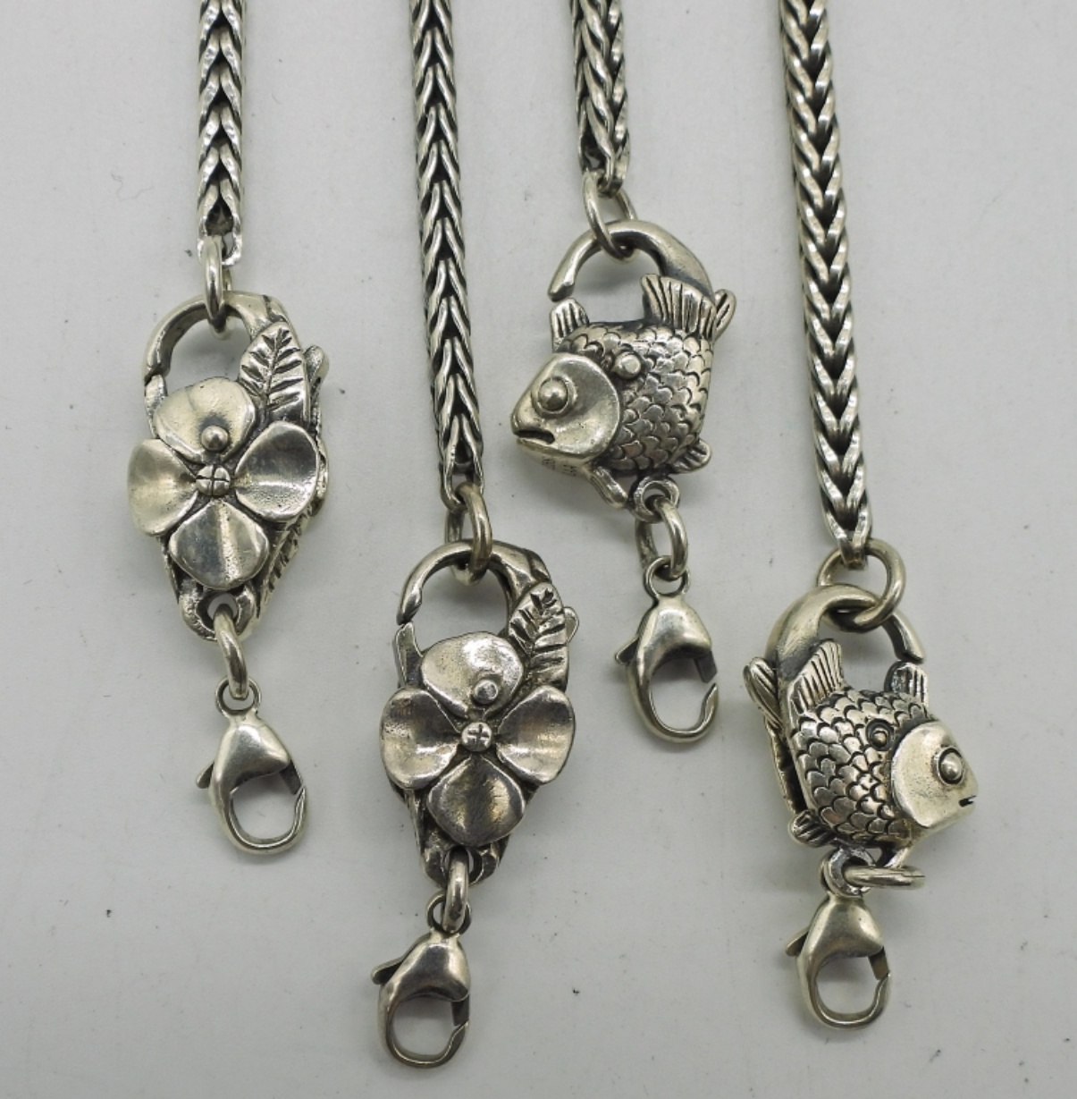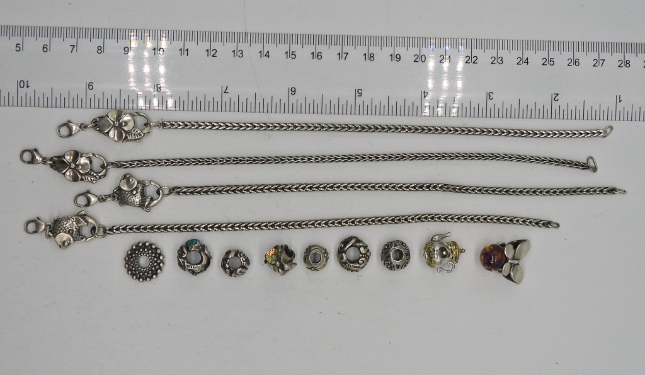 4 STERLING TROLL BEAD BRACELETS, 8″ LONG. 9 TROLL BEADS FOR THE BRACELETS. 61 DWT