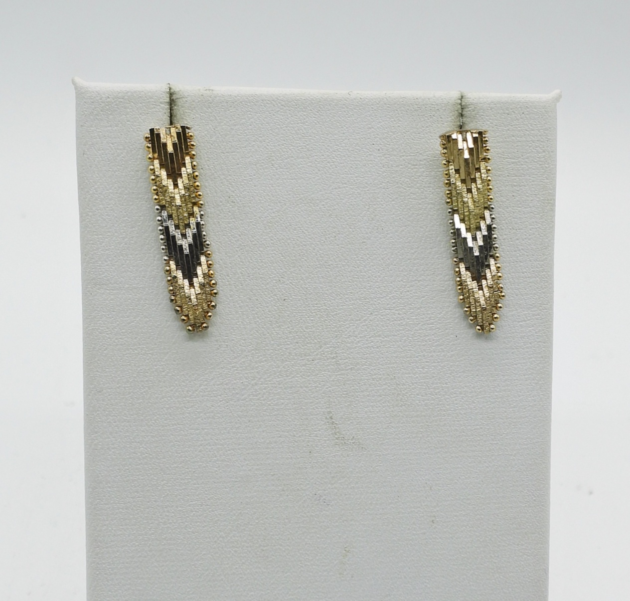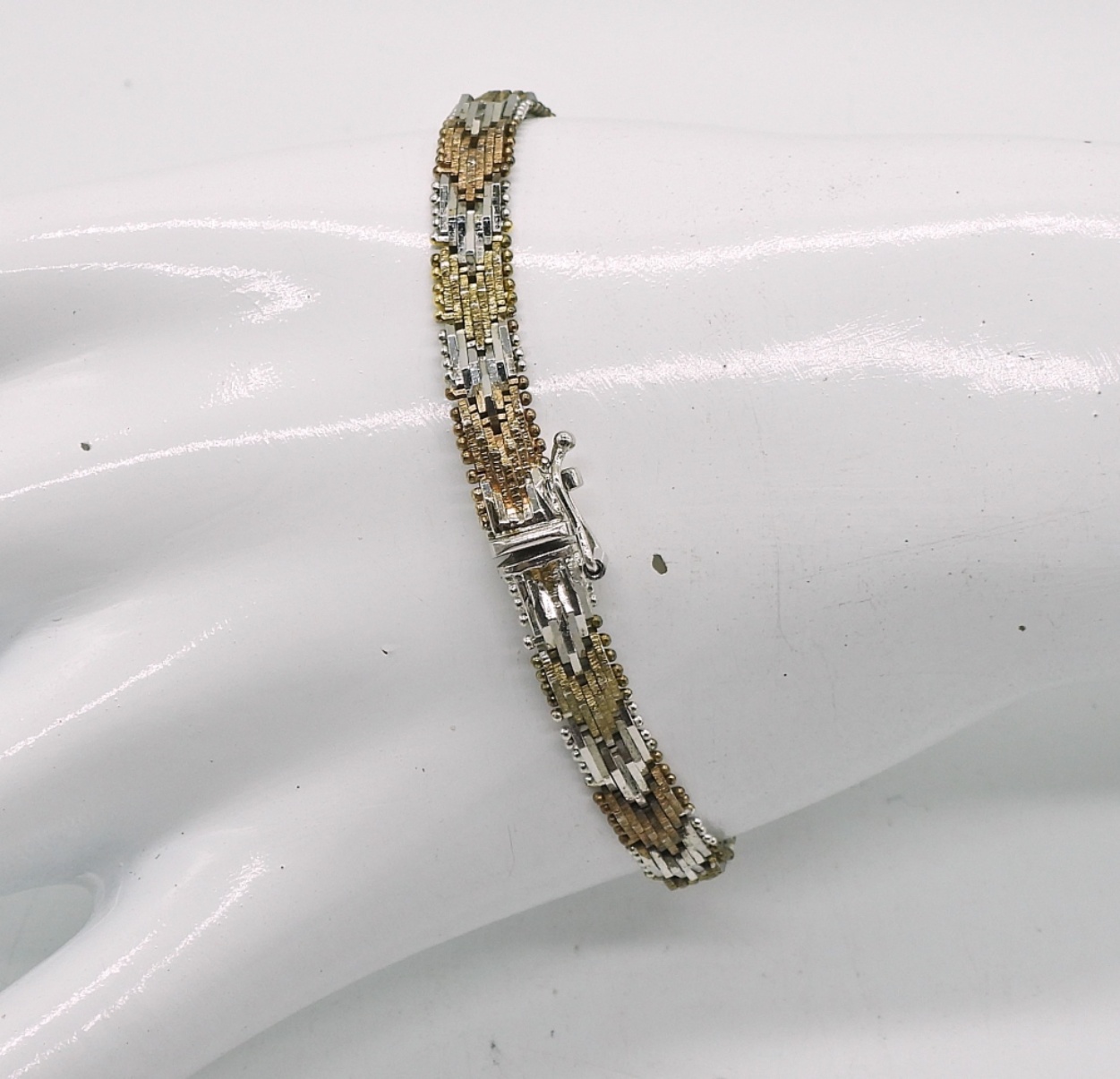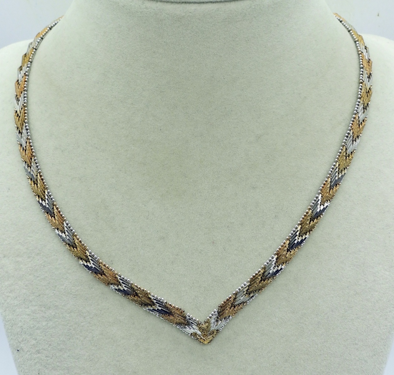 Stamped “925 Italy”, Chevron Necklace in Gold tone/ Rose Gold Tone & Silver 16″. Bracelet is 7″ and the Earrings are 1″ long. (31.4 DWT)
