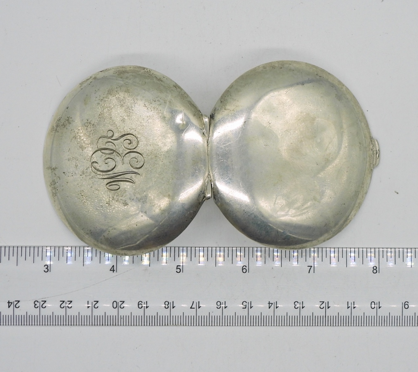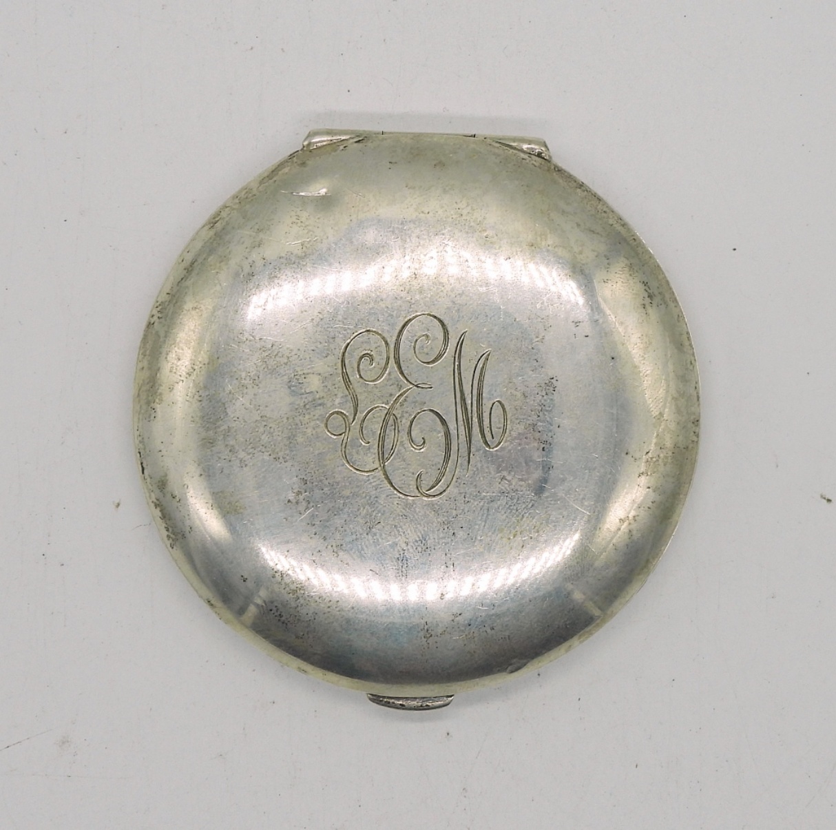 Vintage Sterling Silver Compact with engraved initials. 3″ Round. The inside is clean, no makeup residue. 53 DWT