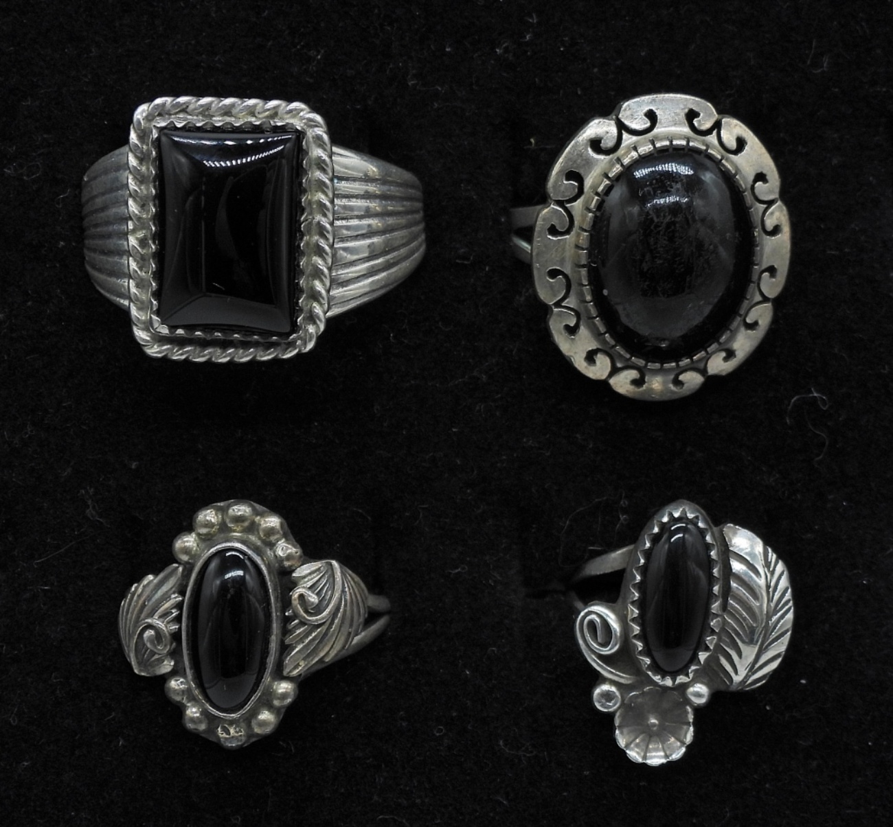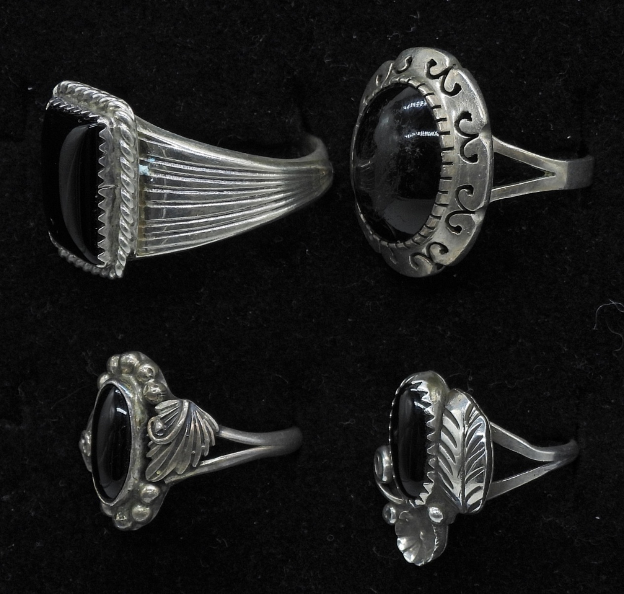 4 STERLING SILVER ONYX RINGS, SIZES 4, 7.5, 7.5, 12. 13.4 DWT