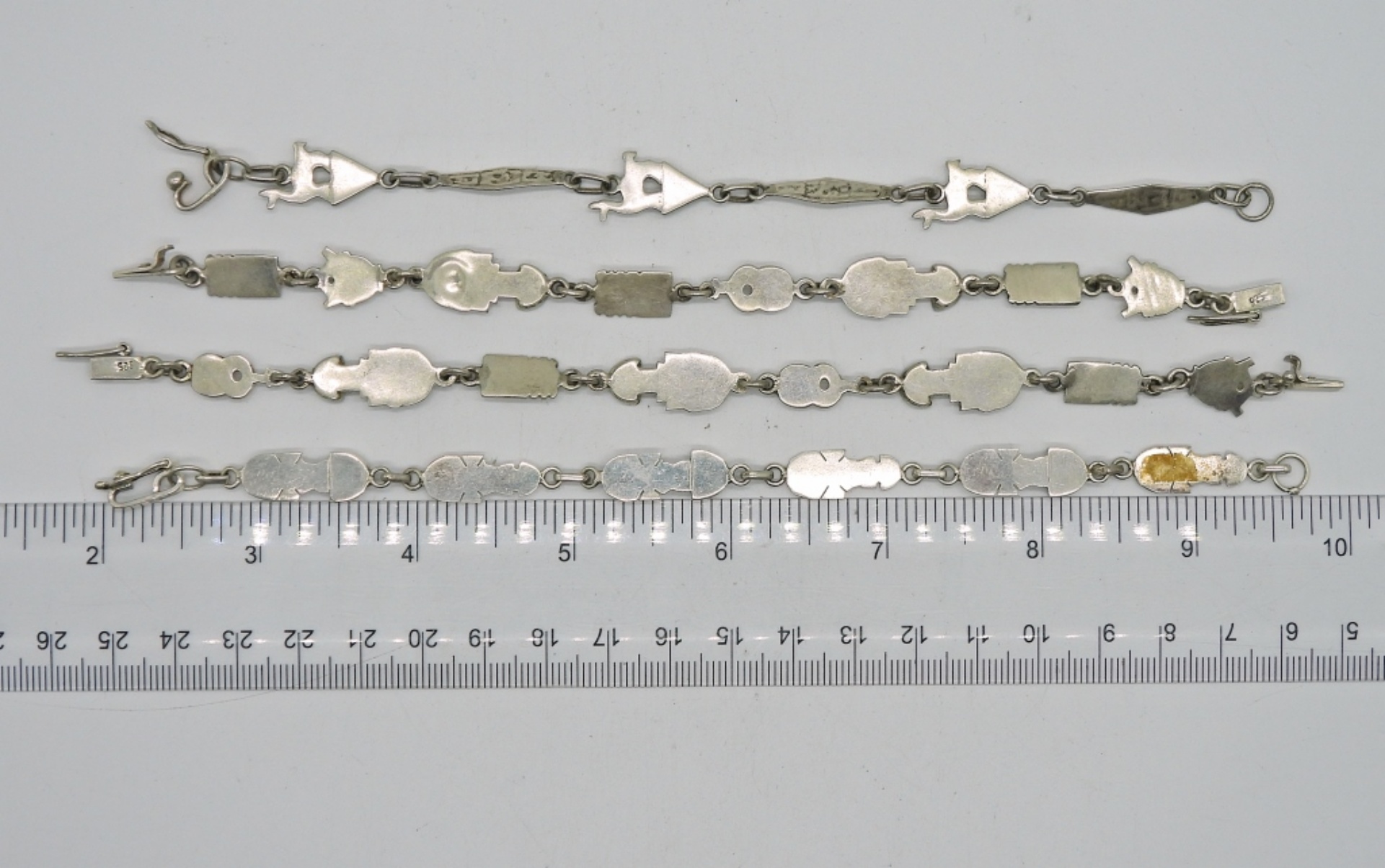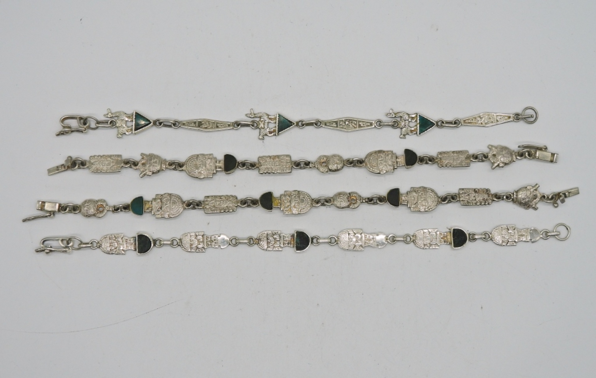 4 MAYAN STYLE STERLING BRACELETS WITH GREEN GEMSTONES. 8″. 26.4 DWT