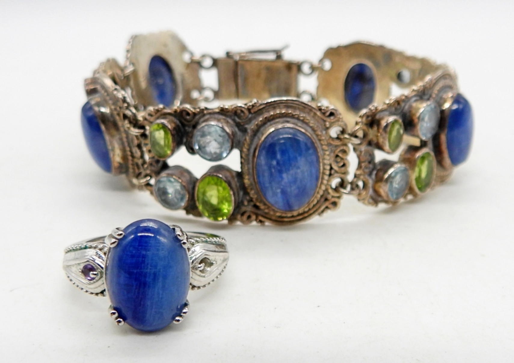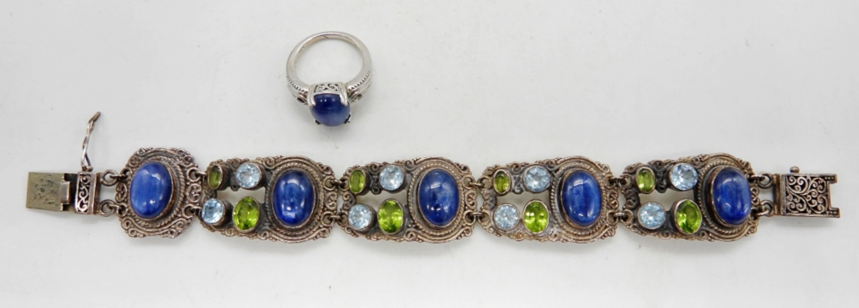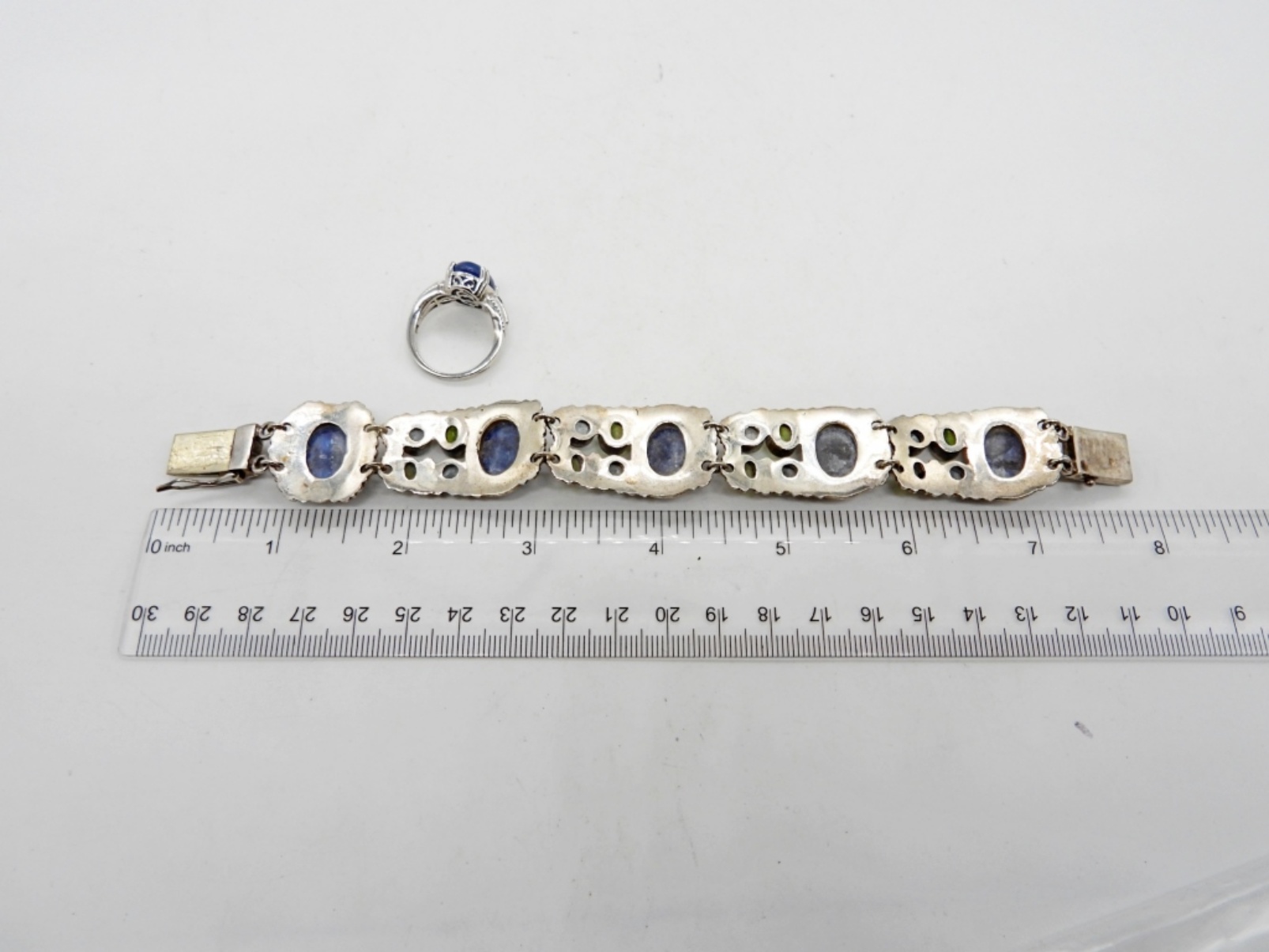 33DWT, BRACELET 8″ LONG WITH BOX CLASP, STAMPED 925, RING 7 1/2 (FOR REPAIR IS MISSING ONE TINY STONE ON THE SIDE) STAMPED 925