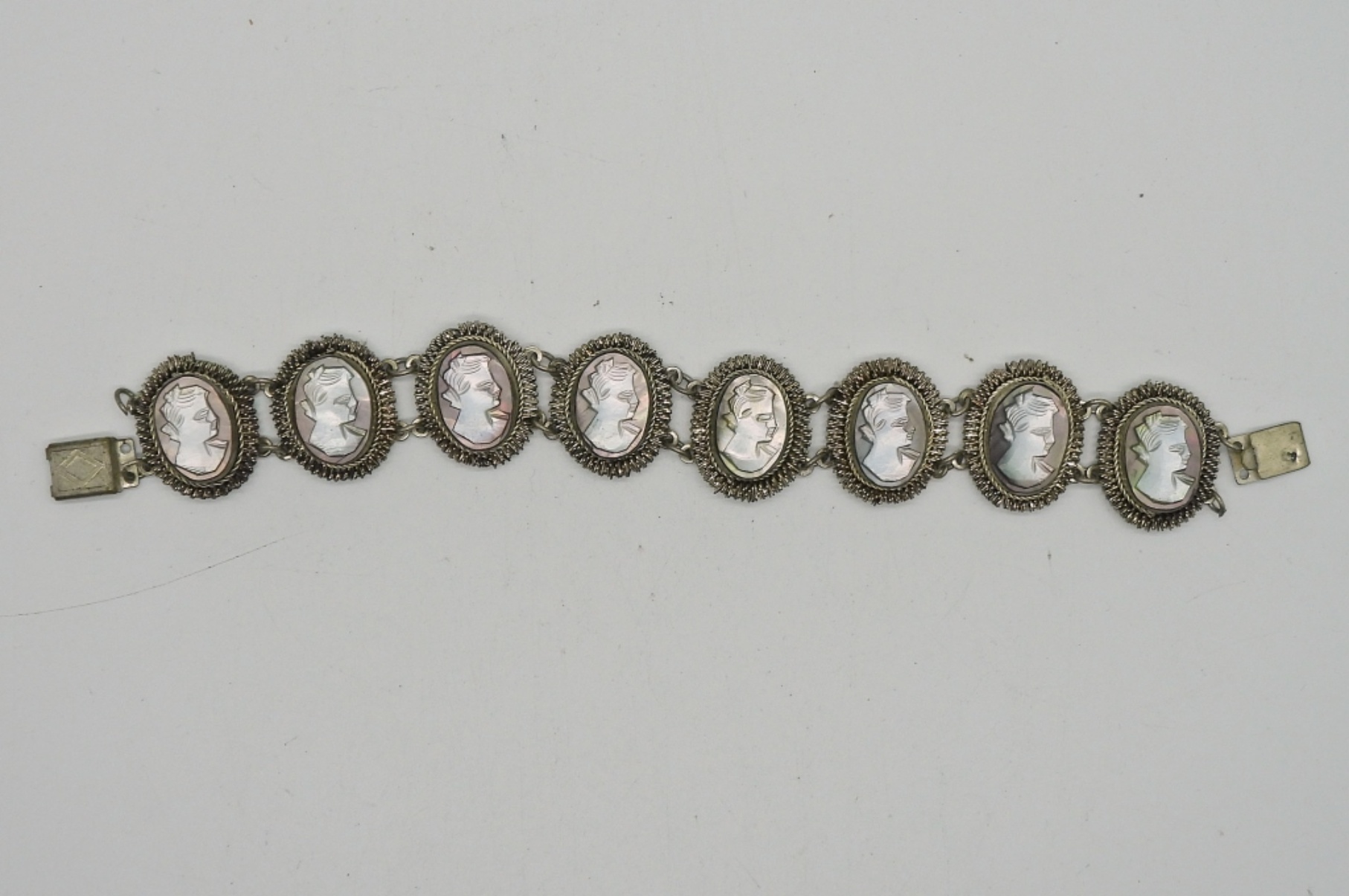 VINTAGE LABRADORITE NECKLACE, 15″. MOTHER OF PEARL CAMEO BRACELET, 7.5″, CLASPS NEED NEW “O” RINGS. VINTAGE ABALONE MARCASITE PENDANT ON A 20″ STERLING CHAIN. PENDANT IS 3″x1.5″. 50.2 DWT