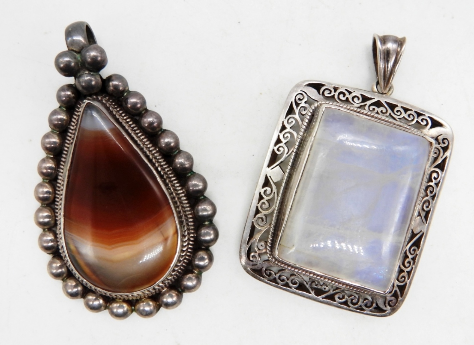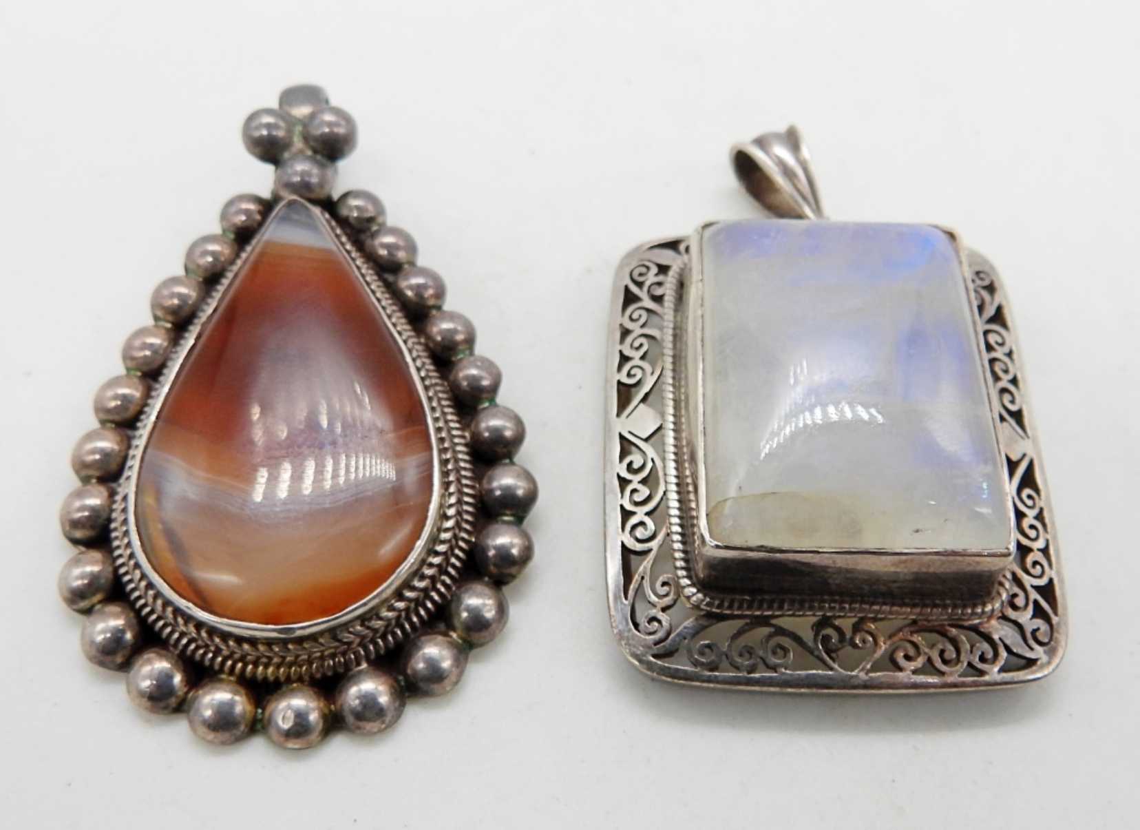 32DWT, BOTH ABOUT 2″ LONG, NO STAMPS FOUND, 1 MOONSTONE AND 1 AGATE
