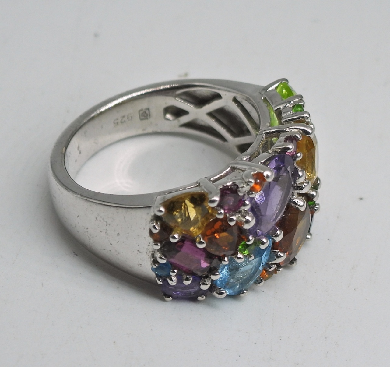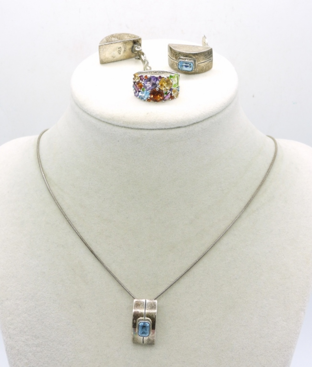 VINTAGE STERLING 19″ NECKLACE WITH AQUAMARINE GEMSTONE, MATCHING CLIP ON EARRINGS & SIZE 6 STERLING MULTI GEMSTONE RING. 12 DWT