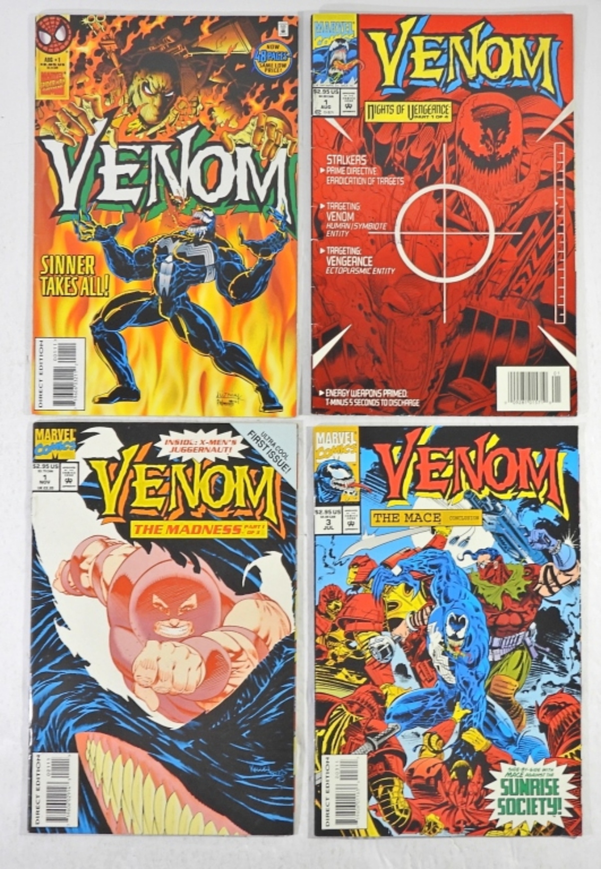 VENOM SINNER TAKES ALL #1, VENOM NIGHTS OF VENGEANCE #1, VENOM THE MADNESS #1, VENOM THE MACE #3 ALL IN GOOD CONDITION