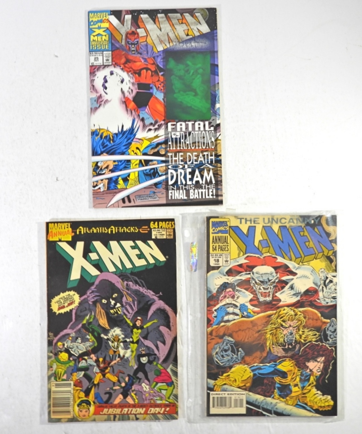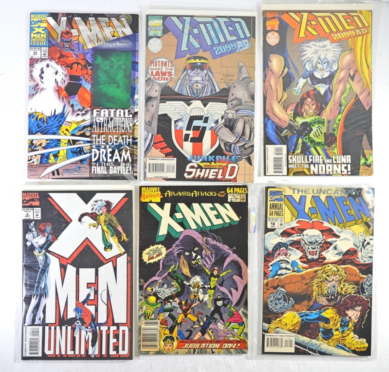 X-MEN ANNIVERSARY ISSUE FATAL ATTRACTIONS #25 1993, X-MEN 2099 AD #’S 23 & 24, X-MEN UNLIMITED #4, ATLANTIS ATTACKS X-MEN MARVEL ANNUAL 1989, THE UNCANNY X-MEN #18 ANNUAL 1994 ALL IN GOOD+ CONDITION