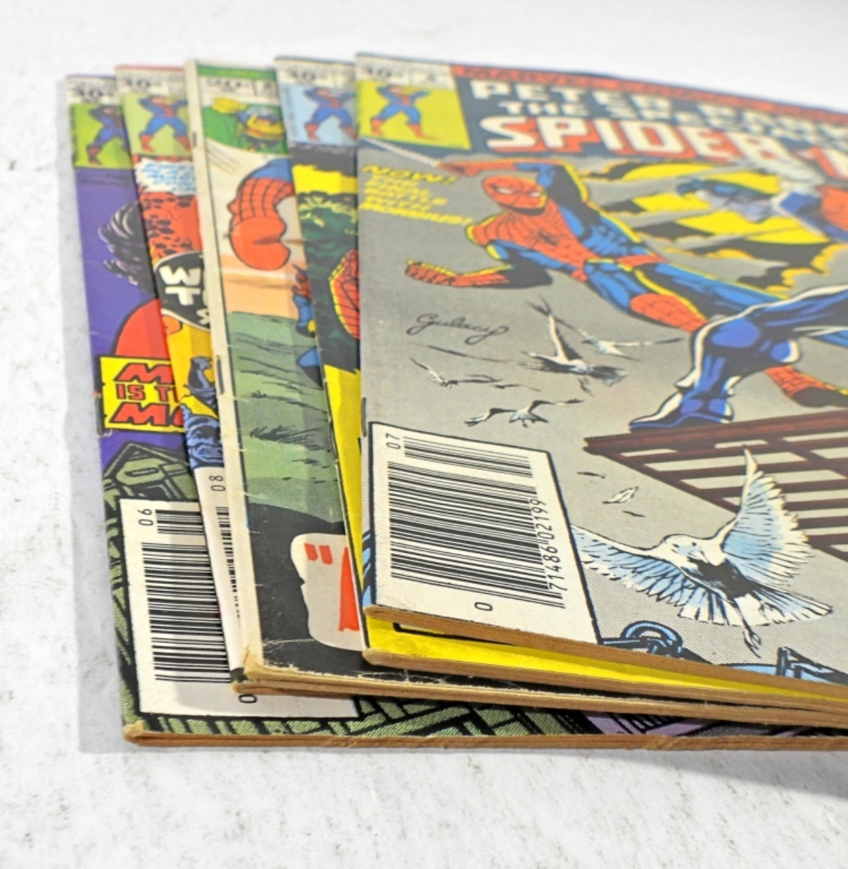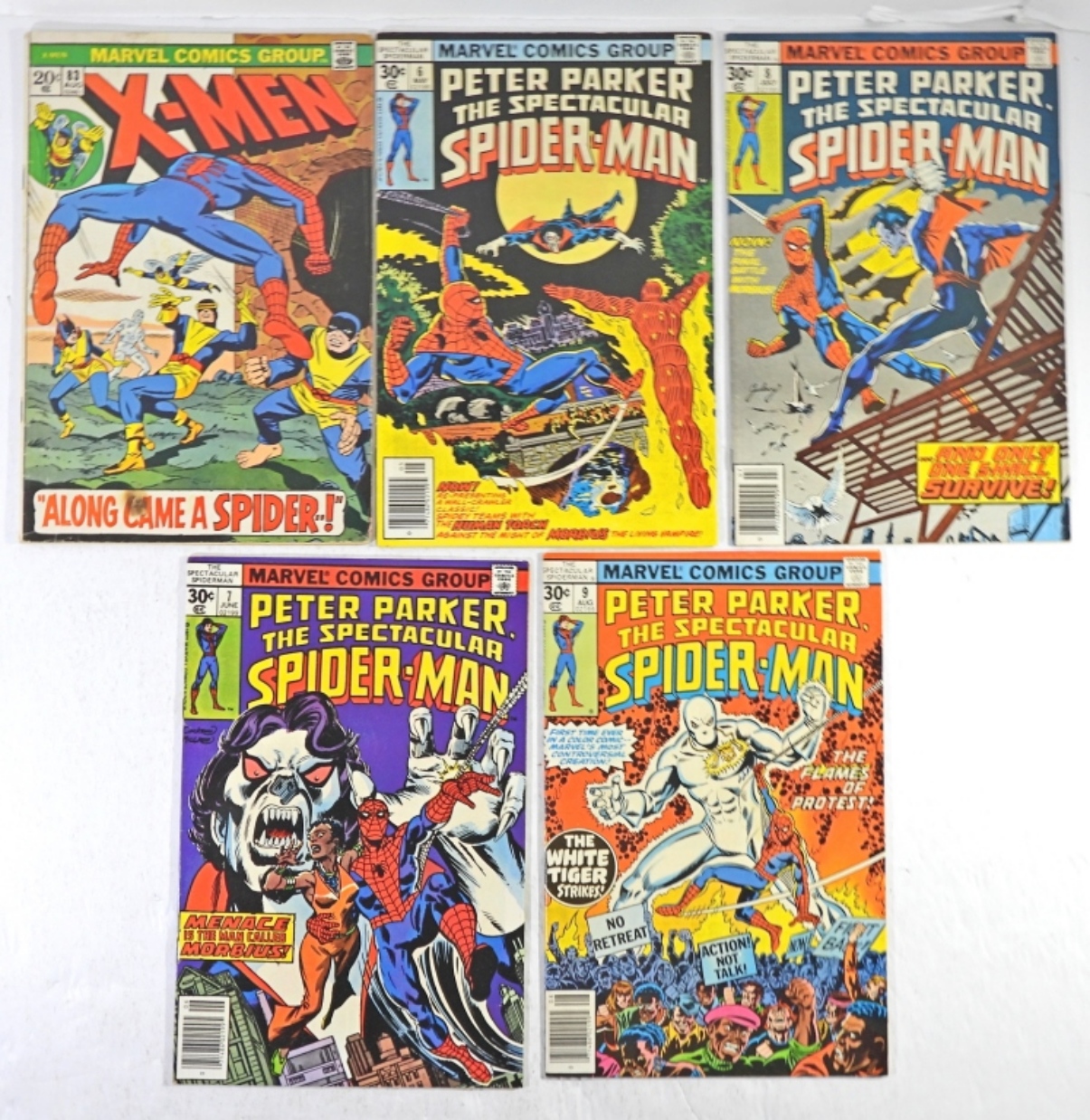 PETER PARKER THE SPECTACULAR SPIDERMAN ISSUE #’S 6-9 1977 IN GOOD CONDITION. PLUS XMEN #83 FEATURING SPIDERMAN IN FAIR CONDITION