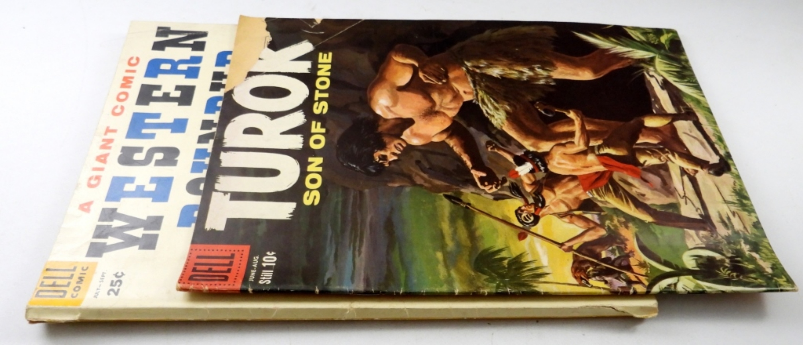 25c WESTERN ROUNDUP GIANT DELL COMIC (1955) ISSUE #11, 10c TUROK SON OF STONE (1959) ISSUE #16 – VERY GOOD CONDITION, SLEEVED