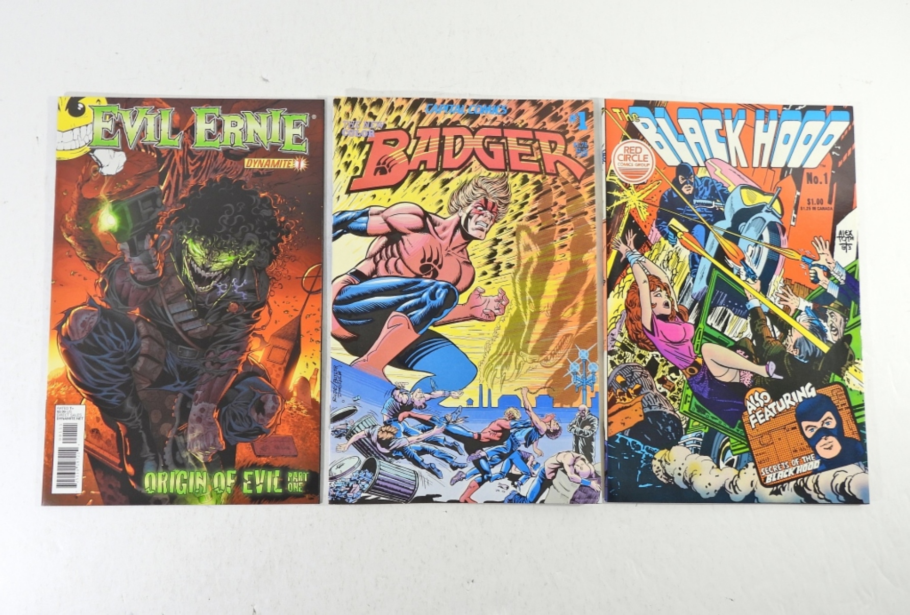 CAPITAL COMICS “BADGER” ISSUE NO. 1 1983 NM. RED CIRCLE, “THE BLACK HOOD” ISSUE NO.1 1983 NM. EVIL ERNIE ORIIGIN OF EVIL PART ONE 2012 NM.