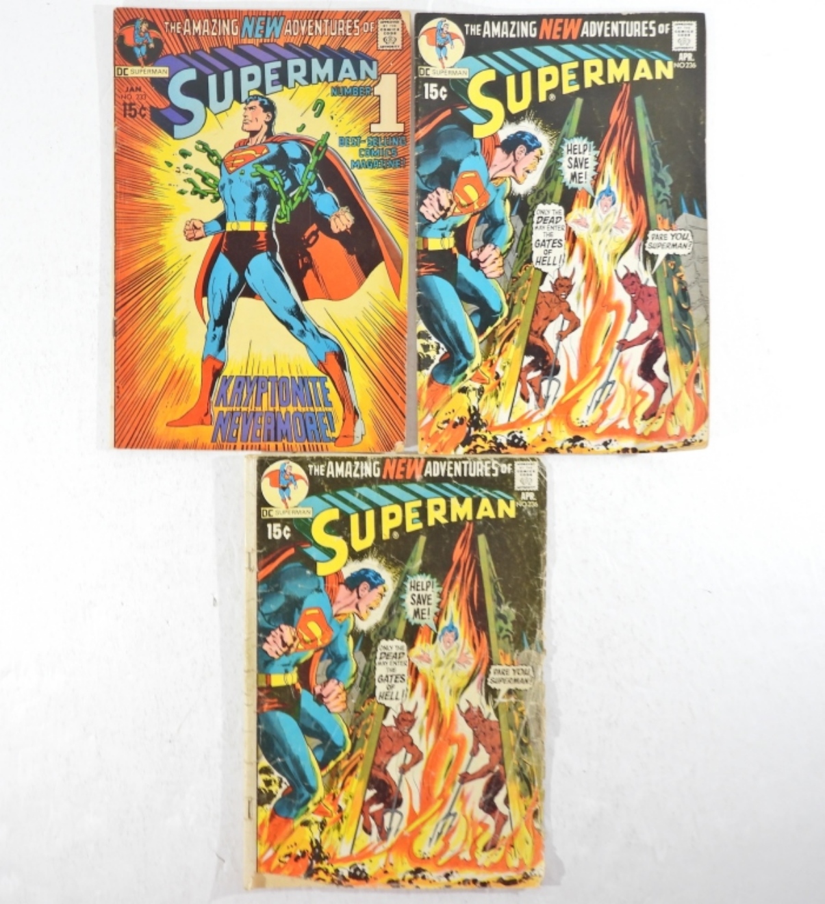 DC SUPERMAN COMIC ISSUE #233 WITH ICONIC COVER ART BY NEAL ADAMS IN GOOD CONDITION. 2 COPIES OF DC SUPERMAN ISSUE # 236 1 IN GOOD CONDITION AND 1 IN FAIR CONDITION