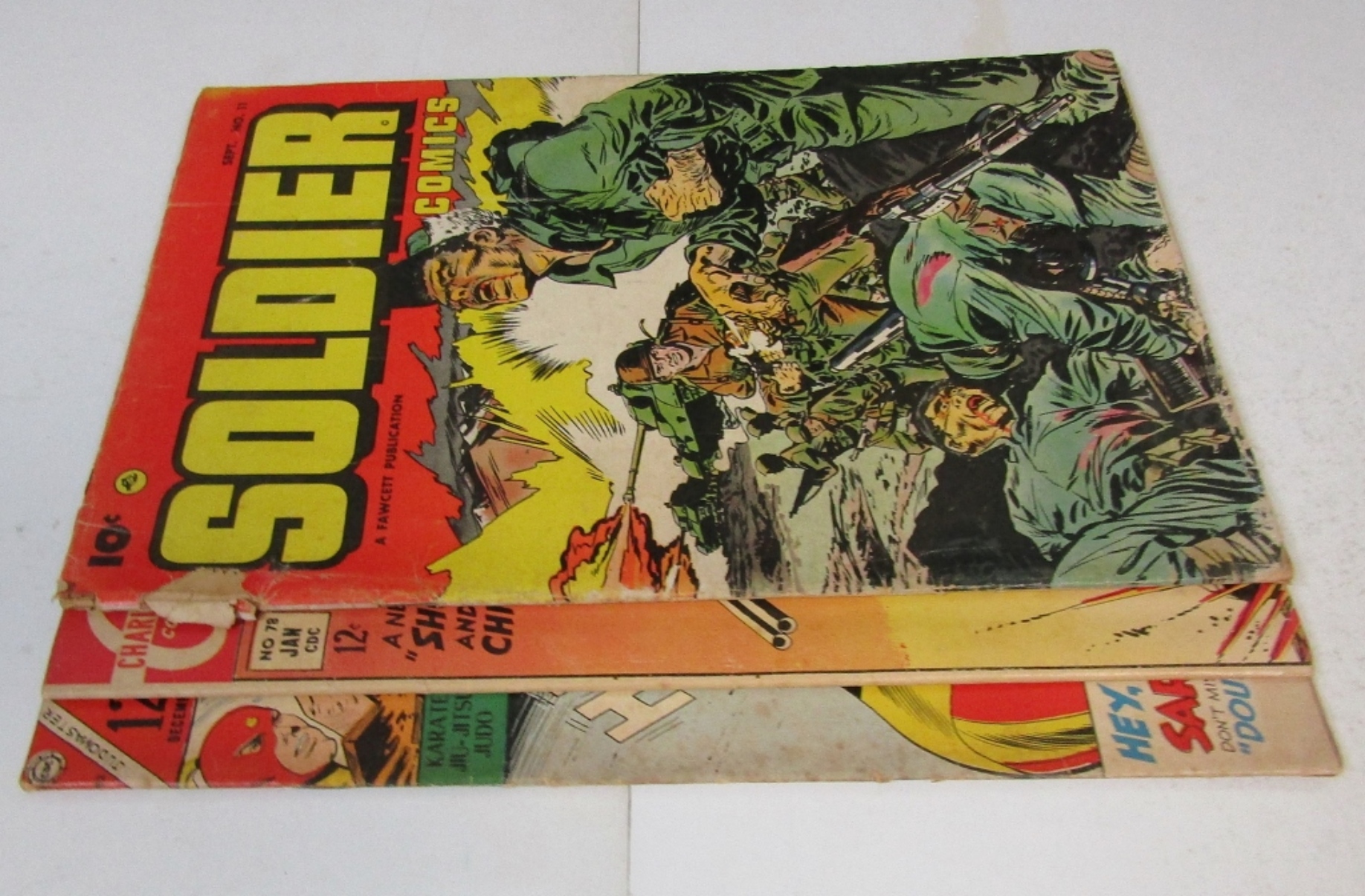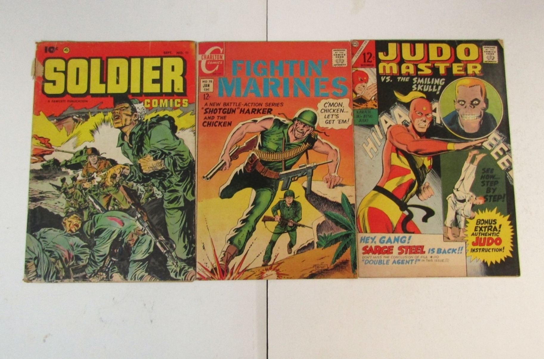 CHARLTON JUDO MASTER VOL.6 ISSUE 92 1966-FINE. SOLDIER COMICS SEPT 1953 ISSUE 11-FINE. CHARLTON FIGHTIN’ MARINES ISSUE 78 1968-VF.
