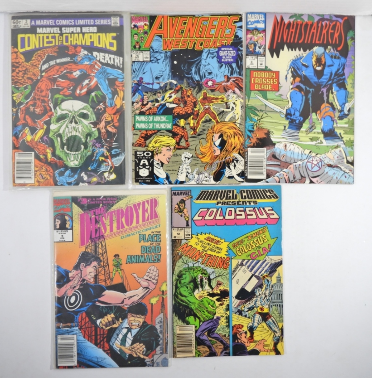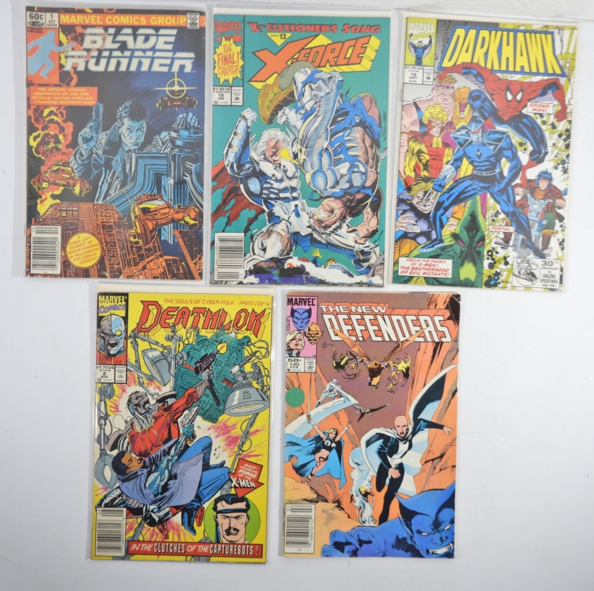 BLADE RUNNER 1982 #1-VG. CONTEST OF CHAMPIONS 1982 #3-FINE. THE NEW DEFENDERS 1985 #140-VG. DEATHLOK 1991 #2-VF. DARKHAWK 1992 #19-VF/NM. X-FORCE 1993 #18-POOR (WATER DAMAGE). AVENGERS WEST COAST 1991 #75-GOOD.