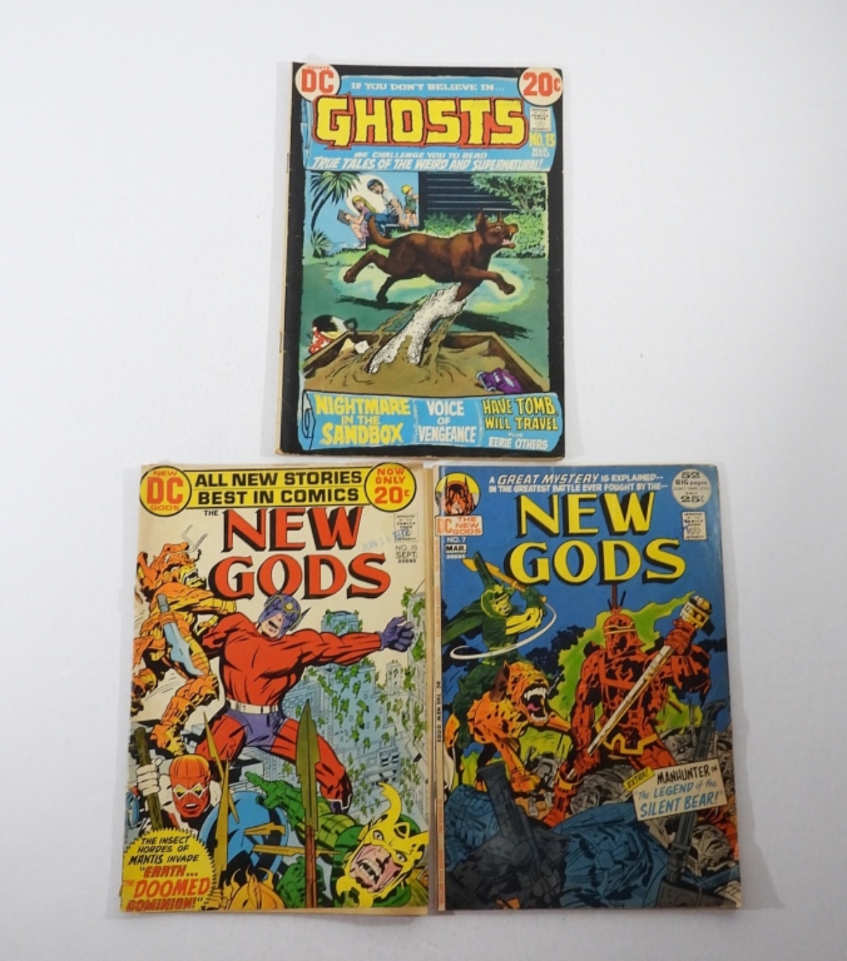 DC GHOSTS #13 VG 1973 “NIGHTMARE IN THE SANDBOX” – DC THE NEW GODS # 7 VG 1972 (1ST APPEARANCE OF STEPPENWOLF DARKSEID) – DC THE NEW GODS #10 1972 GOOD.
