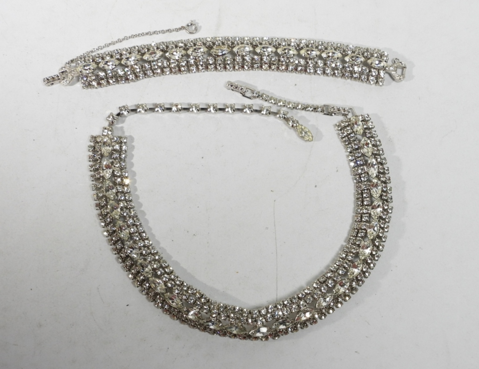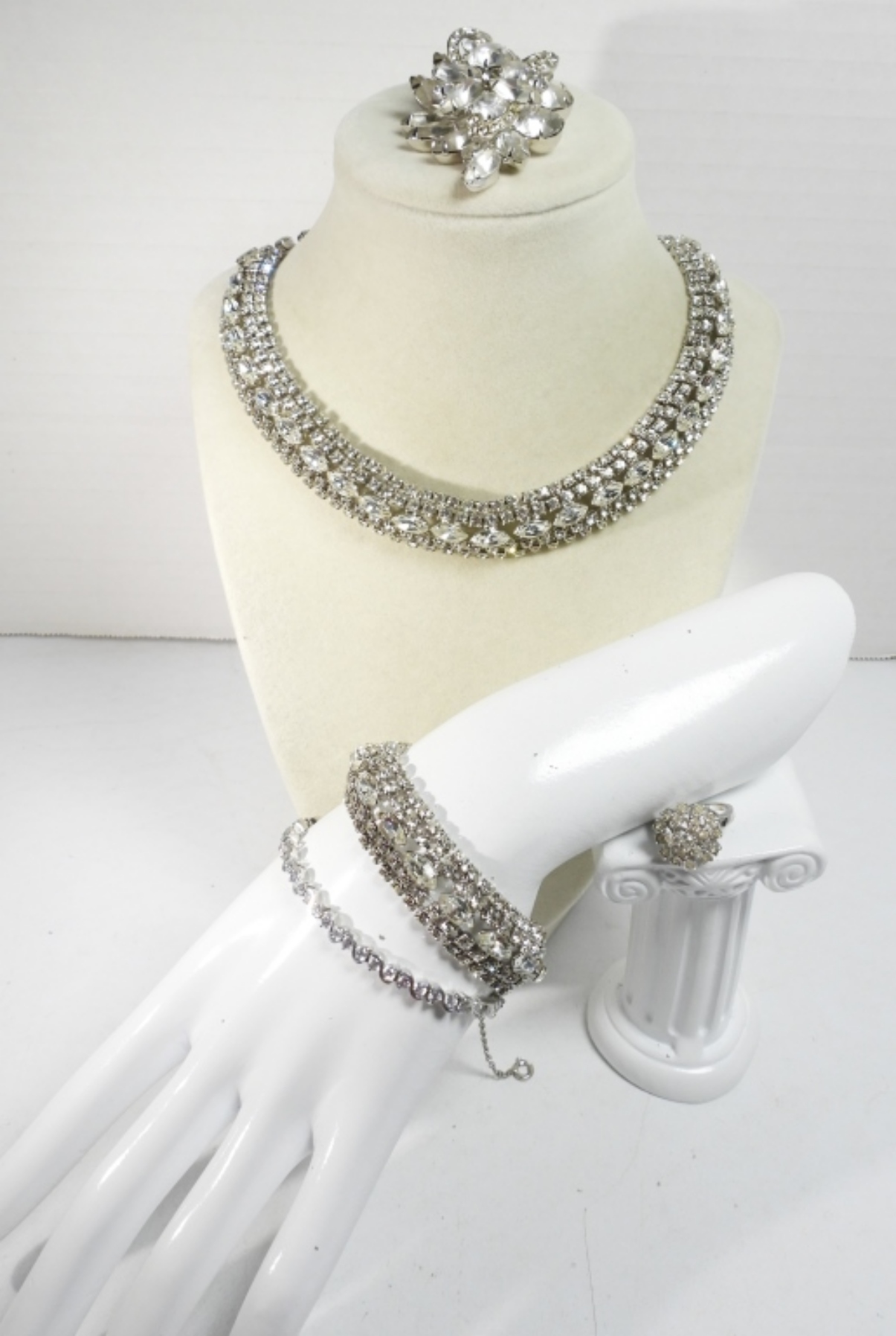 VINTAGE SILVER TONE WHITE RHINESTONE JEWELRY LOT. CHOKER NECKLACE 17″, MATCHING BRACELET 7″. MODERN BRACELET 7″. RING SIZE 7.