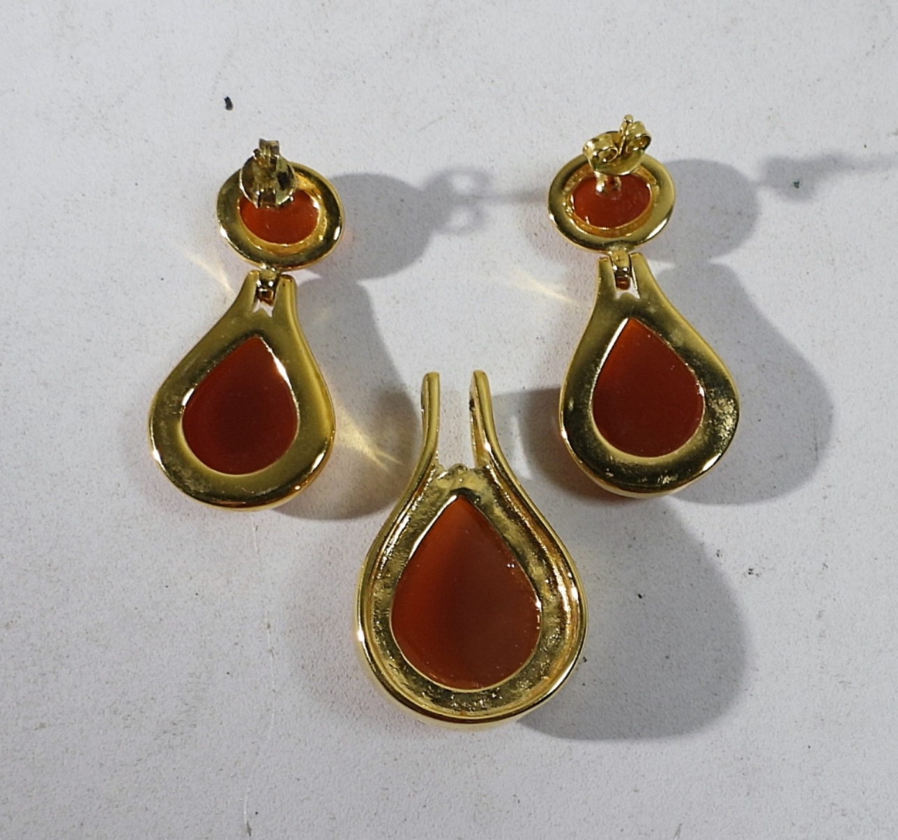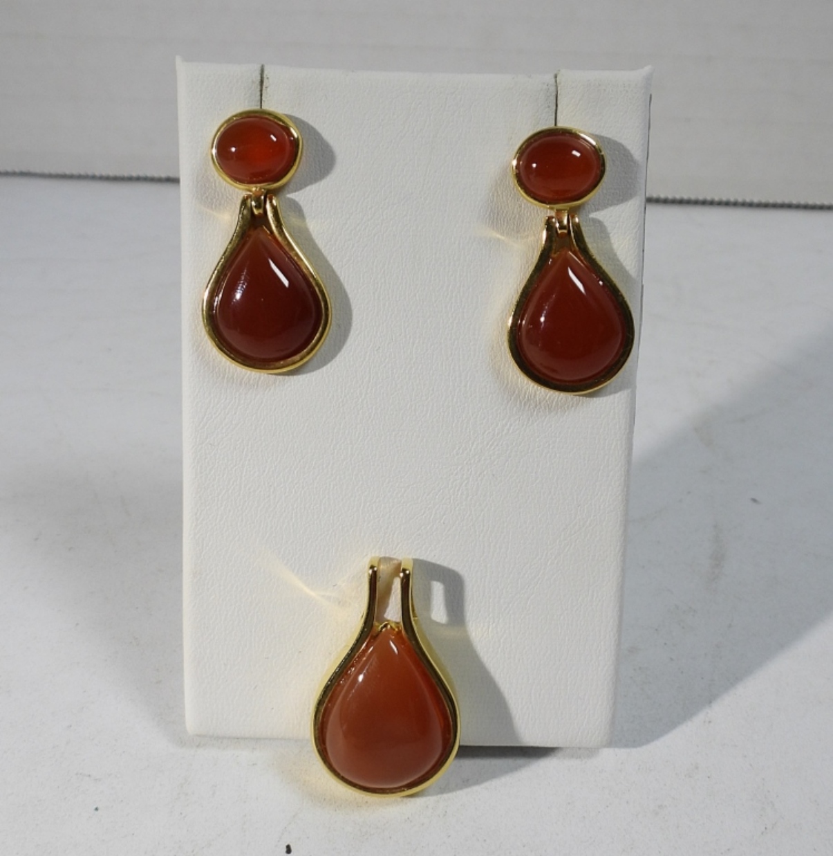 GOLD TONE EARRING & PENDANT SET WITH CARNELIAN GEMSTONES. EARRINGS ARE PIERCED.