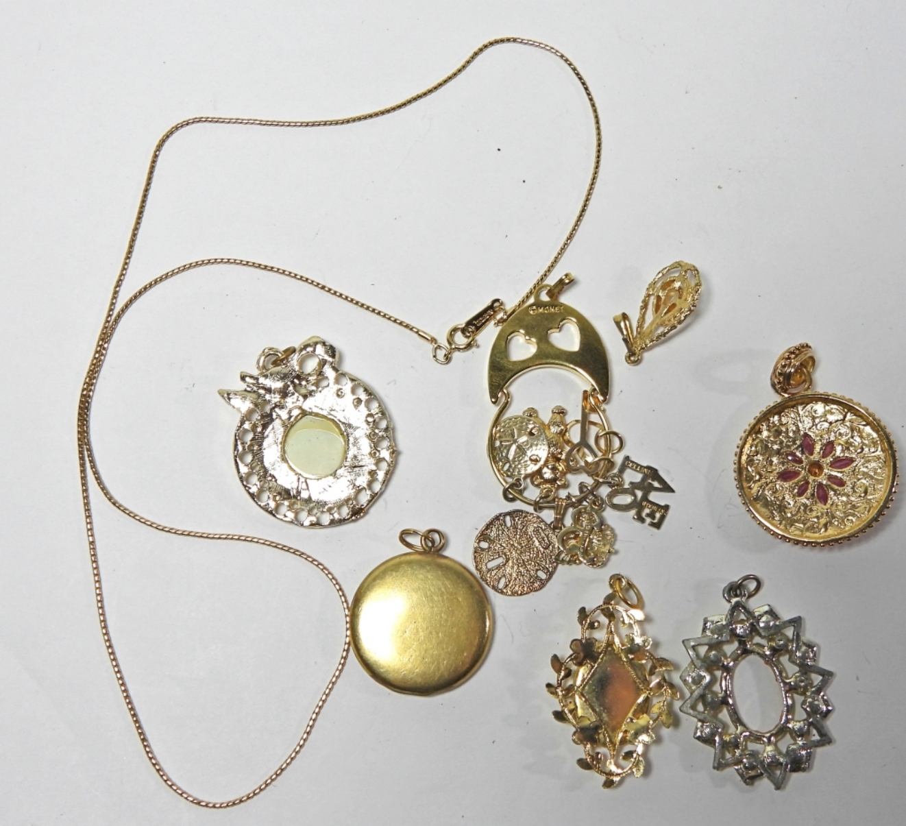 7 GOLD TONE PENDANTS. 1 PENDANT WITH CHARMS IS MONET. CHAIN IS AVON AND 20INCH GOLD TONE