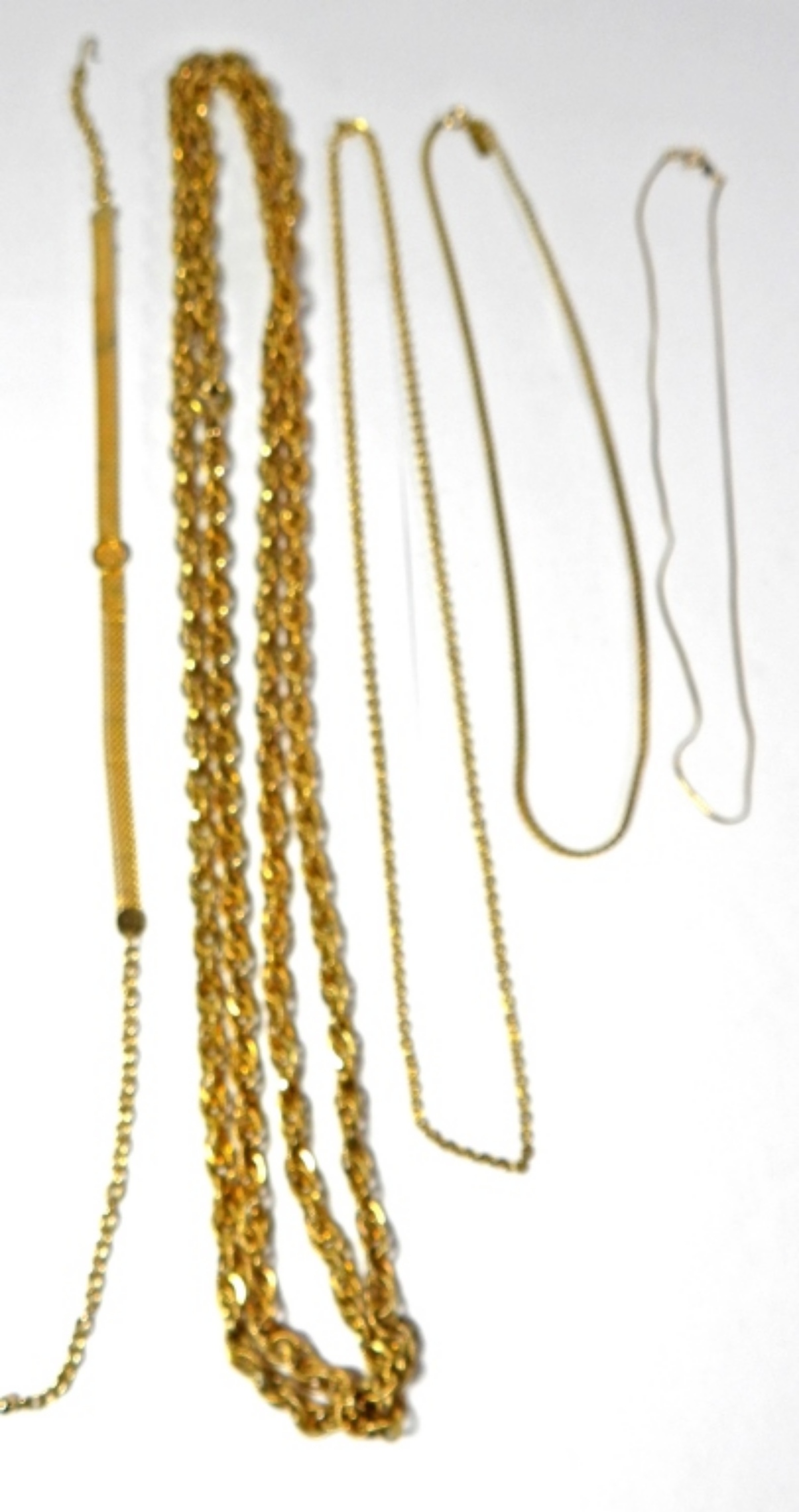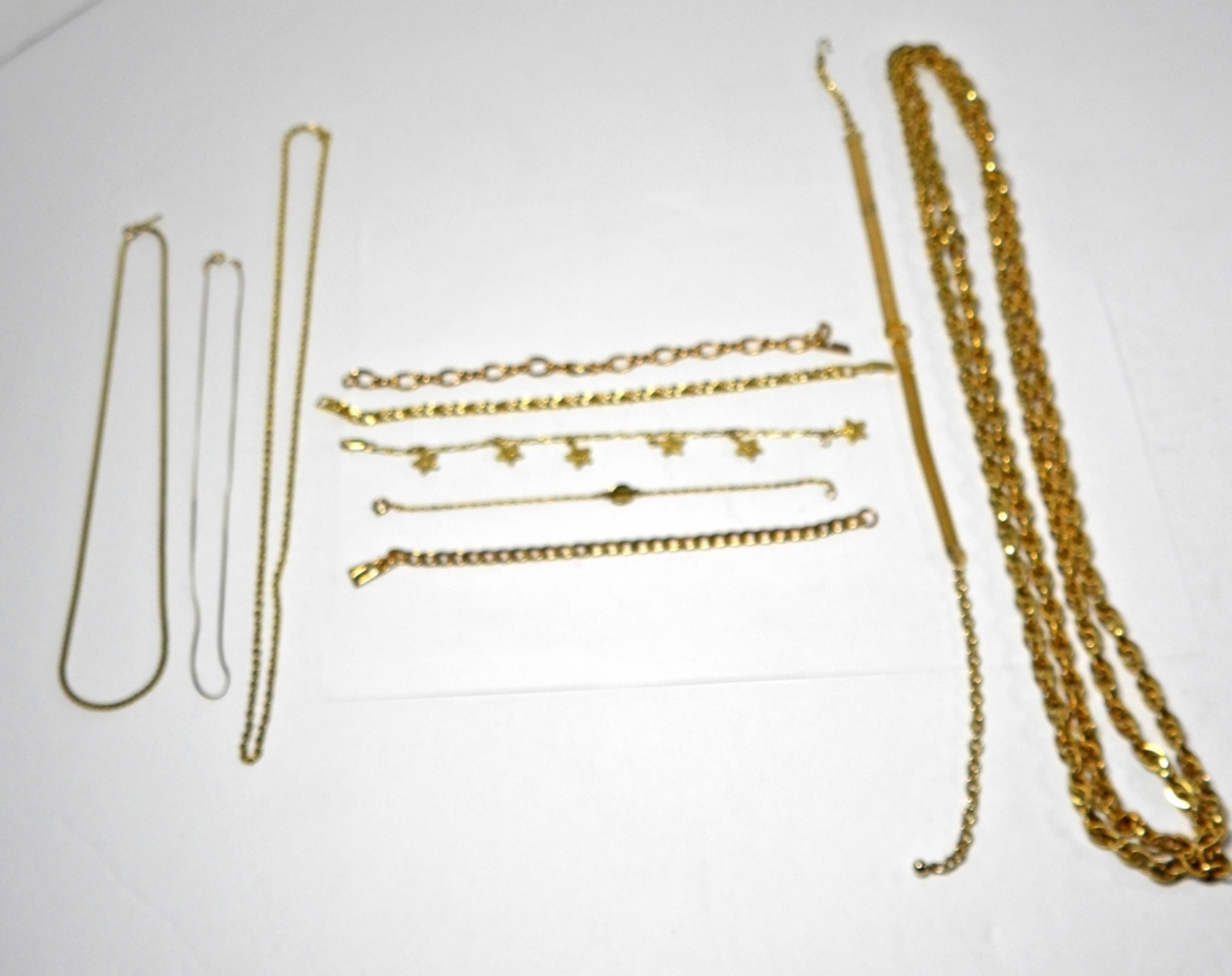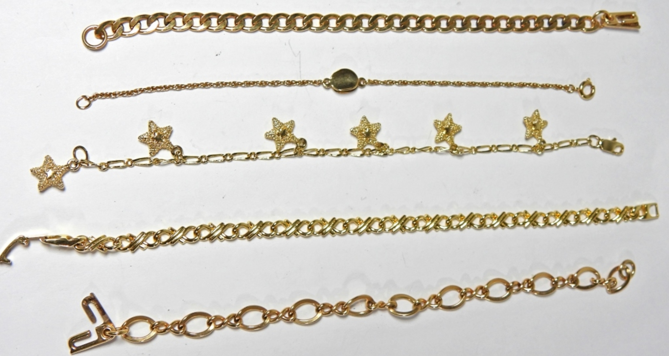 5 BRACELETS VARIOUS LENGHTS 6-8INCHES. 5 GOLD TONE CHAINS VARIOUS LENGTHS WITH THE NAPIER CHAIN BEING 30INCH & THE LANVIN CHAIN BEING 18INCH