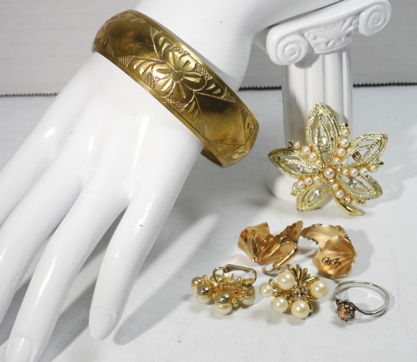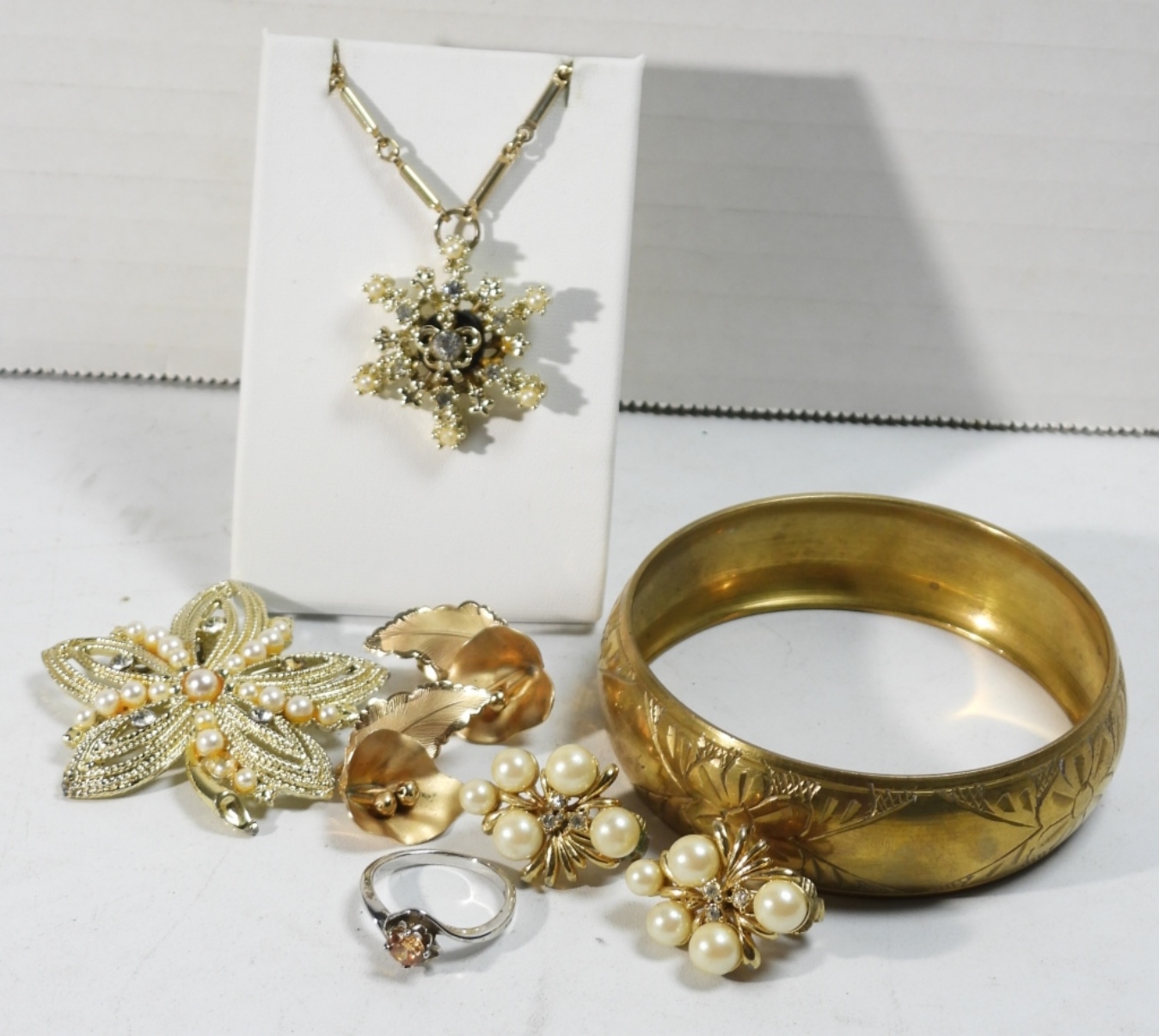 GOLD TONE WITH FAUX PEARL AND GEMSTONE NECKLACE, 16″. ETCHED BANGLE BRACELET 9″. FLOWER BROOCH, 2 PAIR OF EARRINGS AND A RING SIZE 8.