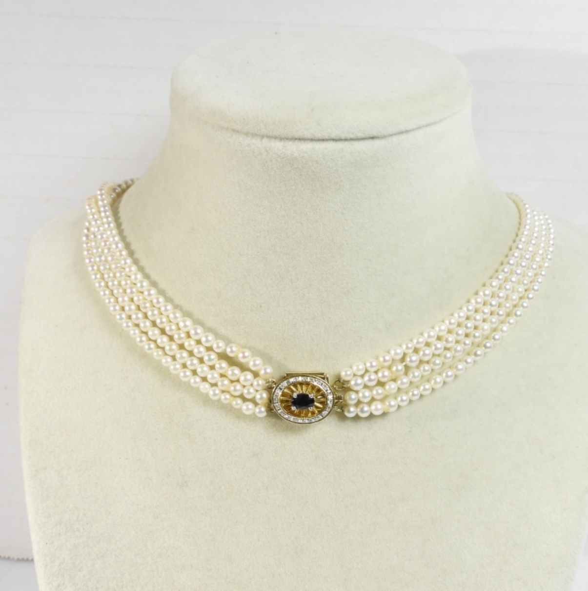 15″ choker pearl necklace with stunning 14K 585 clasp with sapphire stone and halo of moissanite diamonds. (DWT 4.3)
