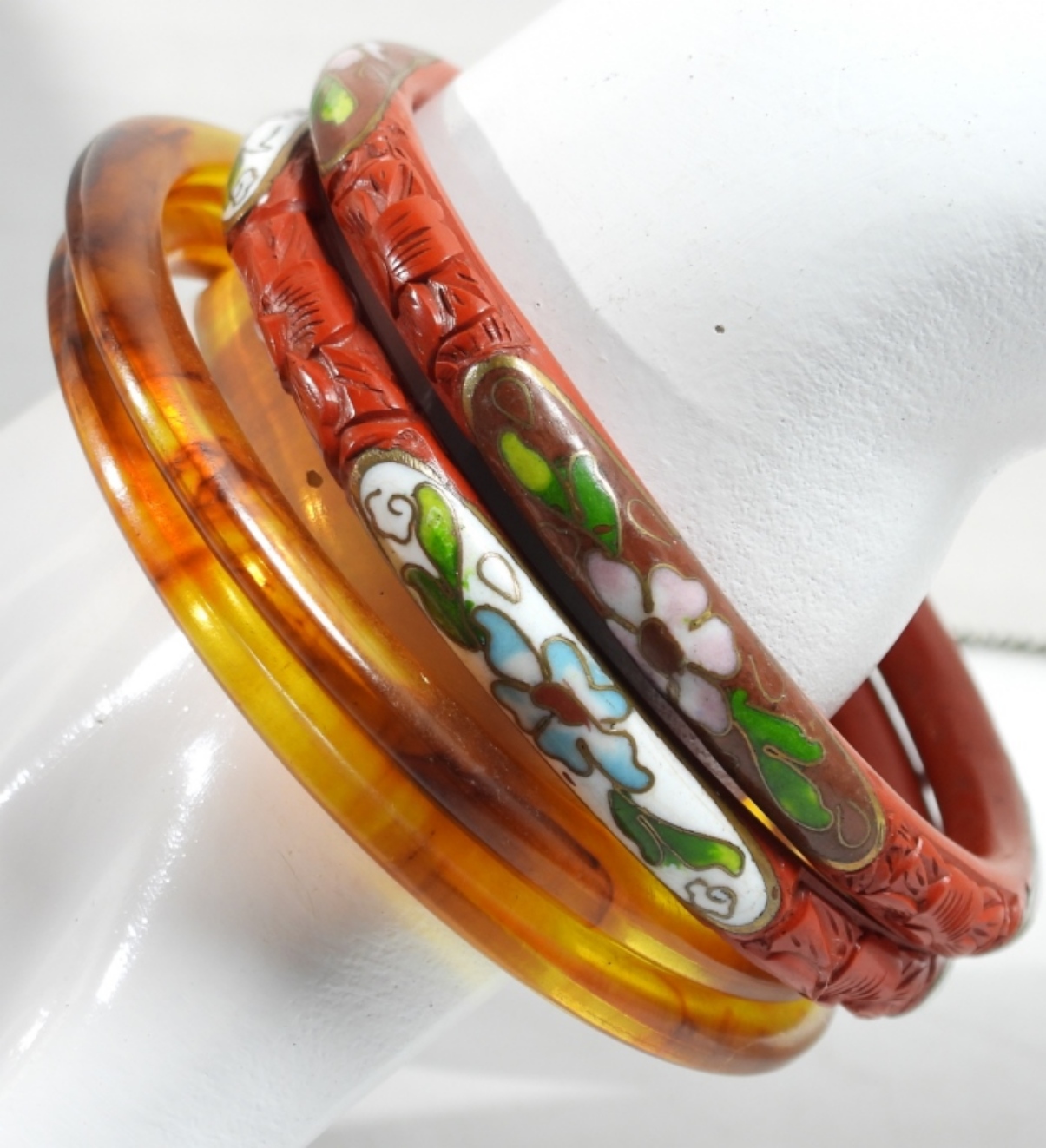 4 VINTAGE BRACELETS. TWO RED CARVED CLOISONNE BRACELETS. TWO AMBER COLORED LUCITE BRACELETS. 9″.