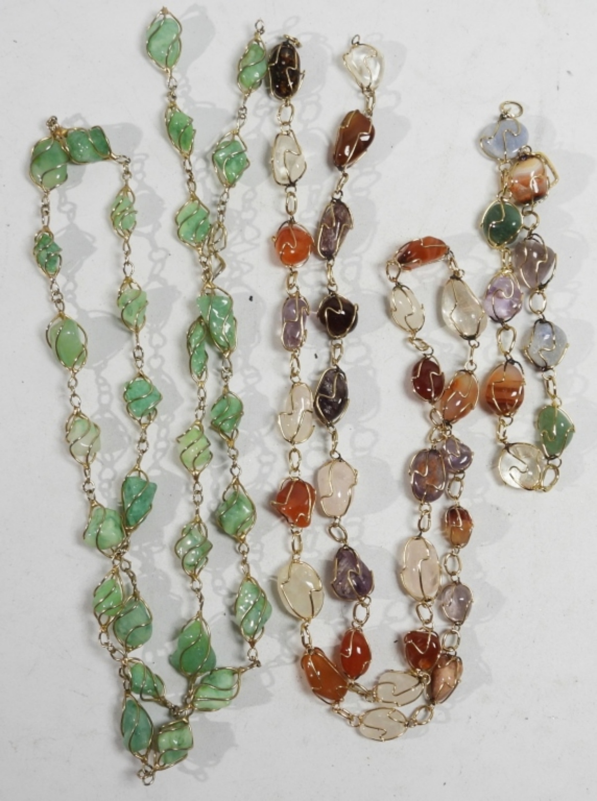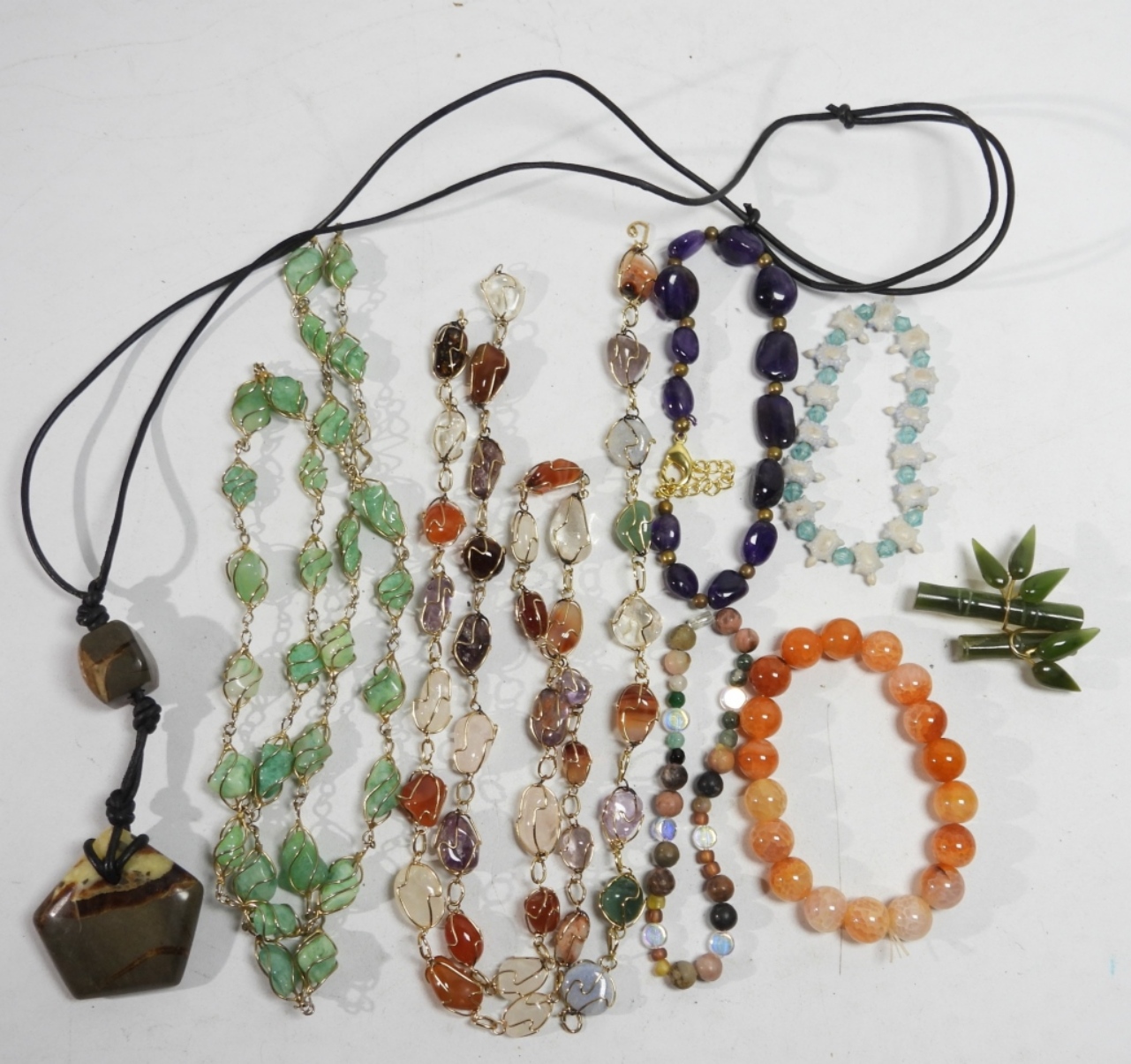 3 POLISHED GEMSTONE NECKLACES (NEED SOME CLASP FIXES) 26 & 28″. 5 POLISHED GEMSTONE BRACELETS AND A BAMBOO JADE PIN.
