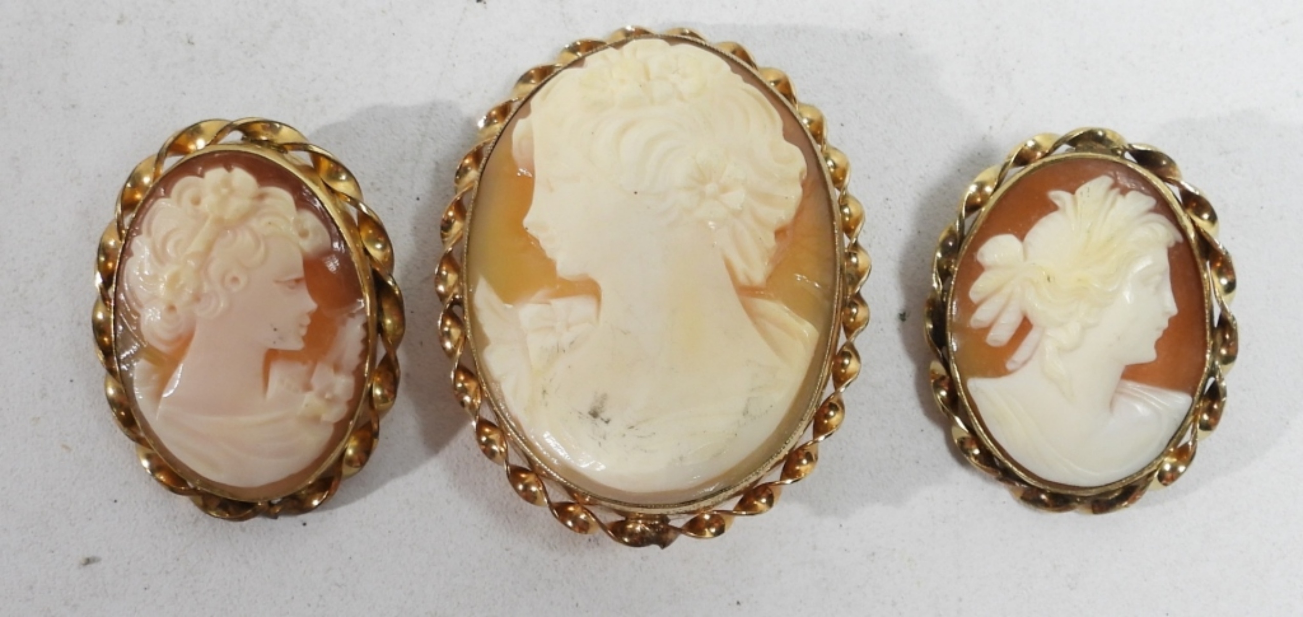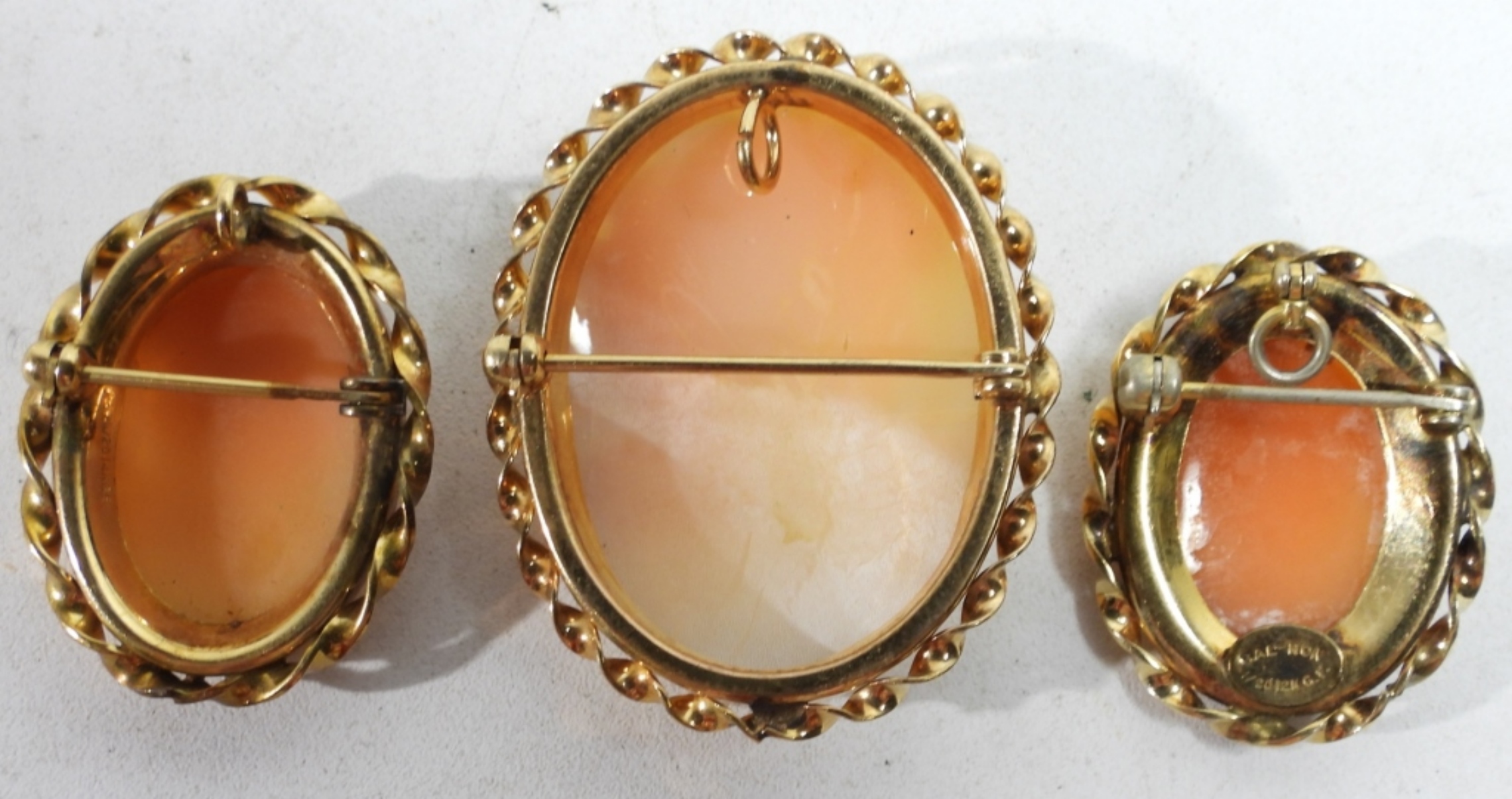 3 CAMEO BROOCH / PENDANTS. 12KGF BAL-RON CAMEO. 14KGF A&Z CAMEO. LARGEST CAMEO 14KGF.