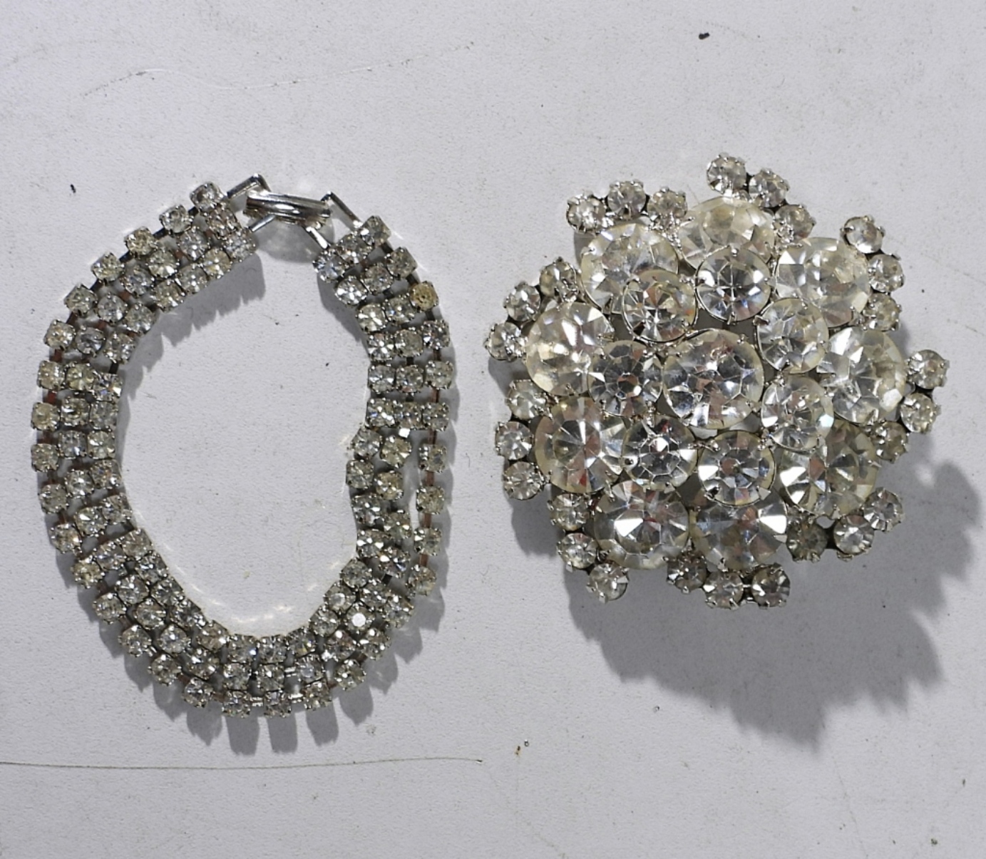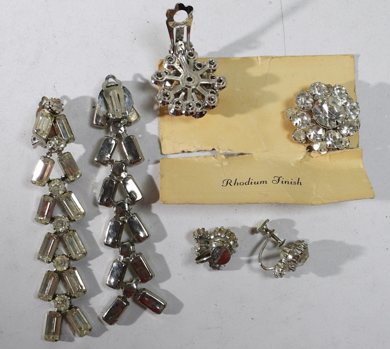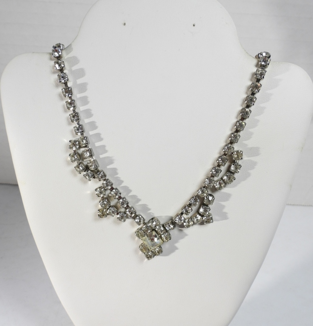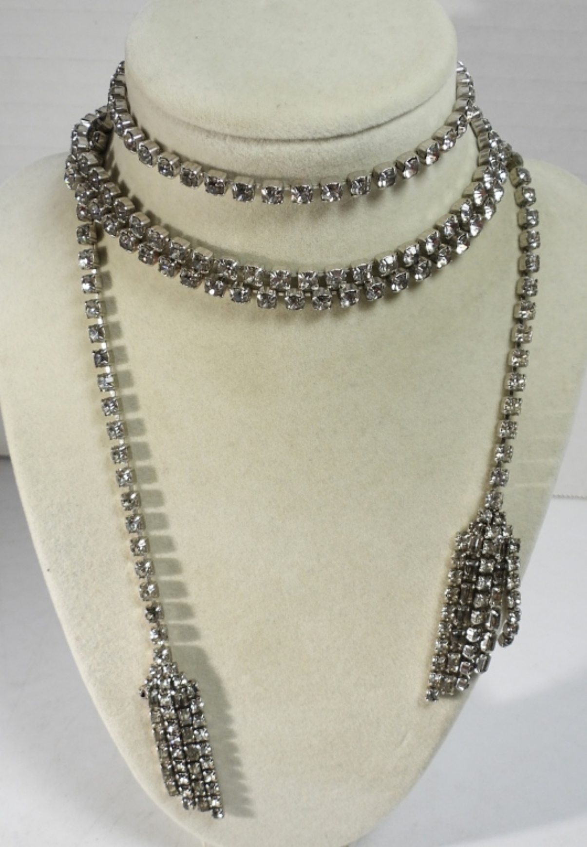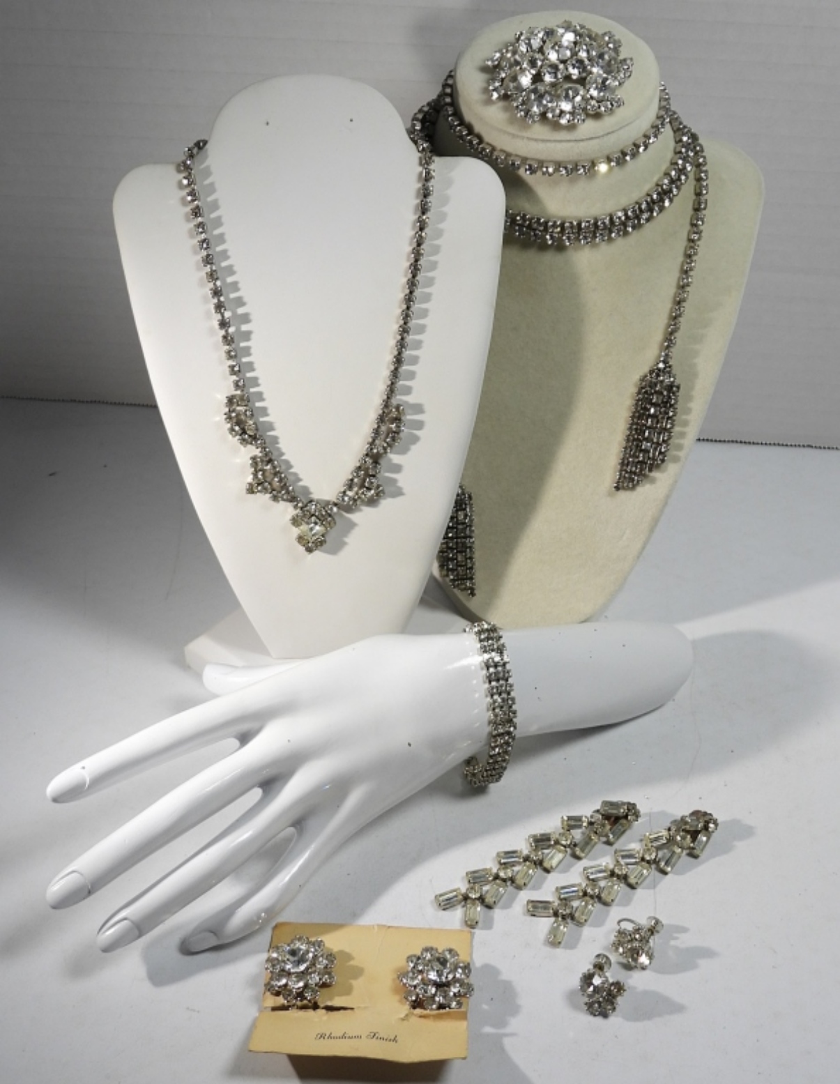 SEVEN PIECES OF SILVER TONE, WHITE RHINESTONE VINTAGE JEWELRY. NECKLACES ARE 52″ & 15″. BRACELET IS 6.5″.