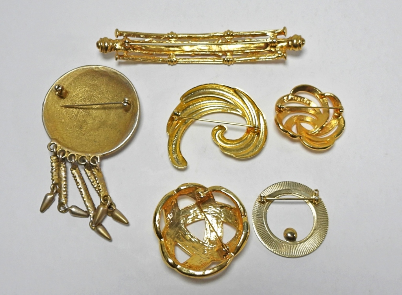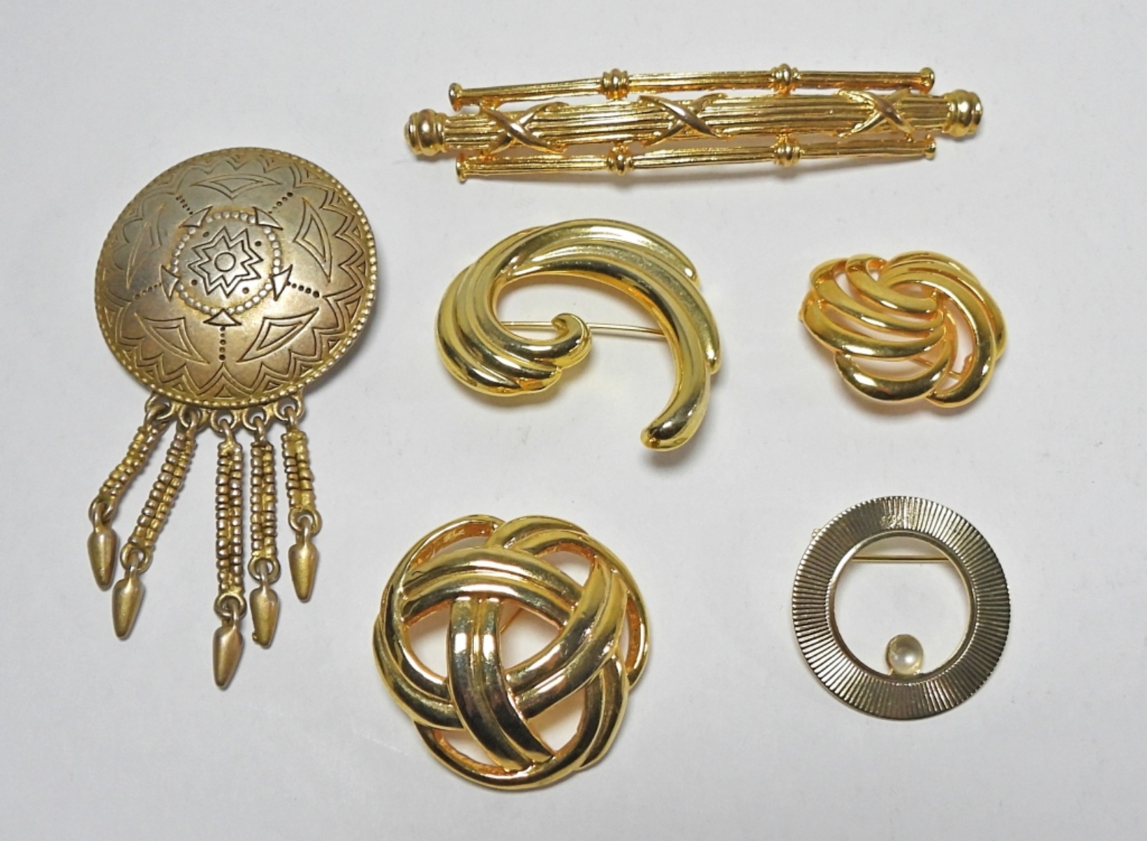 6 GOLD TONED BROOCHES. 1 WITH NICE TRIBAL DESIGN