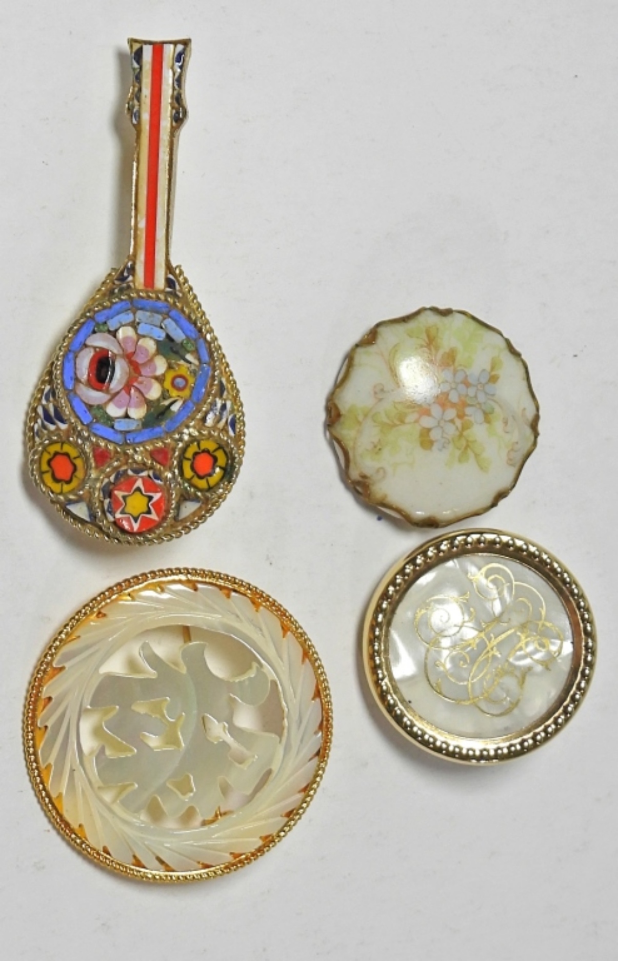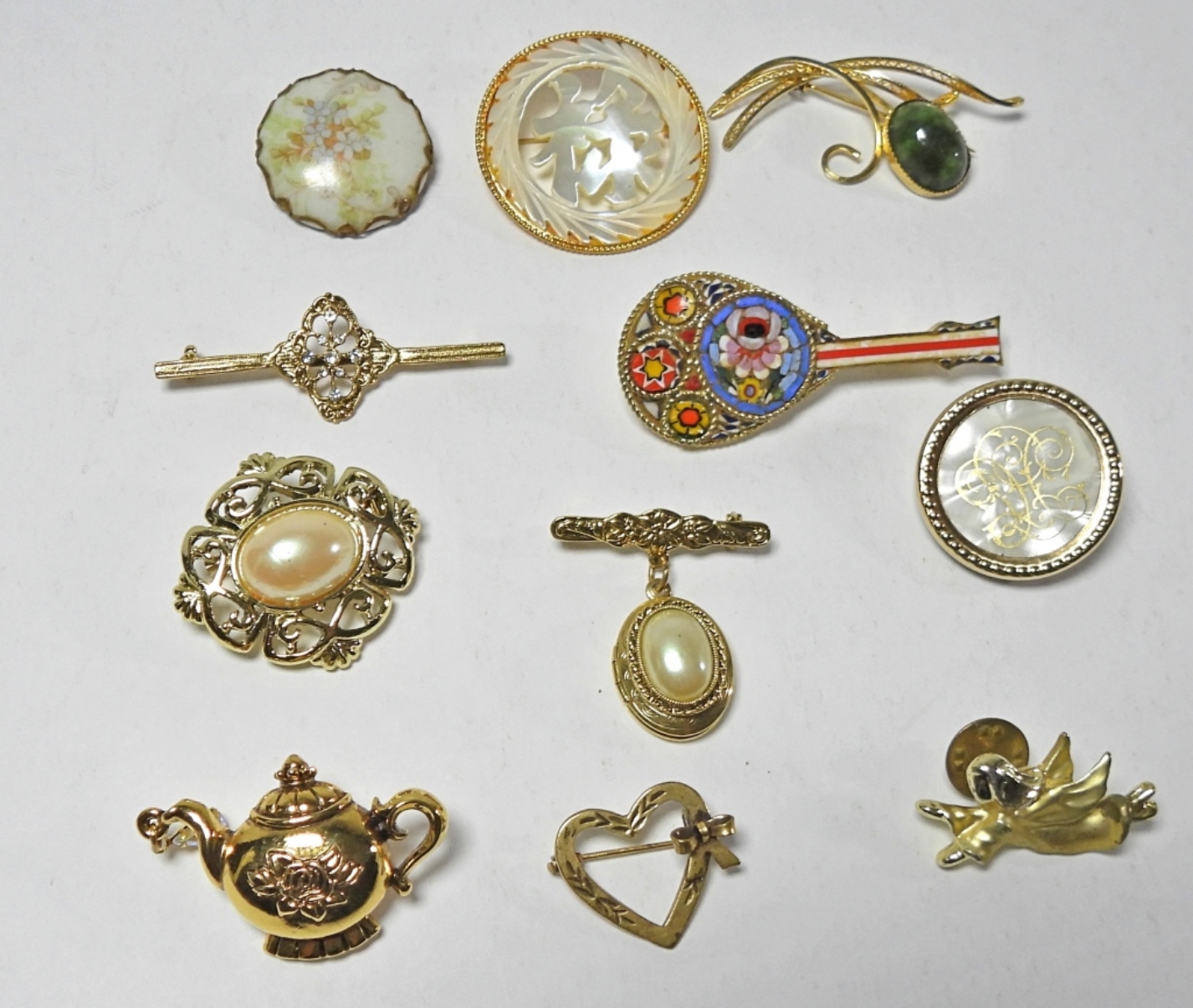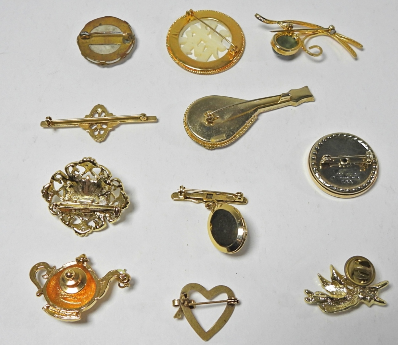 11 GOLD TONED BOOCHES. 2 BROOCHES HAVE MOTHER OF PEARL. VERY ECLIPTIC LOT!!