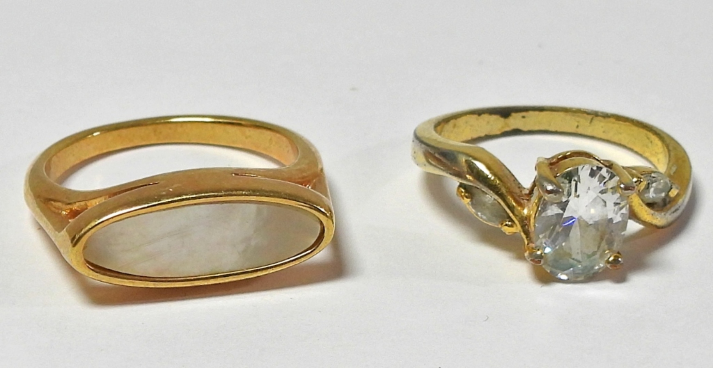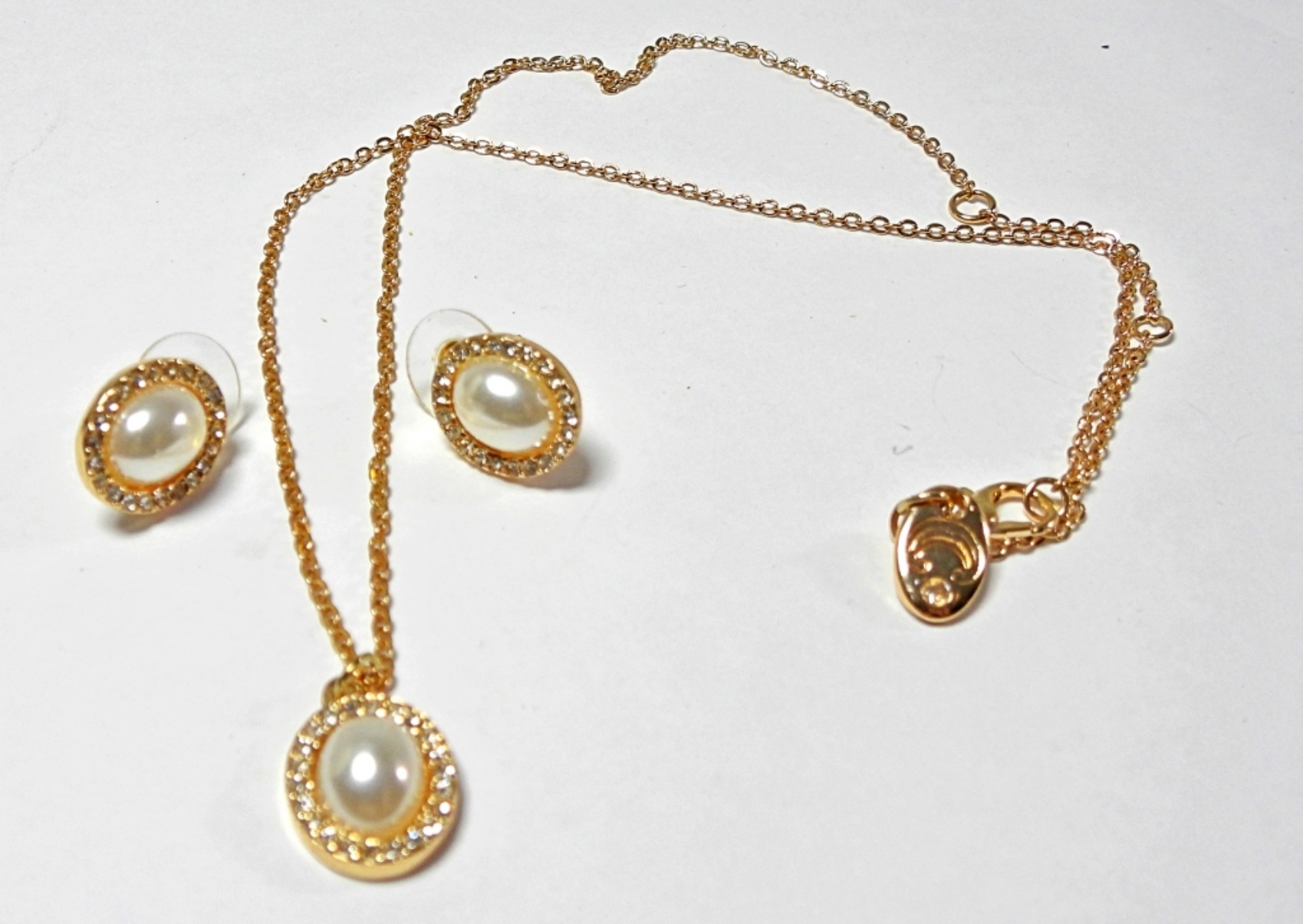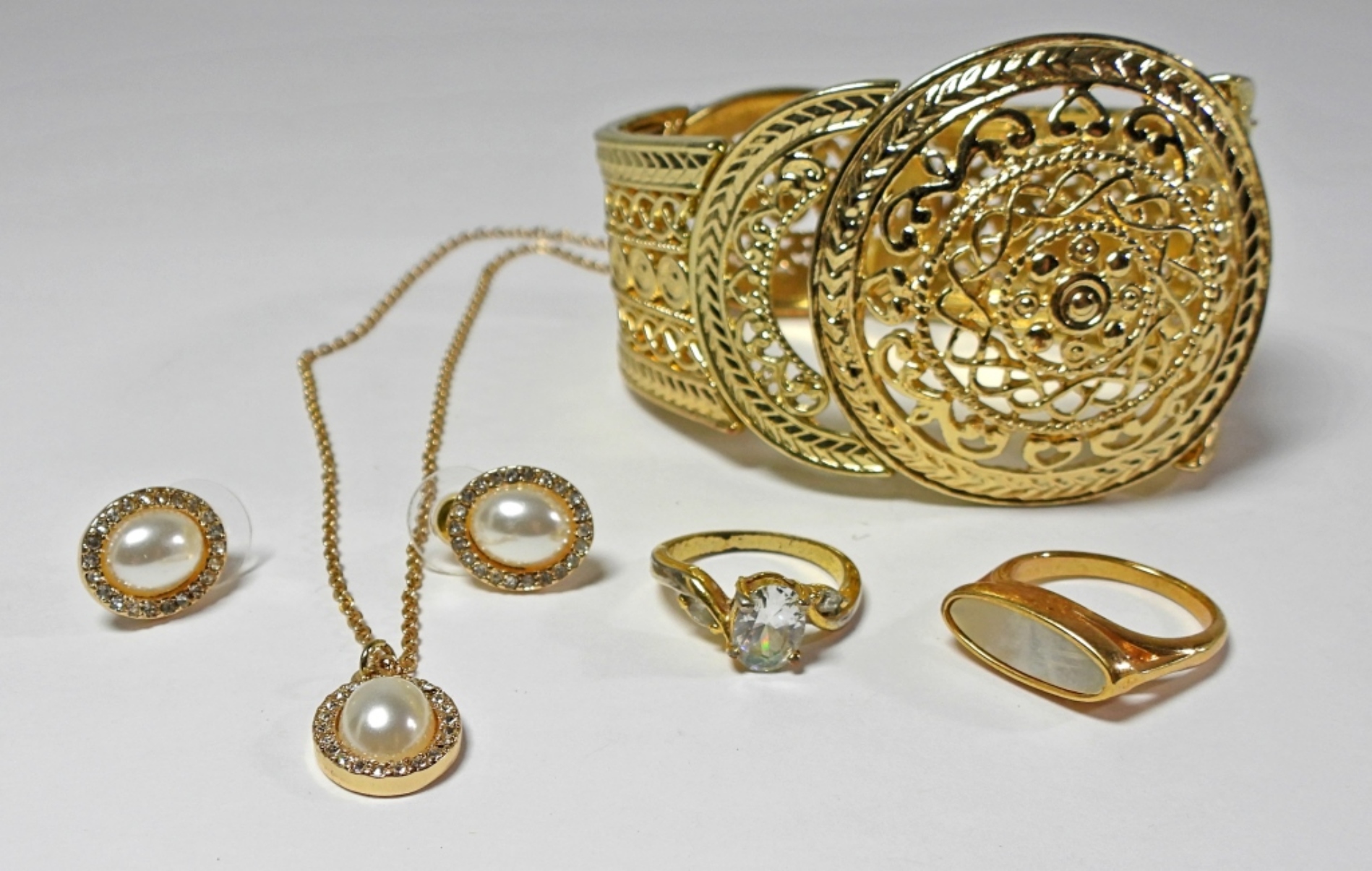 1 18INCH GOLD TONE FAUX PEARL PENDANT NECKLACE. 1 LARGE STRETCH GOLD TONE BANGLE. 1 PAIR OF FAUX PEARL EARRINGS. 2 GOLD TONE RINGS. ONE OF THE RINGS IS AVON BRAND