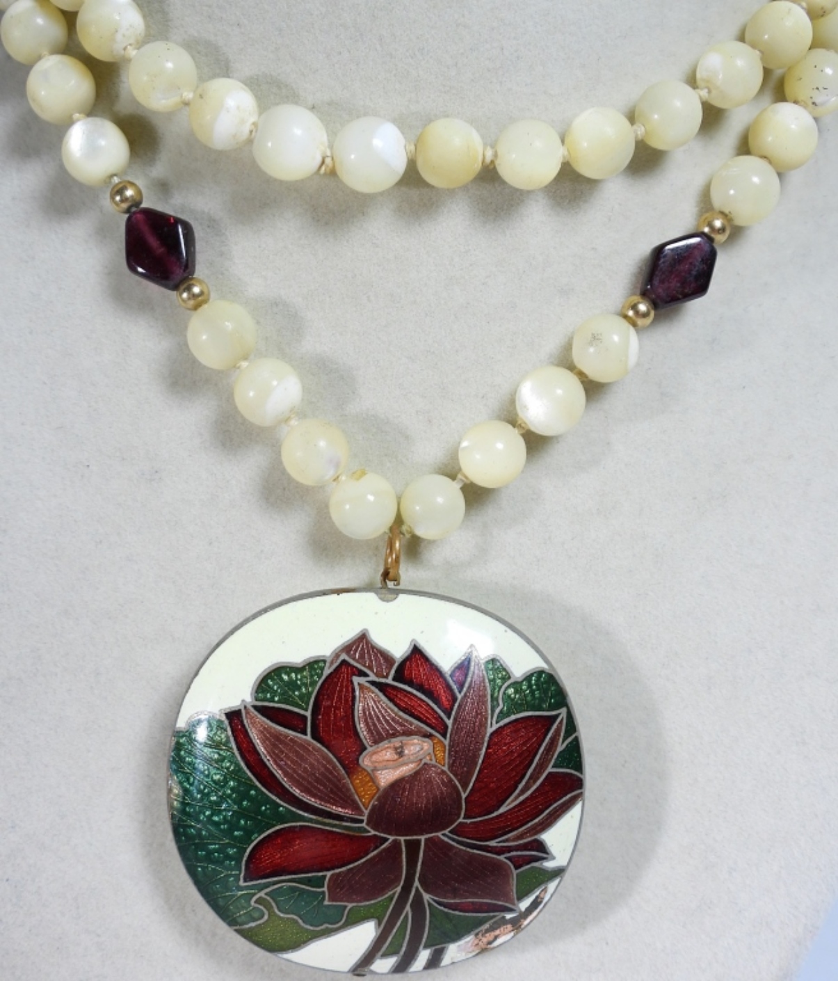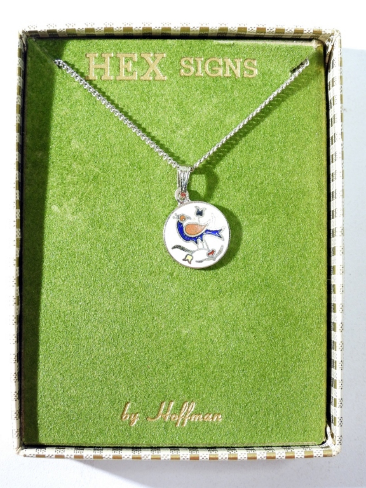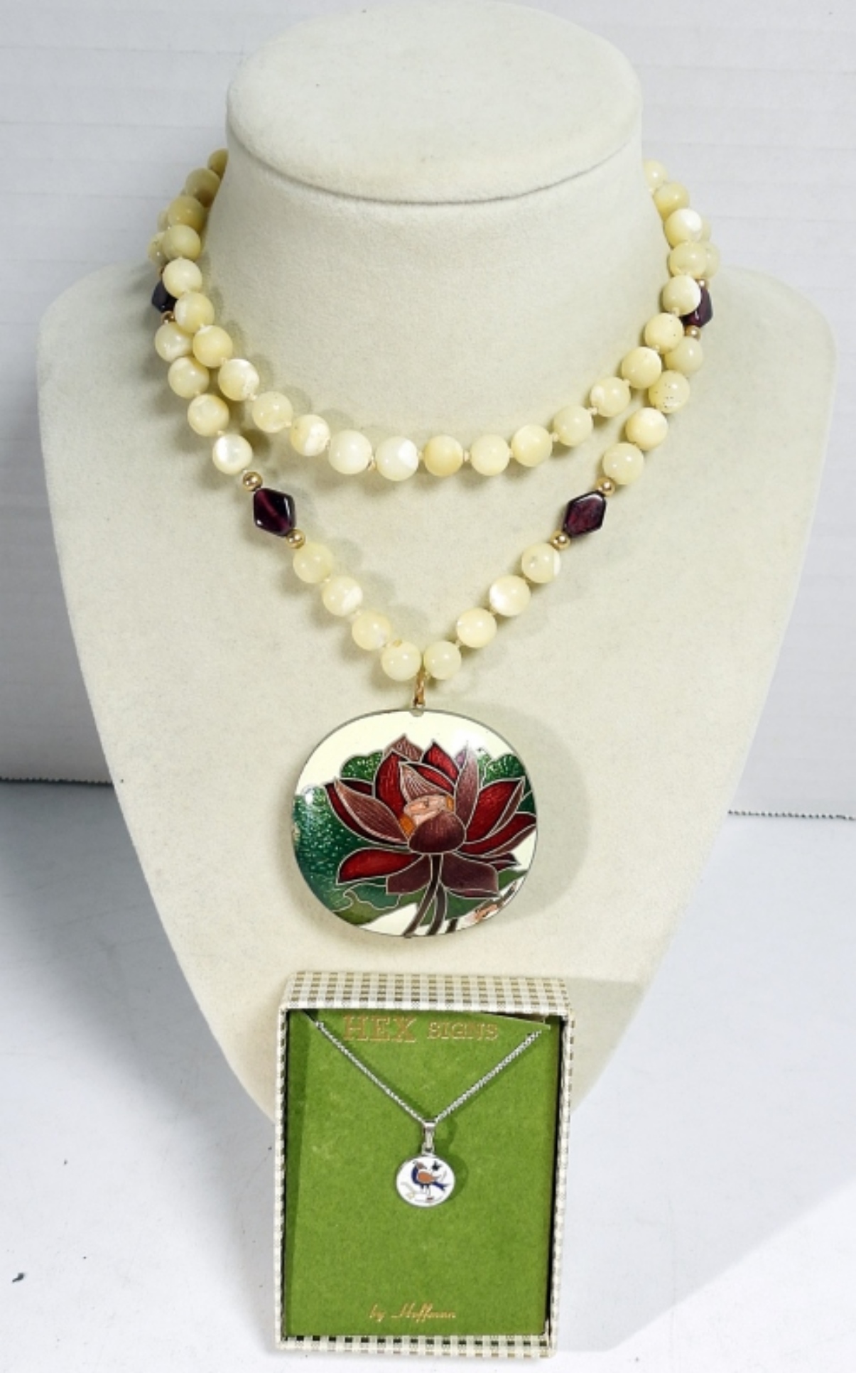 VINTAGE HEX SIGNS BY HOFFMAN, TINY BIRD PENDANT ON A 16″ SILVER TONE CHAIN. LARGE CLOISONNE PENDANT ON A NATURAL GEMSTONE BEADED NECKLACE, 26″.