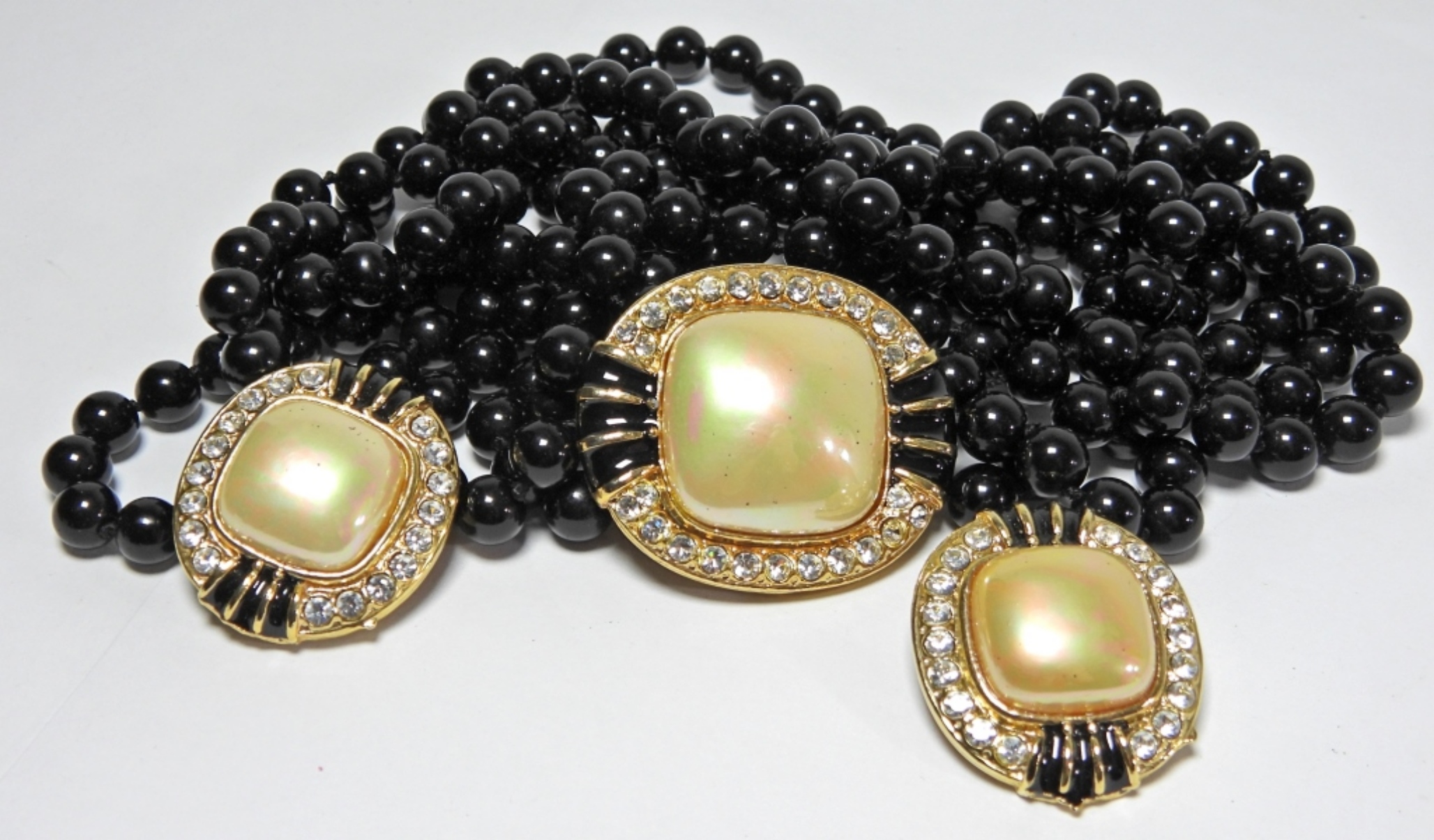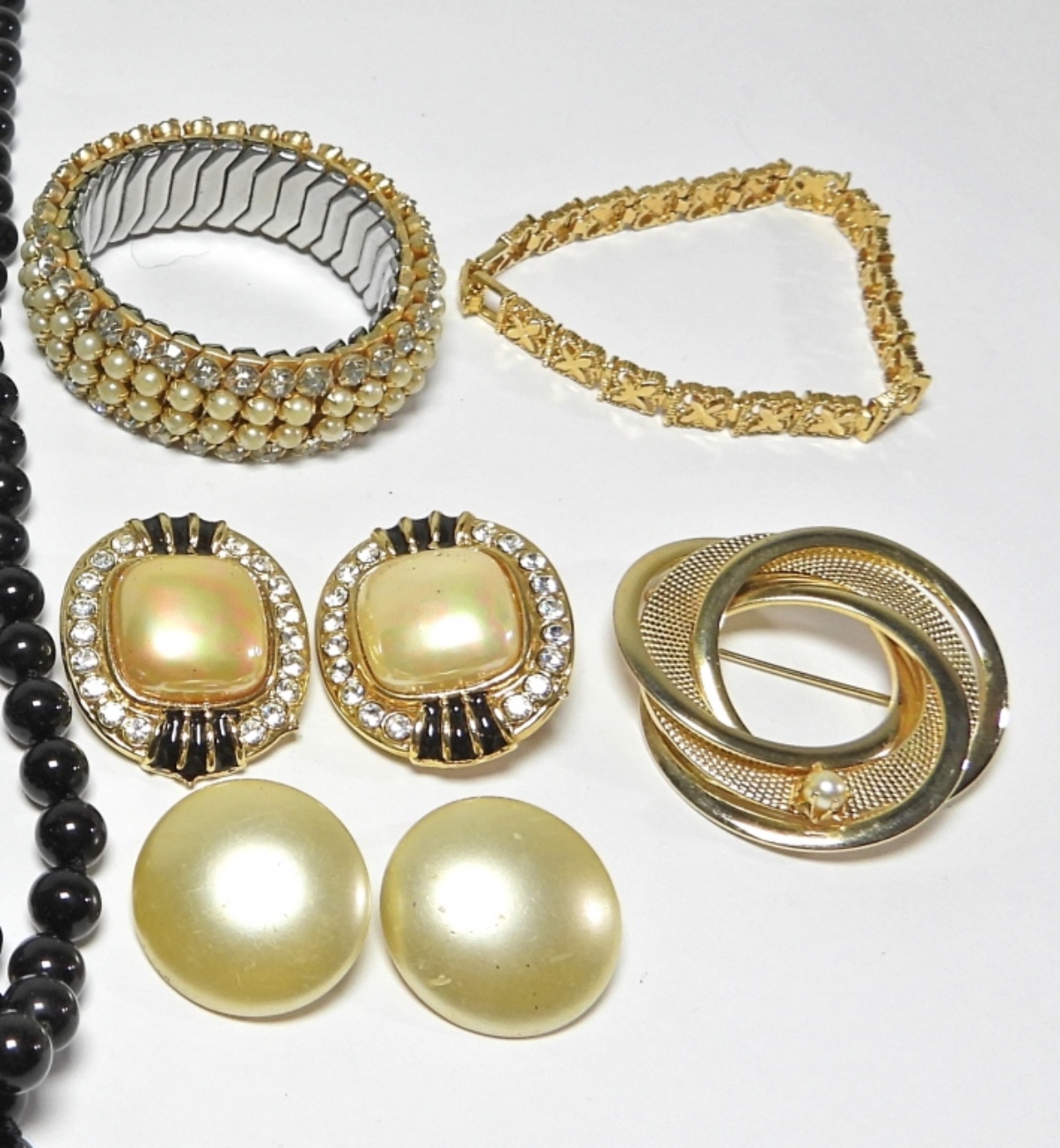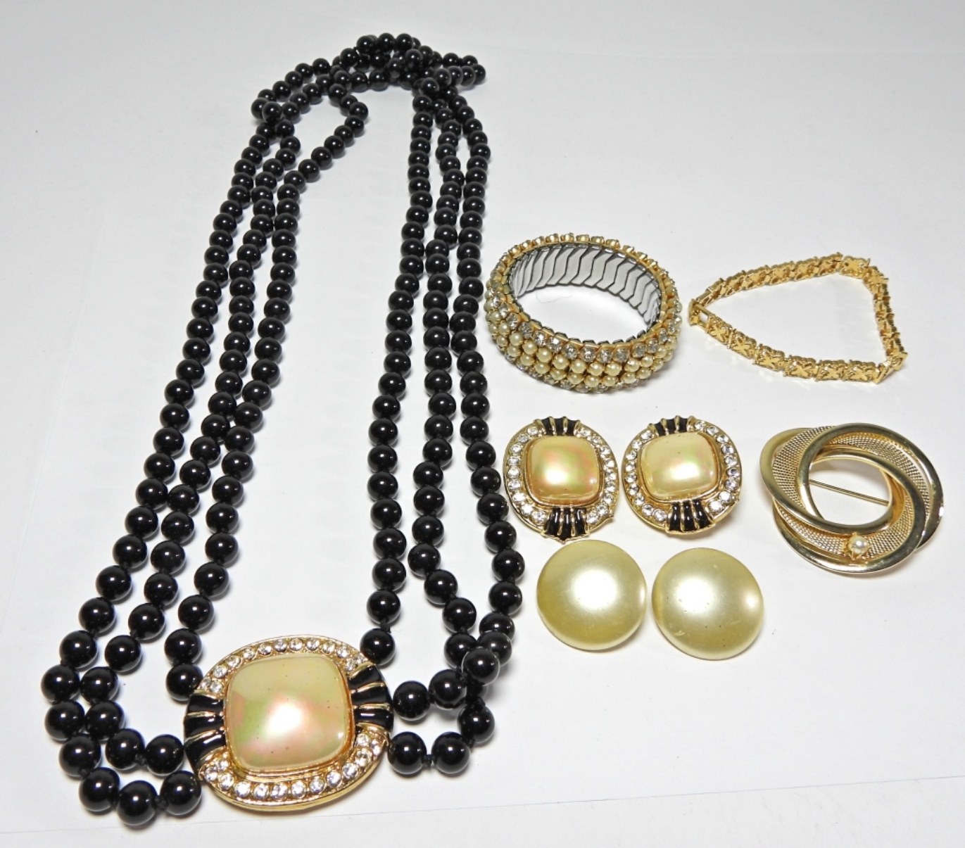 BLACK BEADED NECKLACE IS 14IN. 1 FAUX PEARL AND STONE STRETCHY BRACELET 2 PAIRS OF EARRINGS 1 GOLD TONE BRACELET 7INCH. 1 BROOCH WITH CLEAR STONE