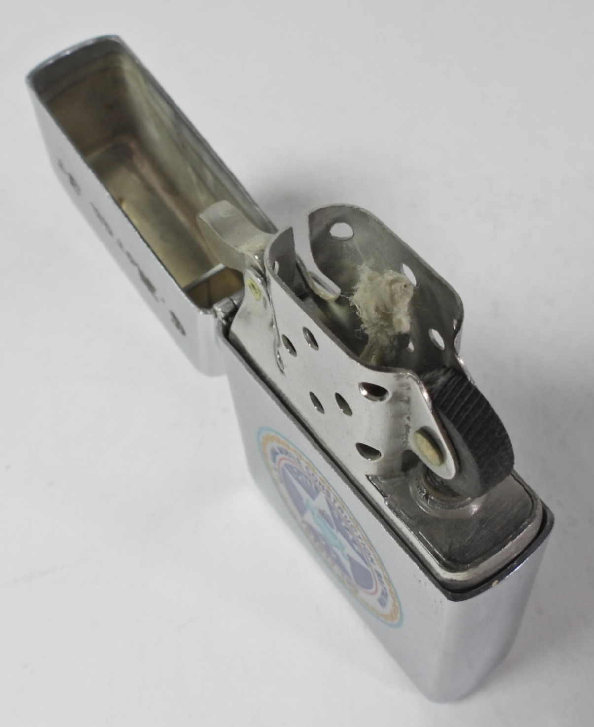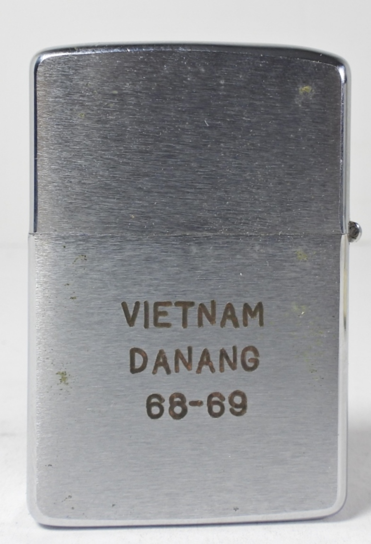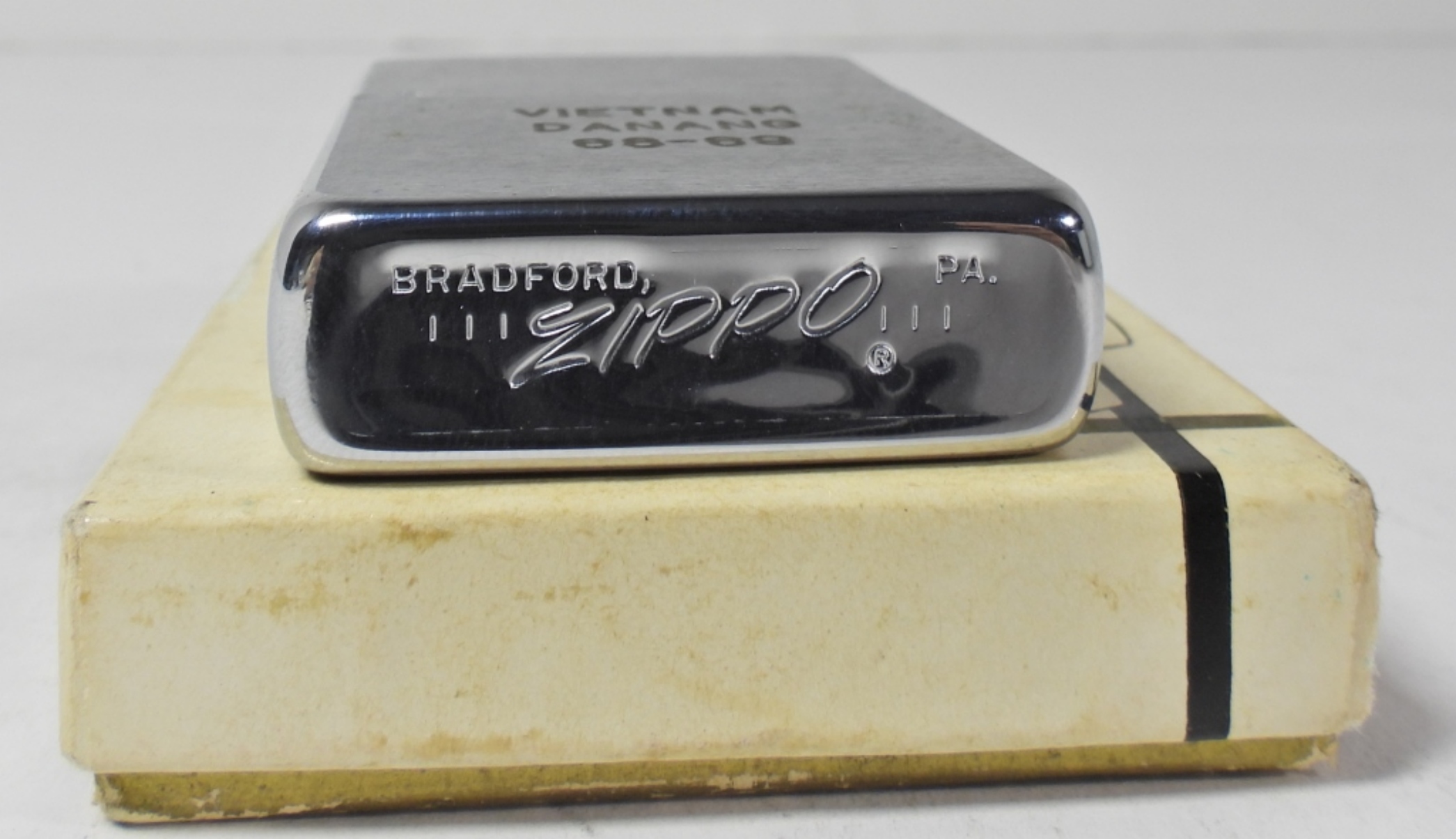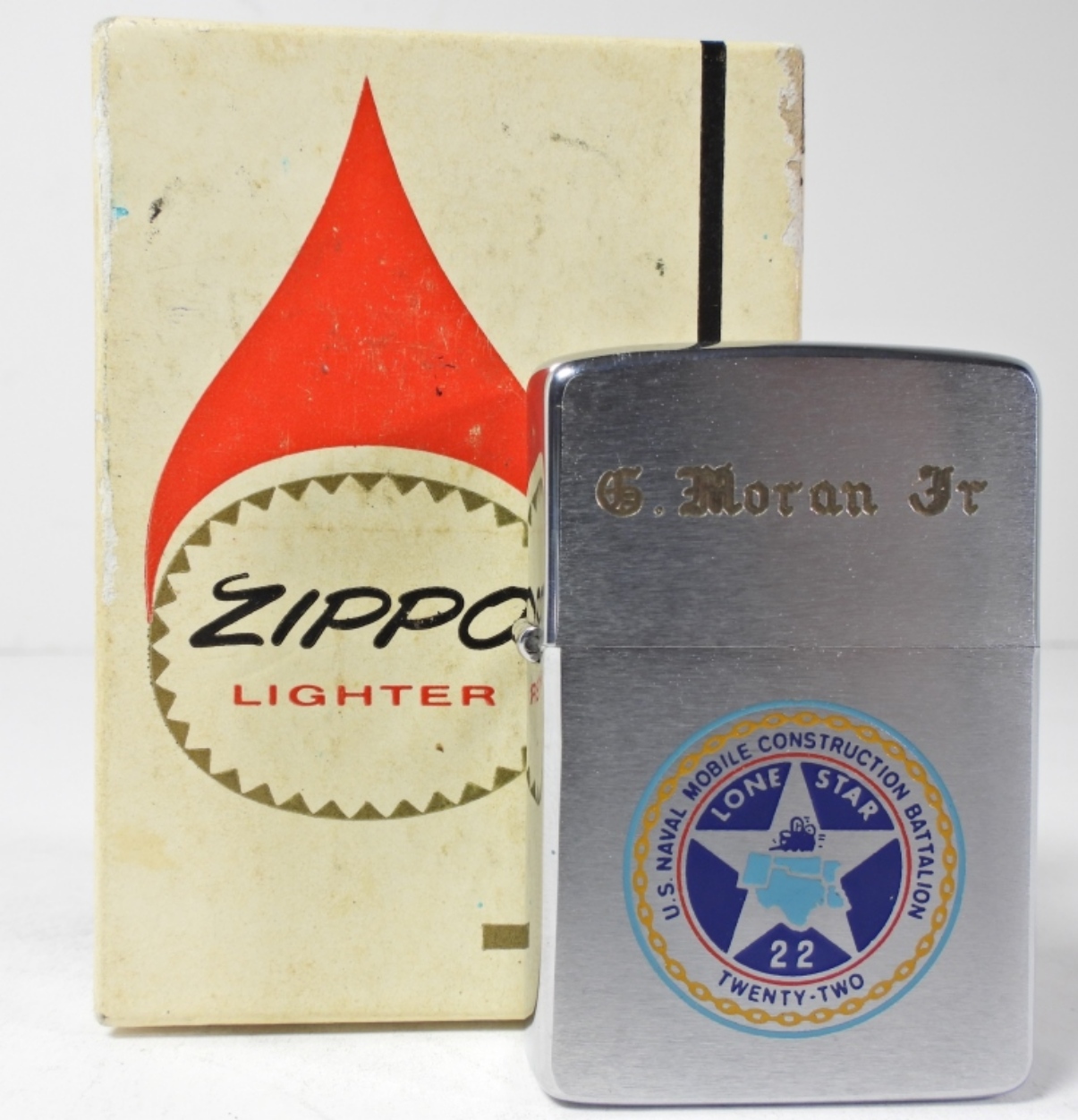 1968, UNFIRED, IN ZIPPO BOX, U.S. NAVEL MOBILE CONSTRUCTION BATTALION 22 LOGO ON THE FRONT AND ENGRAVED “G. MORAN JR”, AND ON THE BACK VIETNAM DANANG 68-69