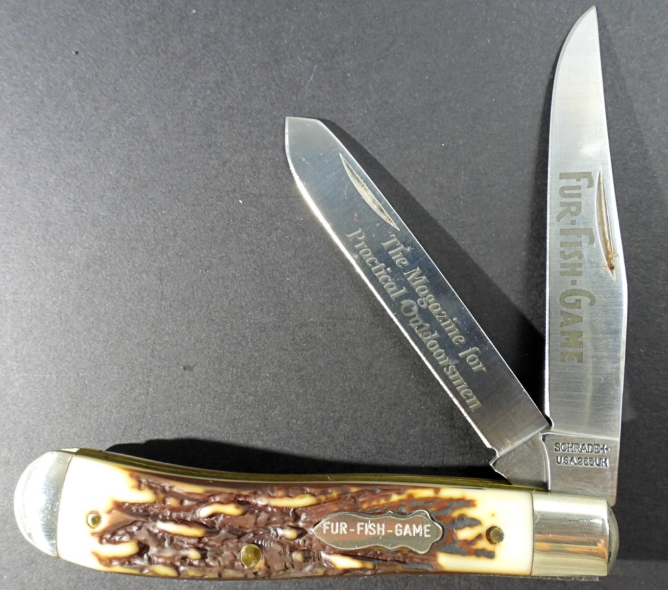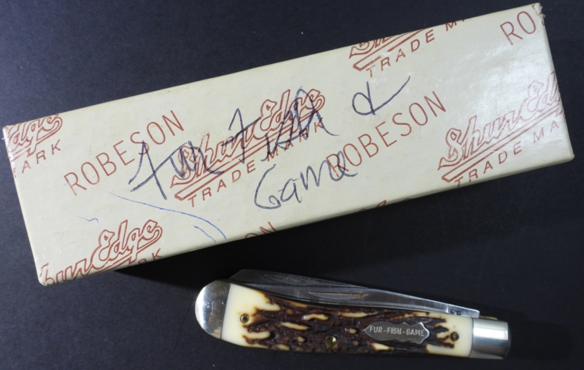 ORIGINAL BOX DOUBLE BLADE GOOD CONDITION WITH FUR FISH AND GAME ON THE BLADE AND HANDLE