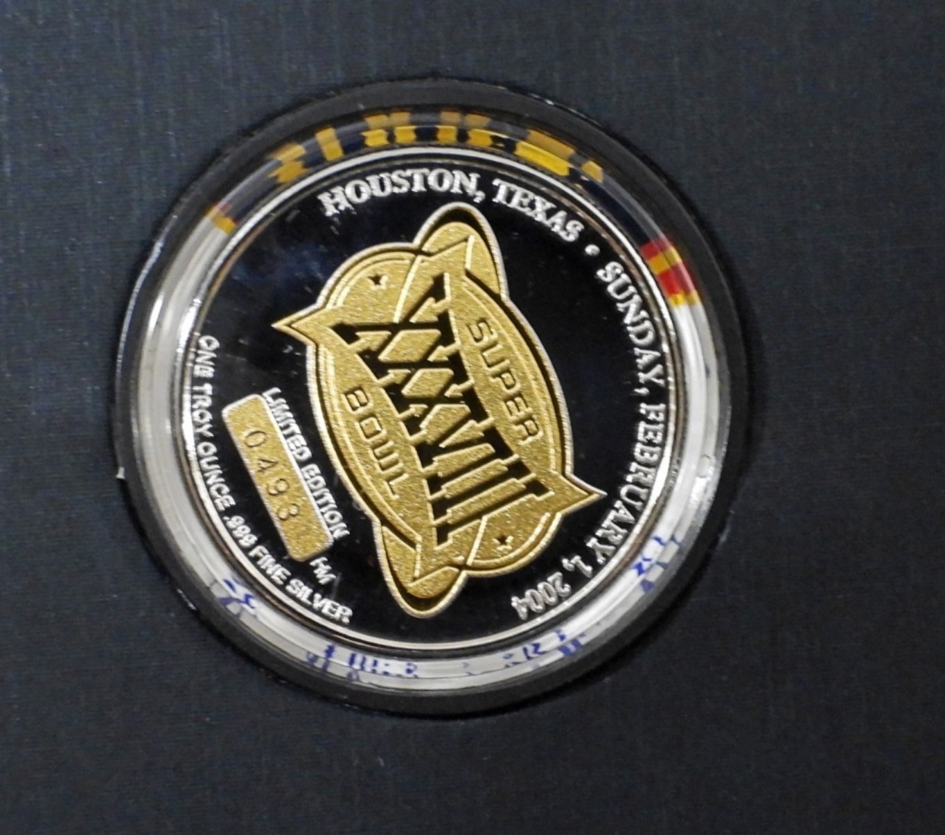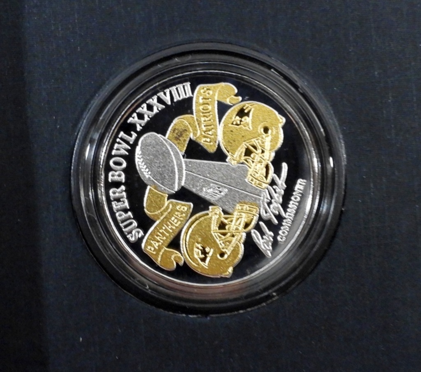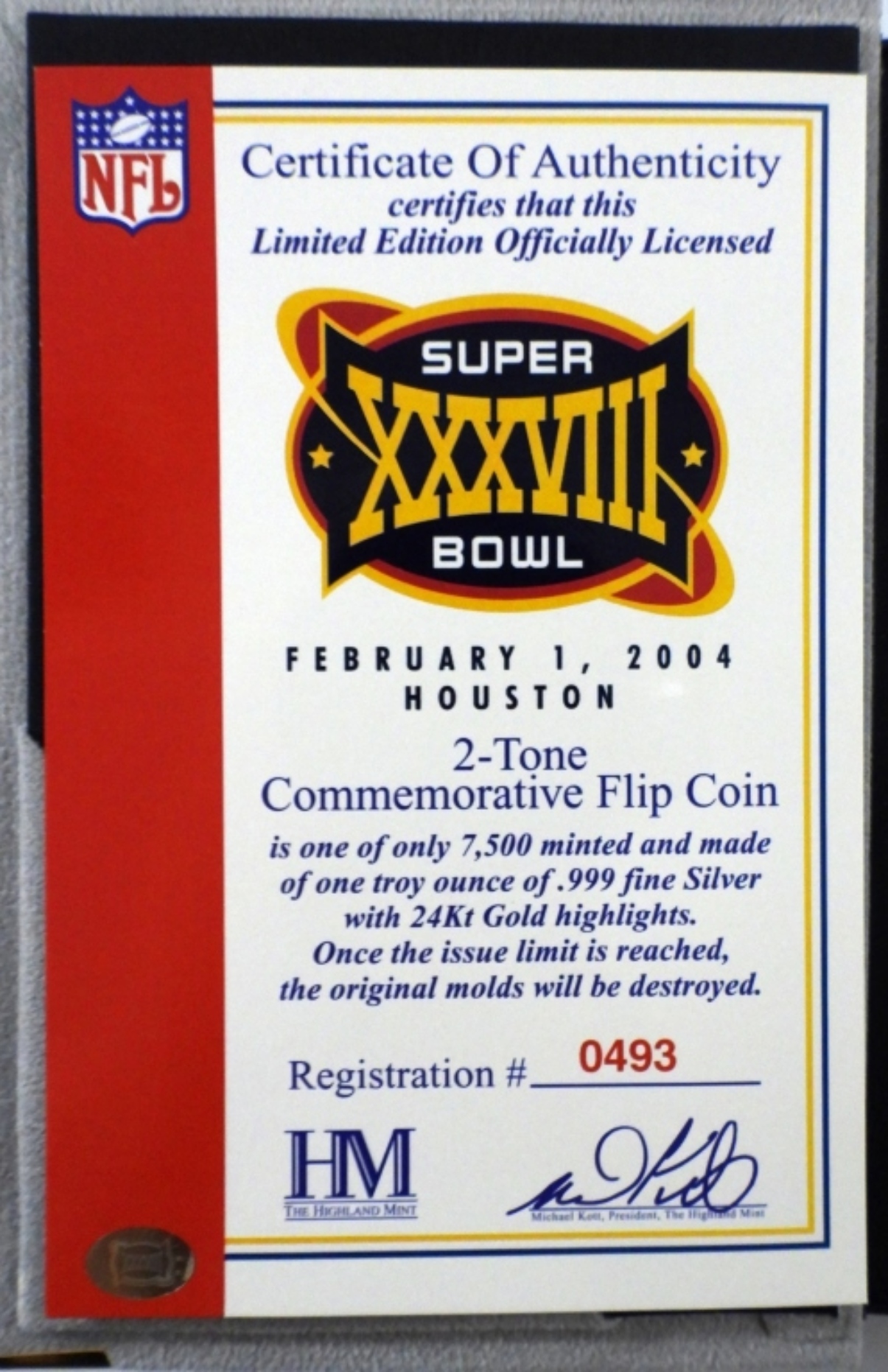 SUPER BOWL XXXVIII PANTHERS VS. PATRIOTS, FEB 1, 2004, 2-TONE COMMEMORATIVE FLIP COIN, REGISTRATION #0493, .999 SILVER WITH 24KT GOLD HIGHLIGHTS, IN CASE