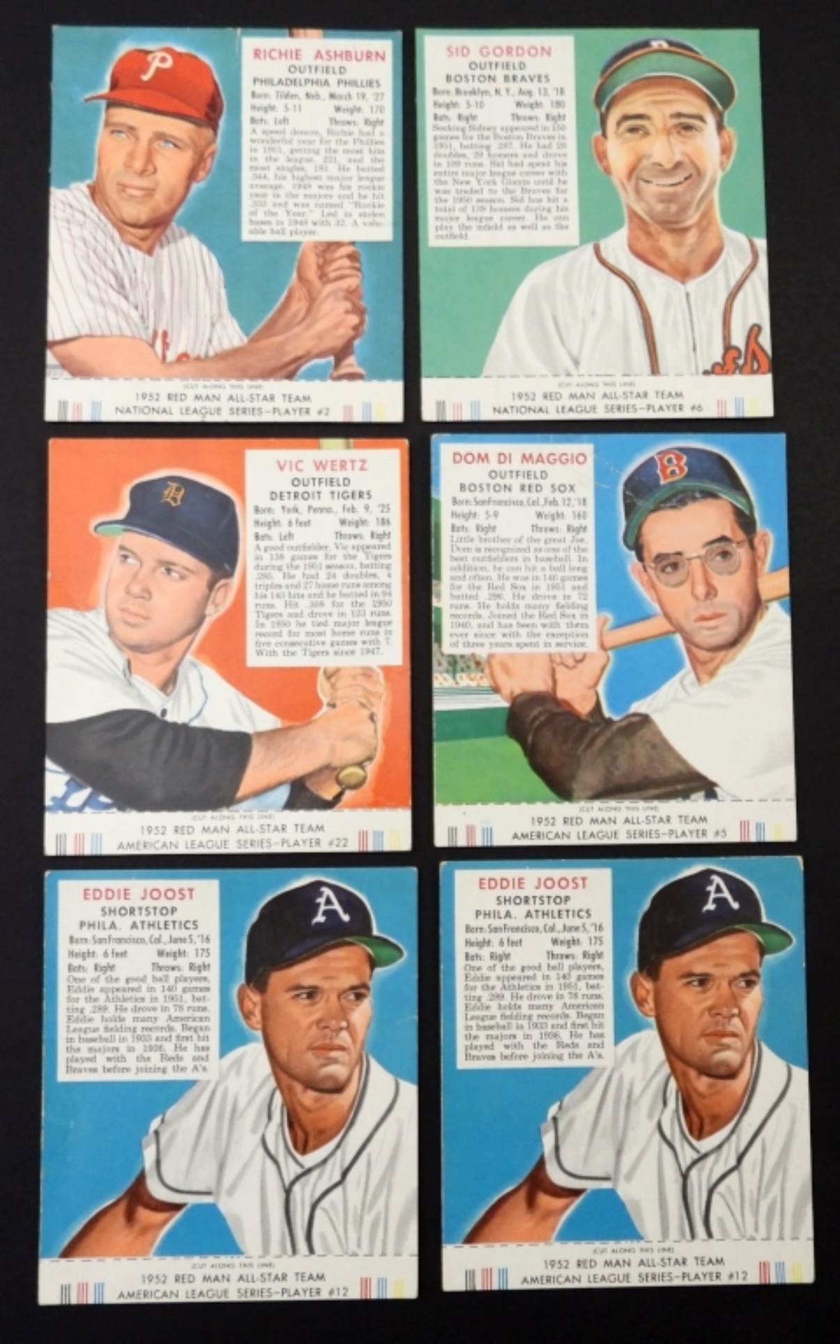 RICHIE ASHBURN, SID GORDON, EDDIE JOOST, DOM DI MAGGIO, VIC WERT, EDDIE JOOST – OVERALL VG or BETTER