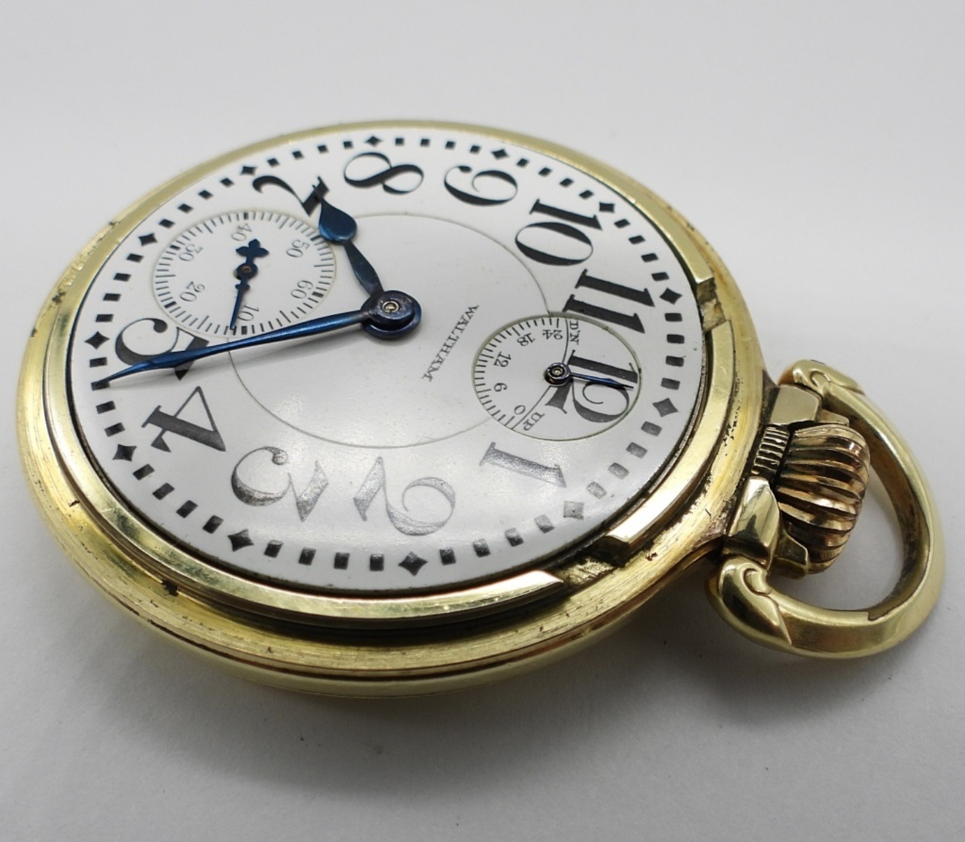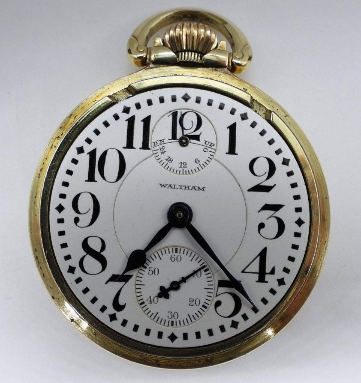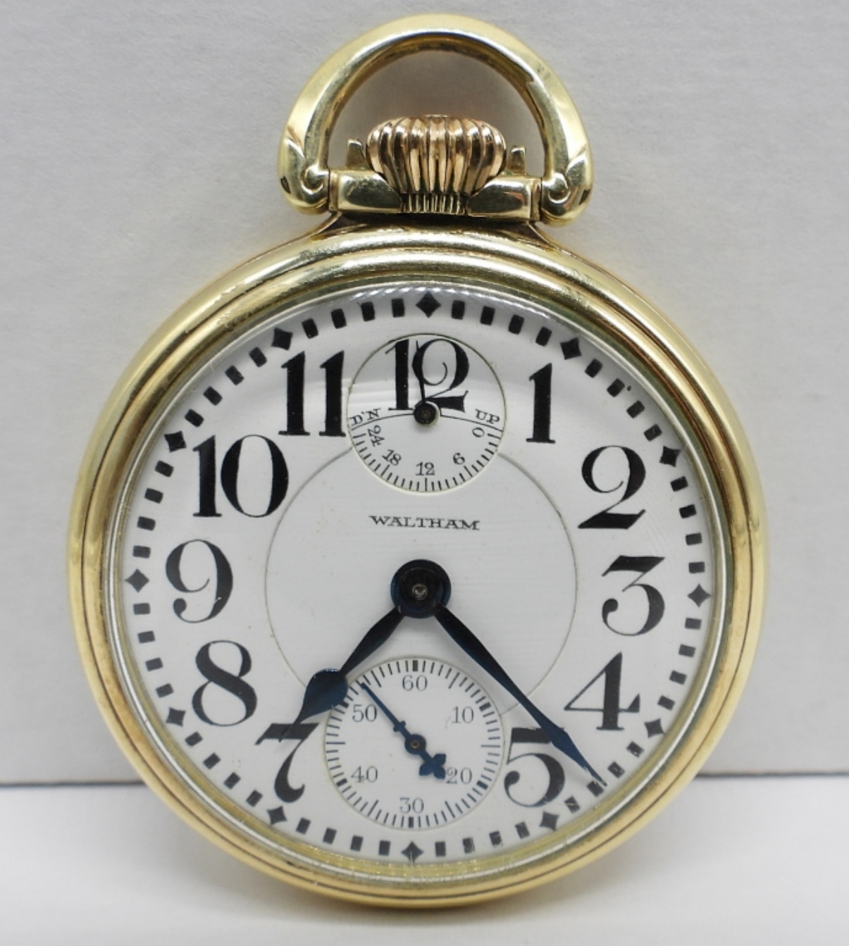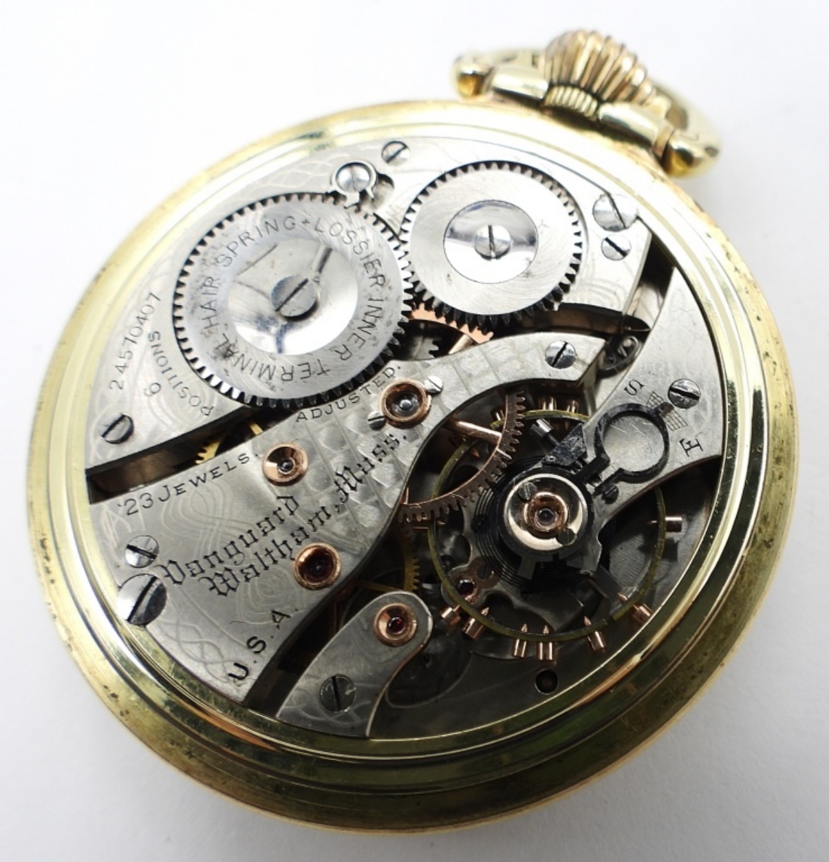 VERY NICE ORIGINAL PORCELAIN DIAL. 23 JEWEL, LEVER SET VANGUARD. YELLOW GOLD FILLED SCREWBACK CASE. MARKED WALTHAM WATCH CO *All Pocket Watches tested to be in working order at the time of listing.