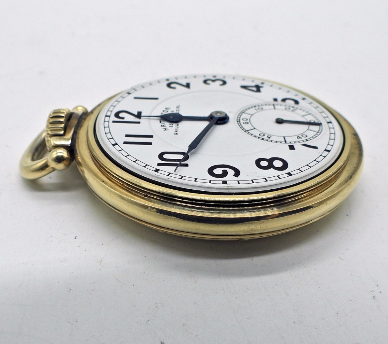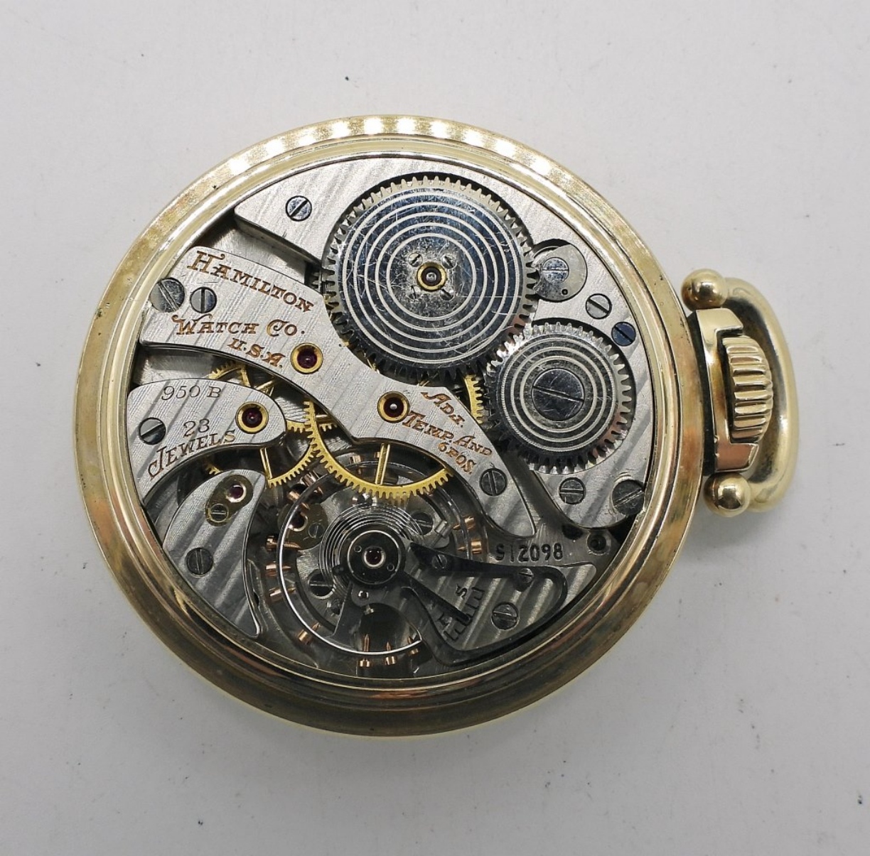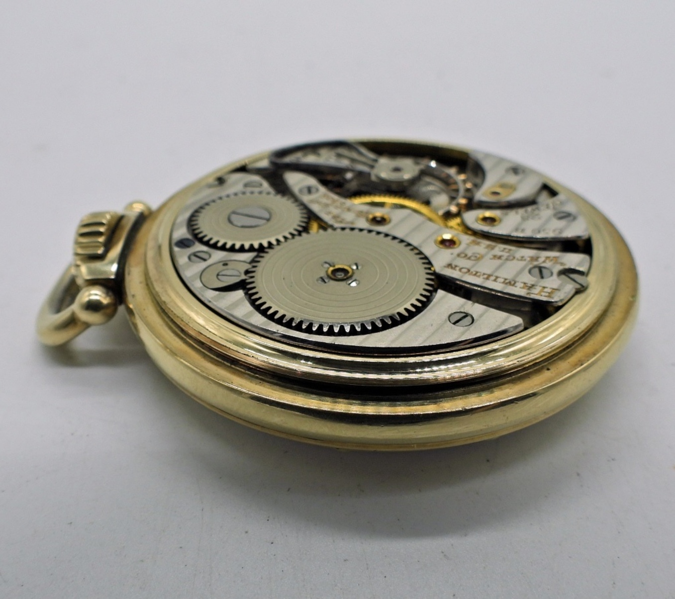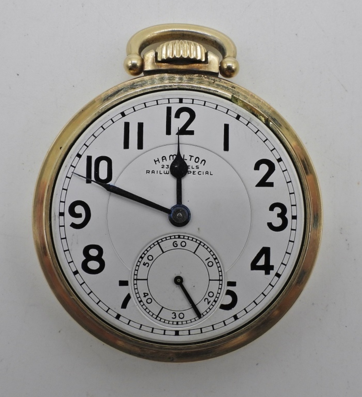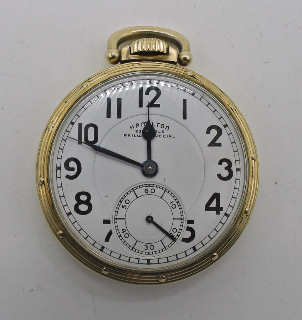NEAR PERFECT 24 HOUR, DOUBLE SUNK PORCELAIN DIAL. 23 JEWEL LEVER ET MOVEMENT. WHITE GOLD FILLED SCREWBACK BAR OVER CROWN HAMILTON CASE *All Pocket Watches tested to be in working order at the time of listing.