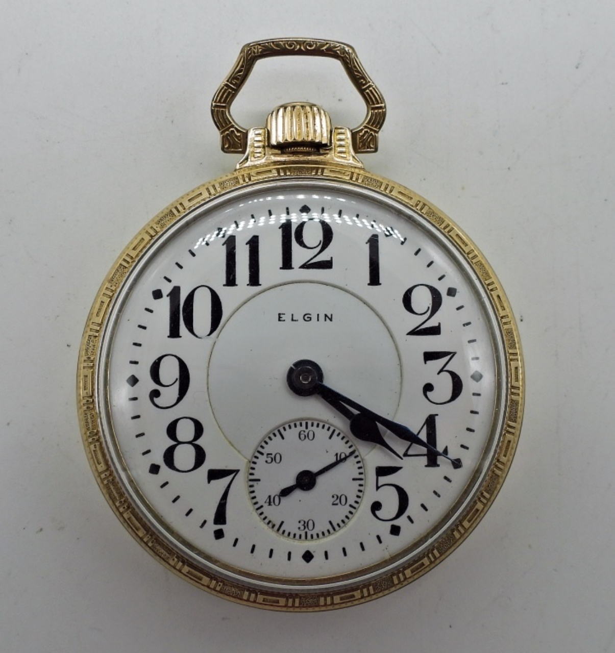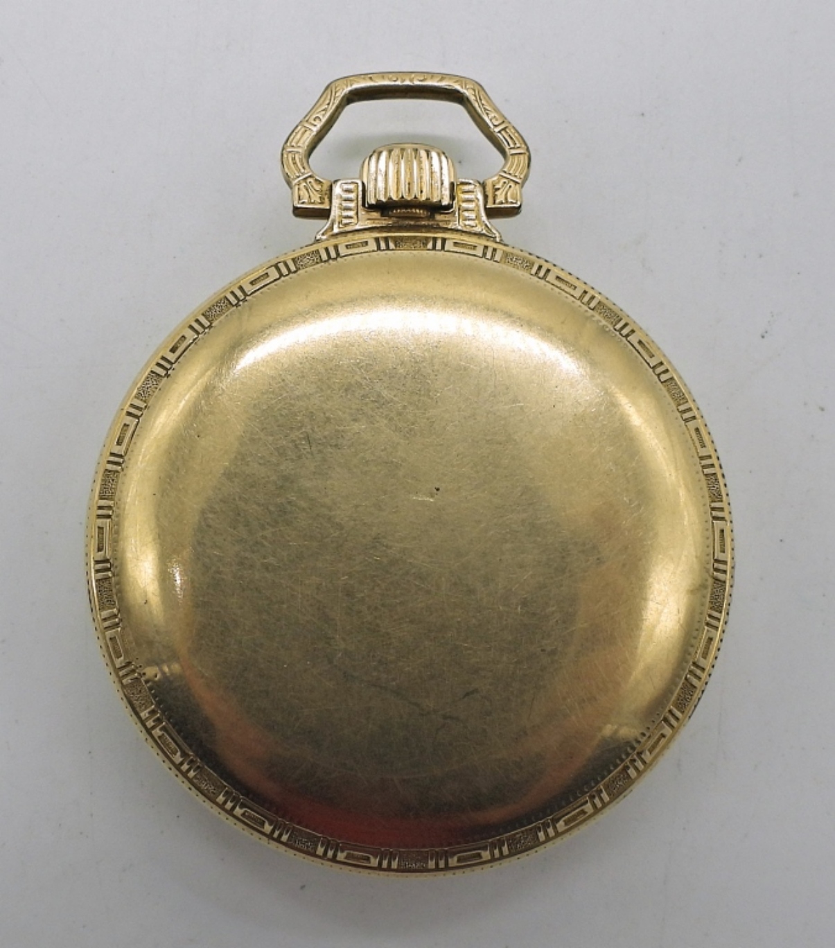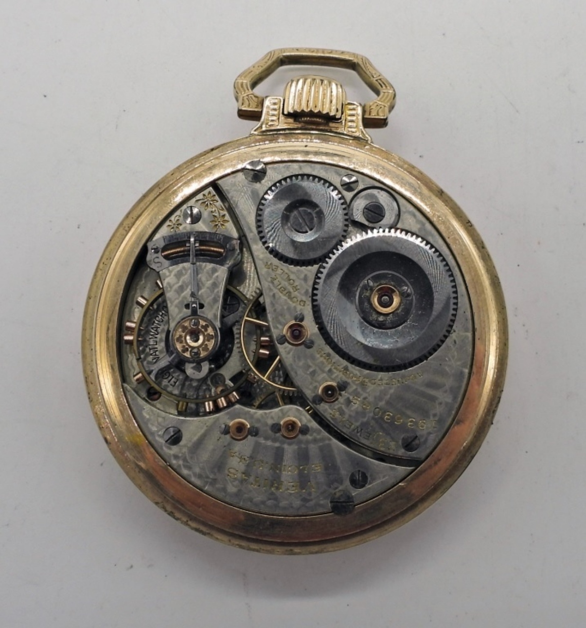 PERFECT DOUBLE SUNK PORCELAIN DIAL. 23 JEWEL, GRADE 376 VARITAS MOVEMENT. YELLOW GOLD FILLED SCREWBACK CASE MARKED “RR” *All Pocket Watches tested to be in working order at the time of listing.