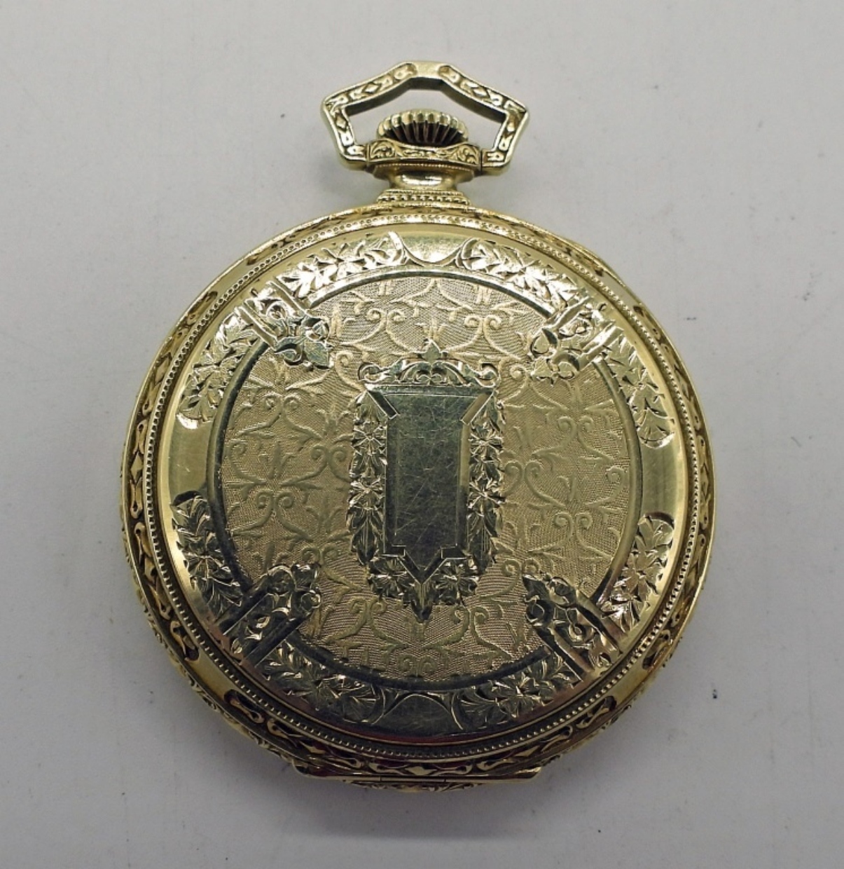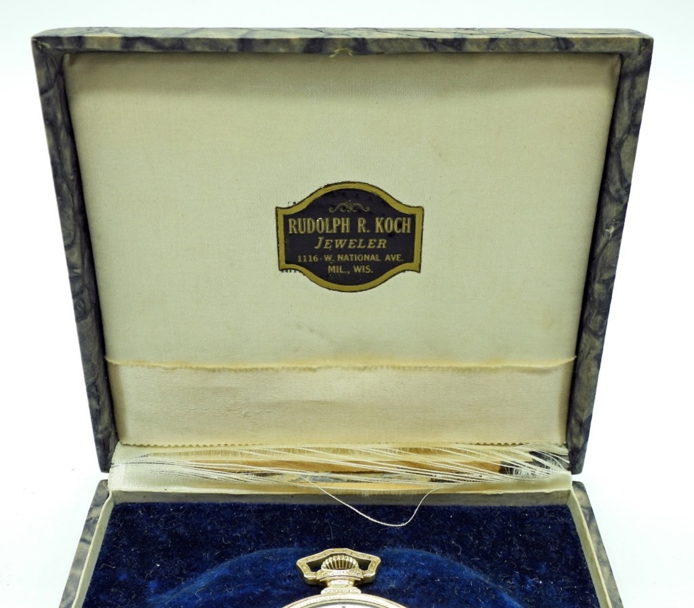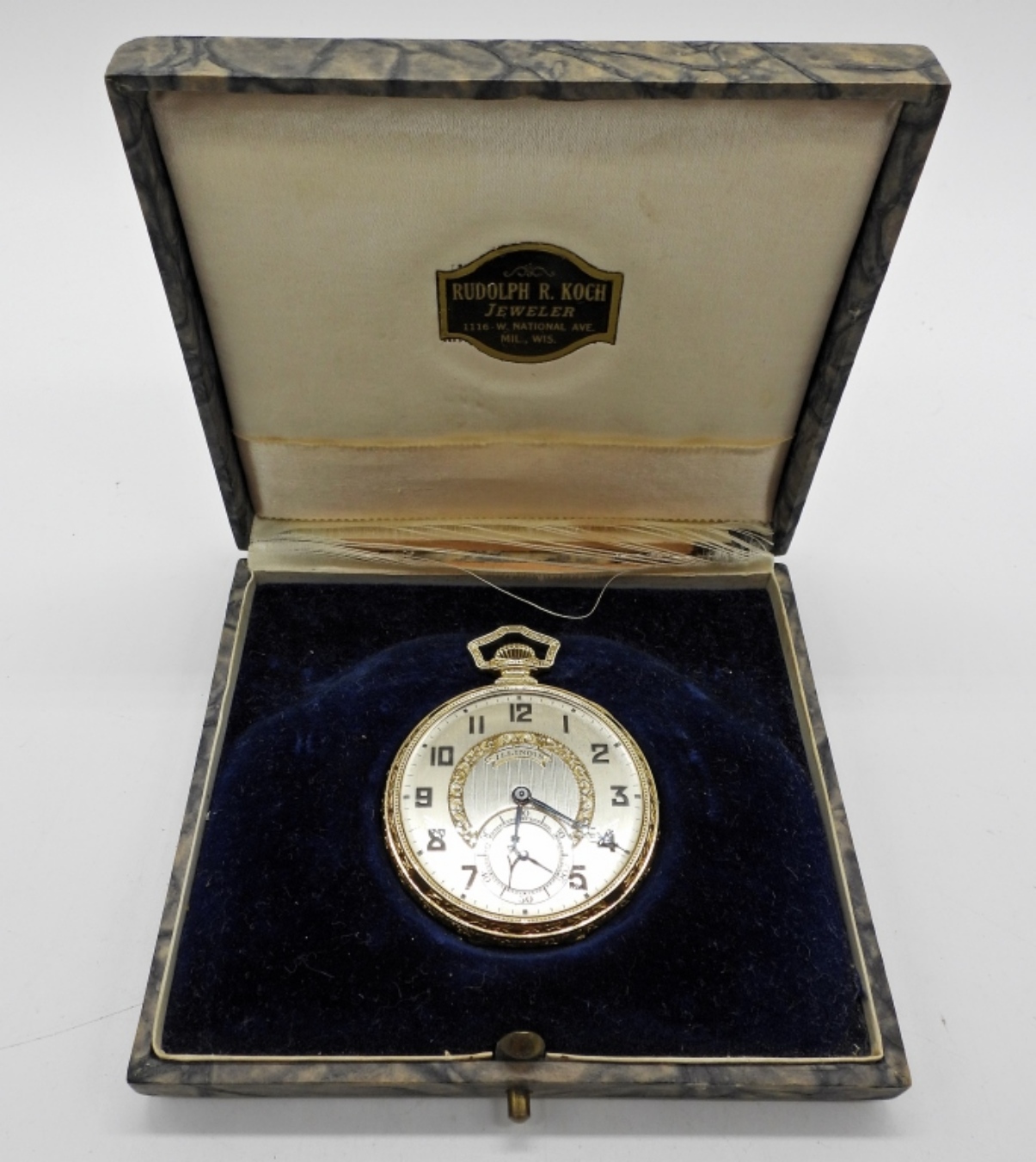 NEAR PERFECT TUTONE PAINTED DIAL. 21 JEWEL STEM SET MOVEMENT. HIGHLY ENGRAVED GREEN GOLD FILLED HINGED BACK CASE. COMPLETE WITH FITTED BOX FROM MILWAUKEE, WI. *All Pocket Watches tested to be in working order at the