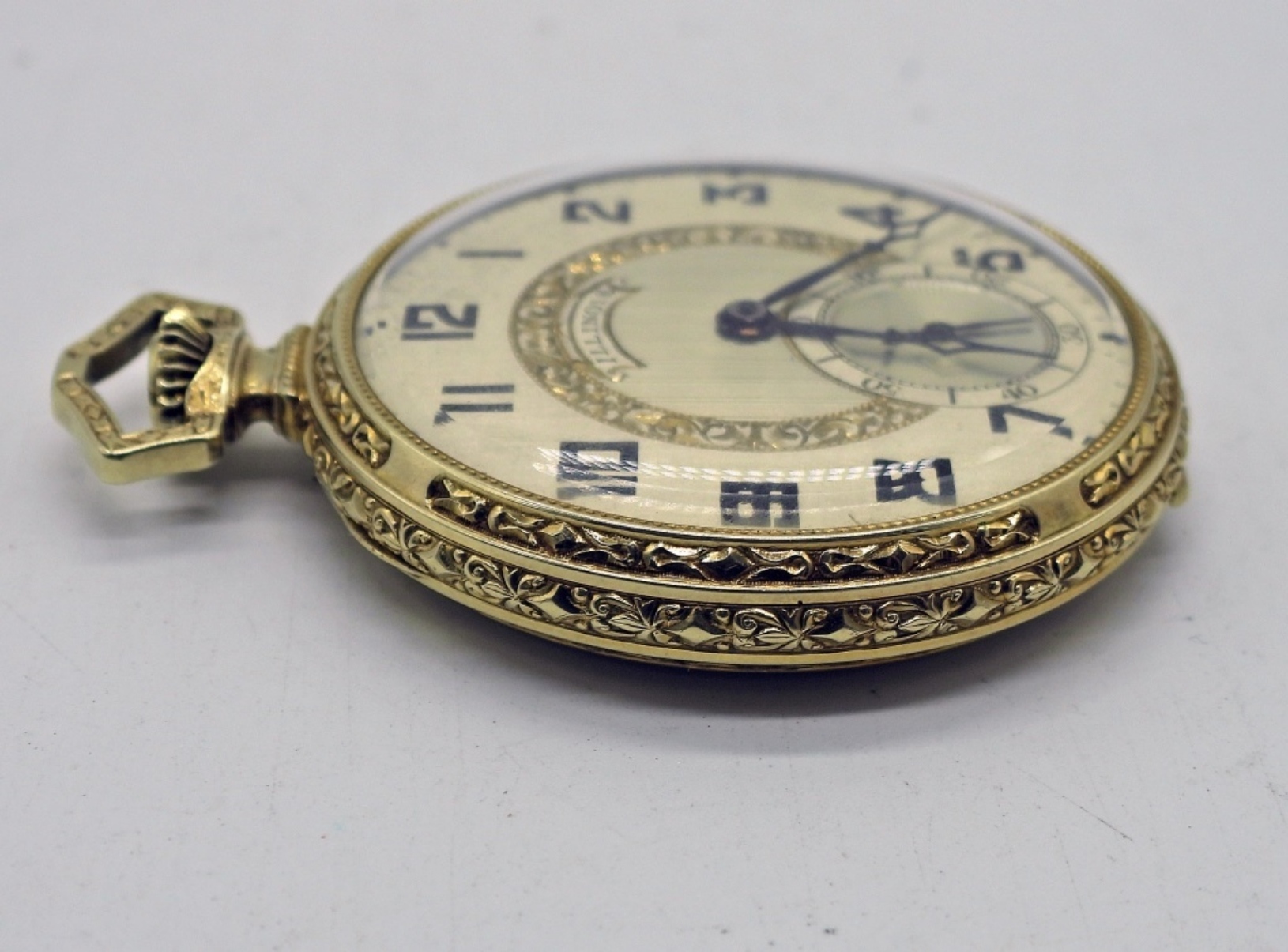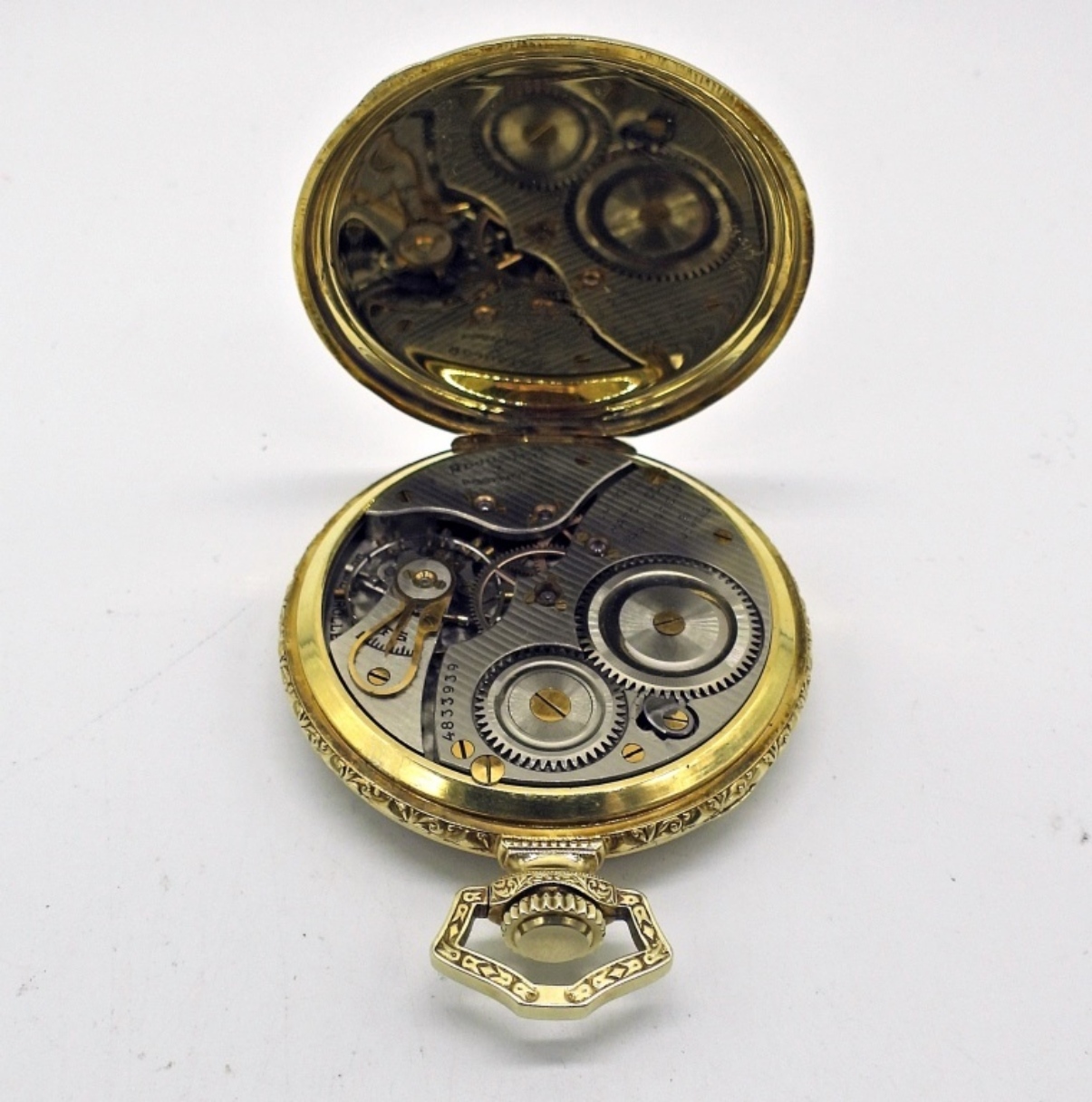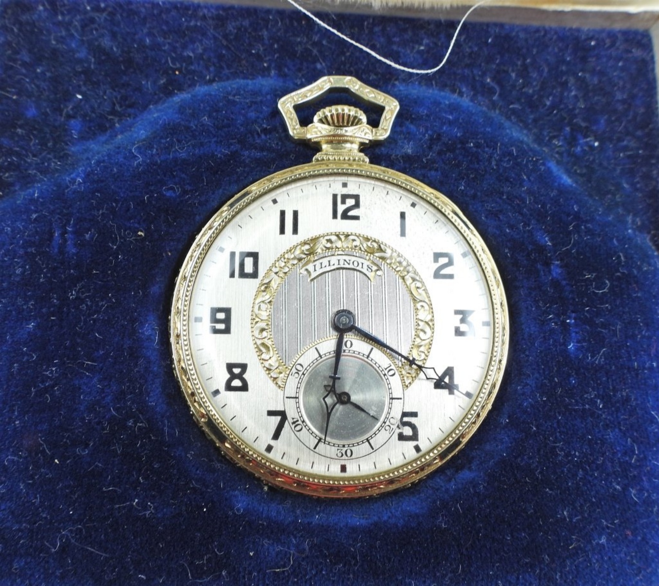 NEAR PERFECT TUTONE PAINTED DIAL. 21 JEWEL STEM SET MOVEMENT. HIGHLY ENGRAVED GREEN GOLD FILLED HINGED BACK CASE. COMPLETE WITH FITTED BOX FROM MILWAUKEE, WI. *All Pocket Watches tested to be in working order at the